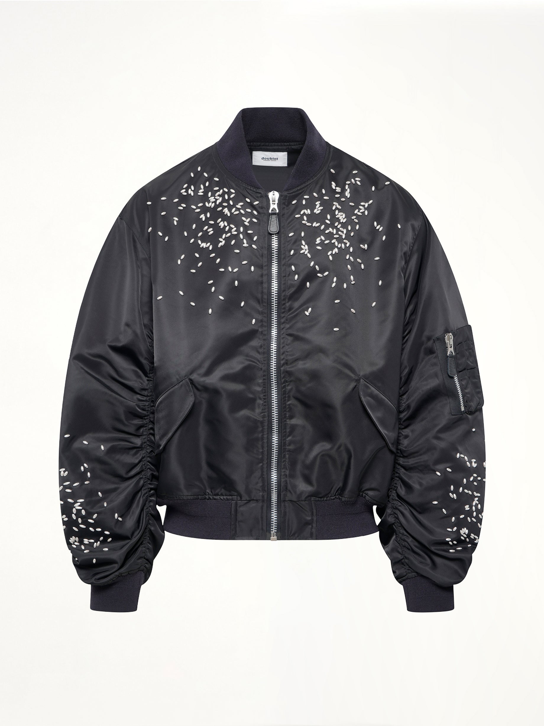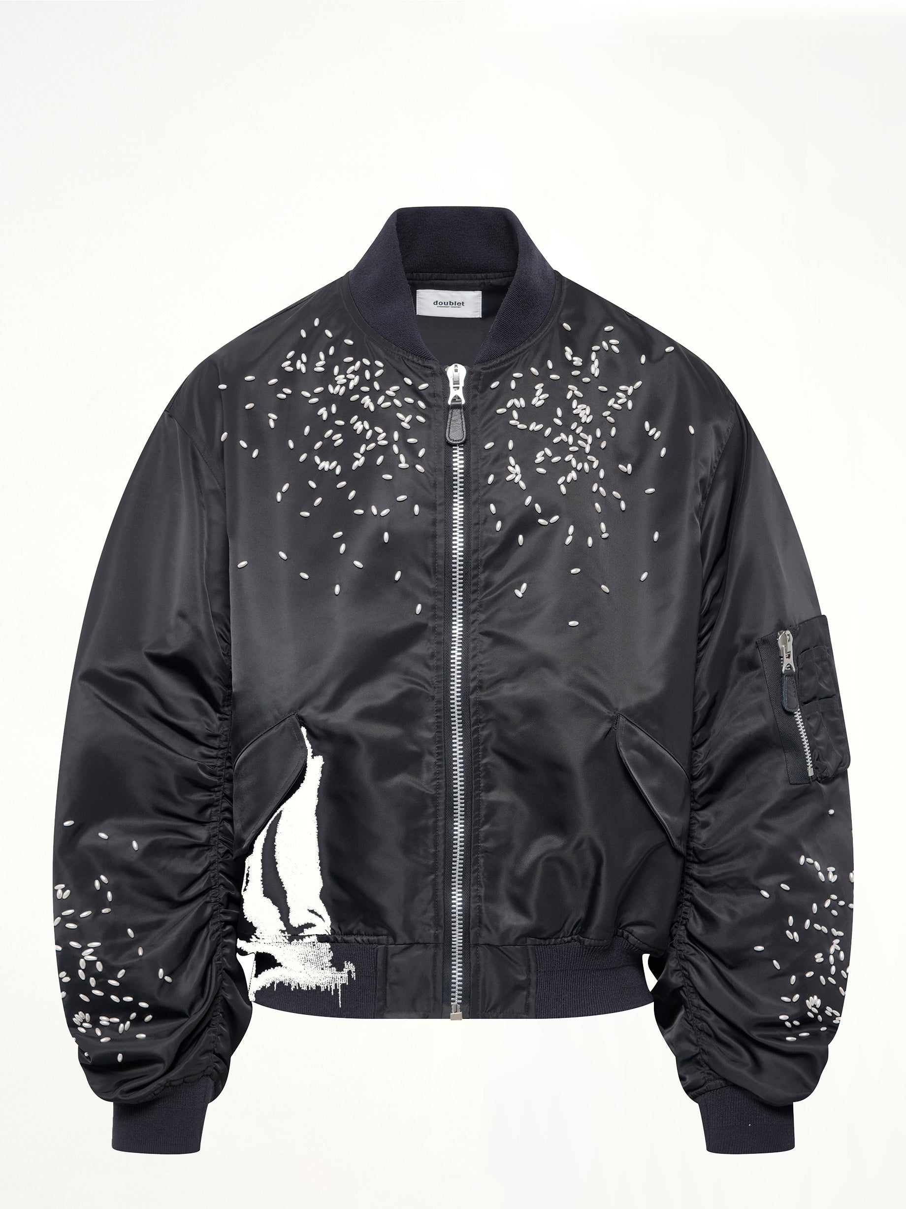 Doublet's Spilled Rice Bomber Jacket in Black is a unique and eye-catching piece that combines contemporary style with playful design elements. This jacket features a distinctive spilled rice pattern that adds a touch of whimsy to any outfit.