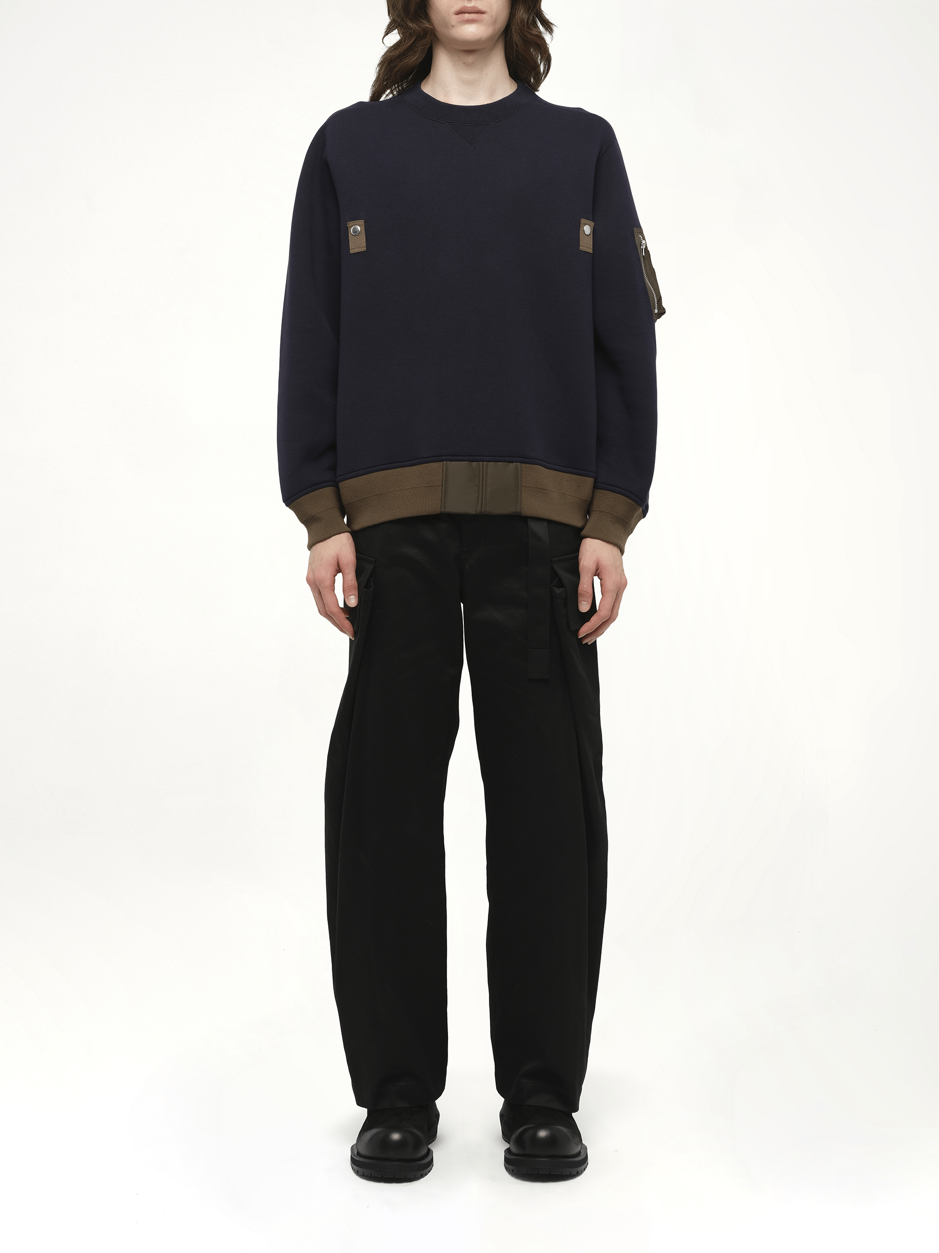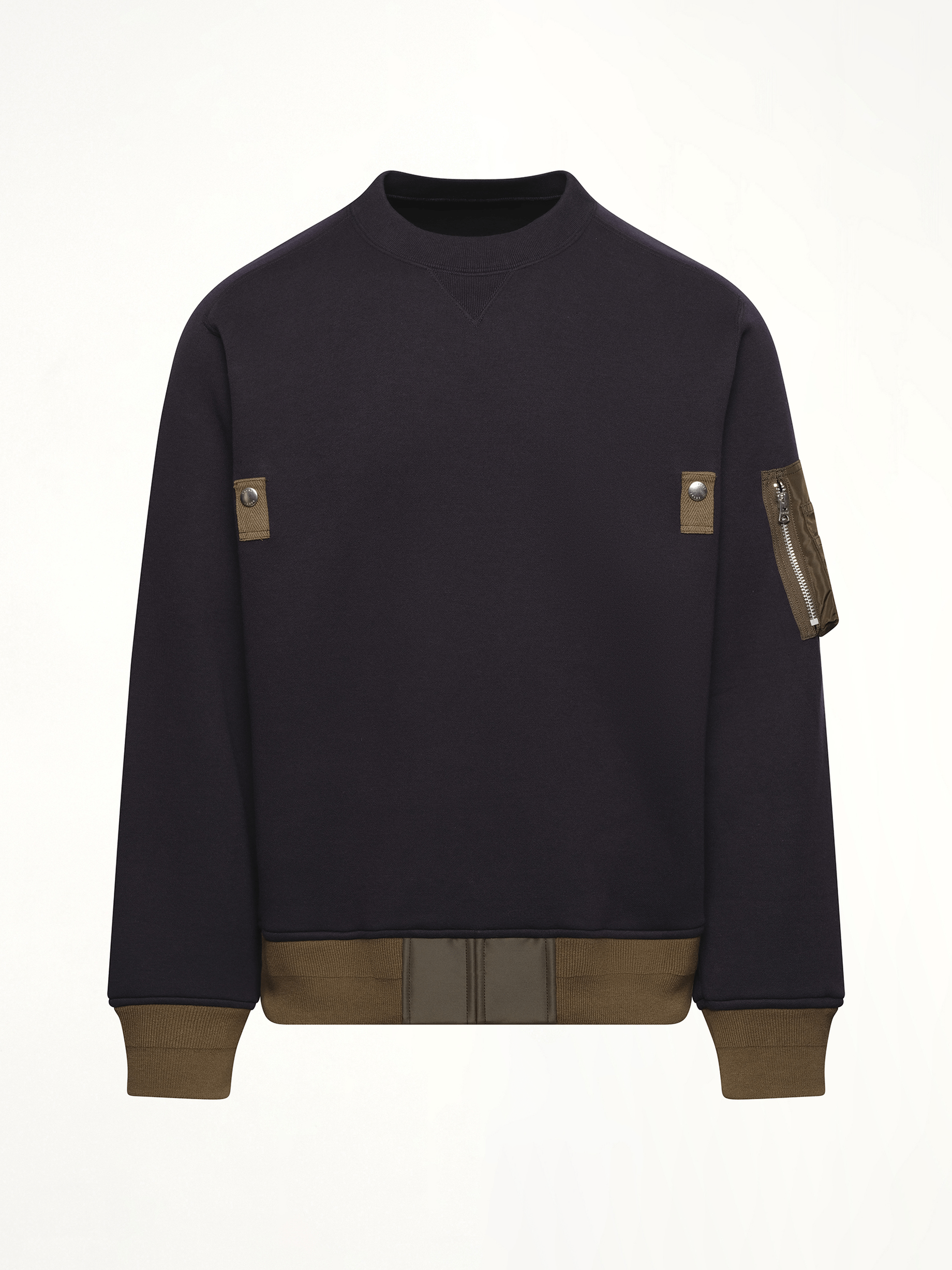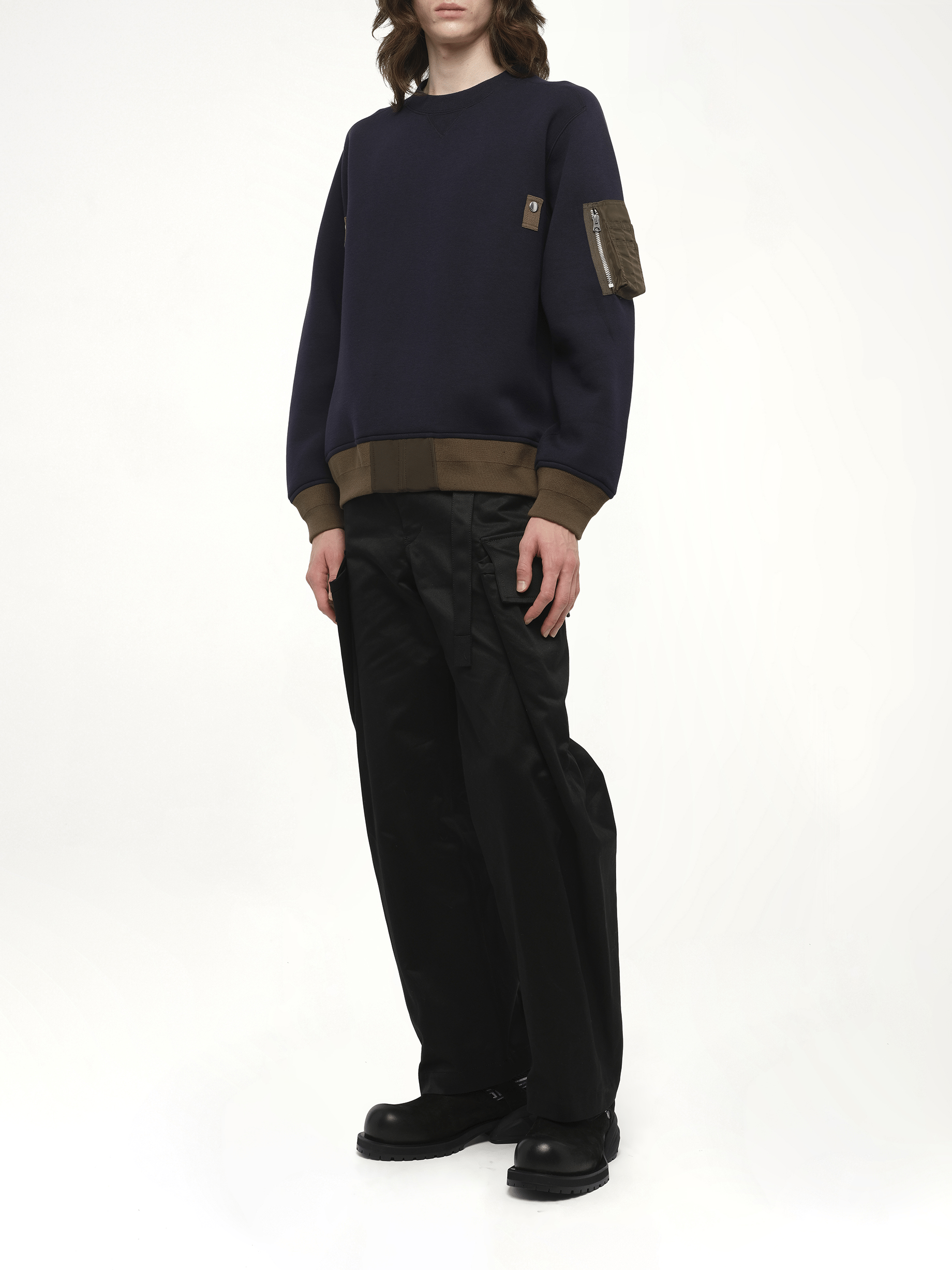 SACAI's Sponge Sweat Pullover in Navy/Dark Khaki is a versatile and stylish addition to any wardrobe. This pullover combines comfort with a modern aesthetic, making it perfect for both casual and semi-formal occasions.