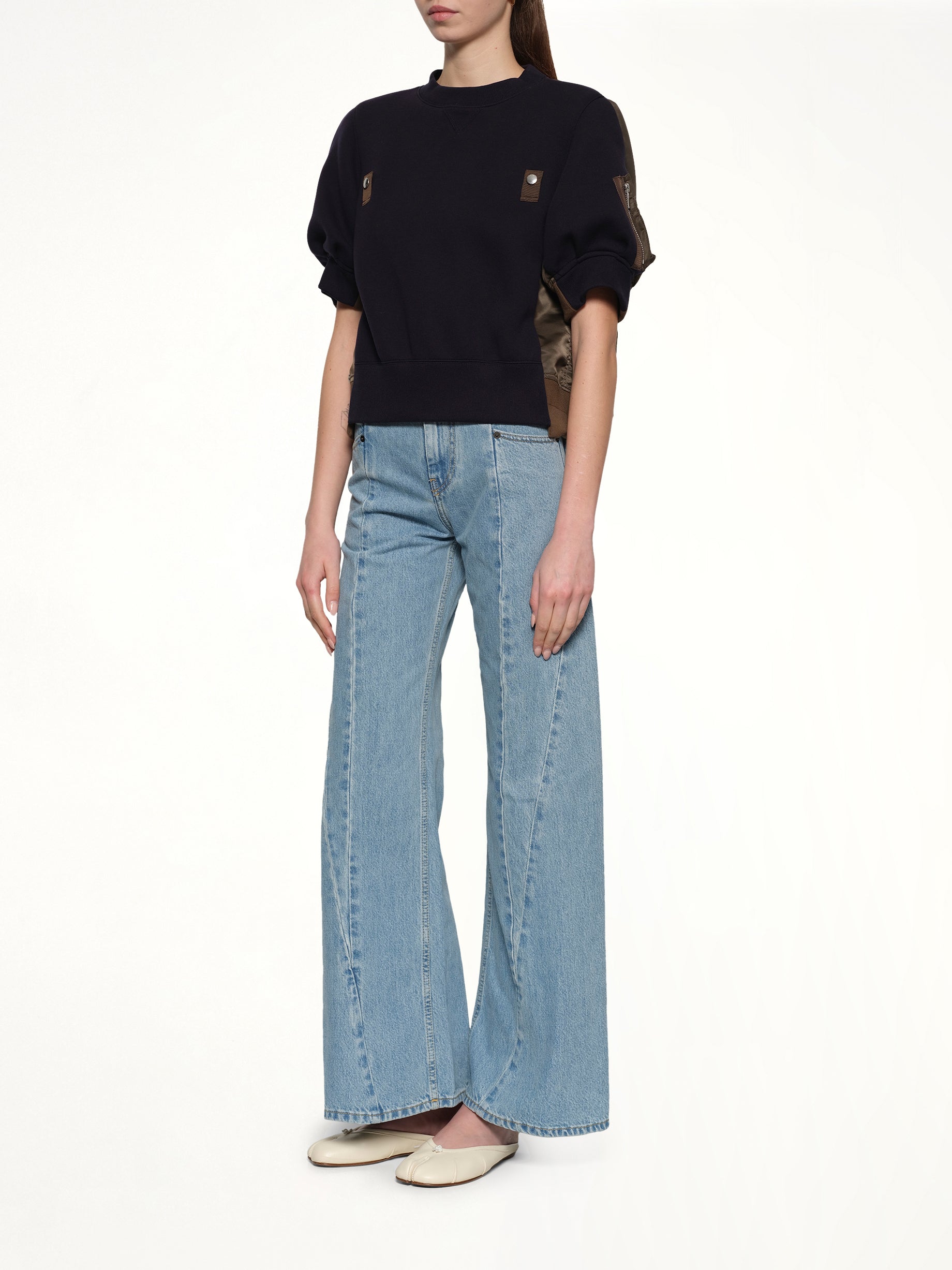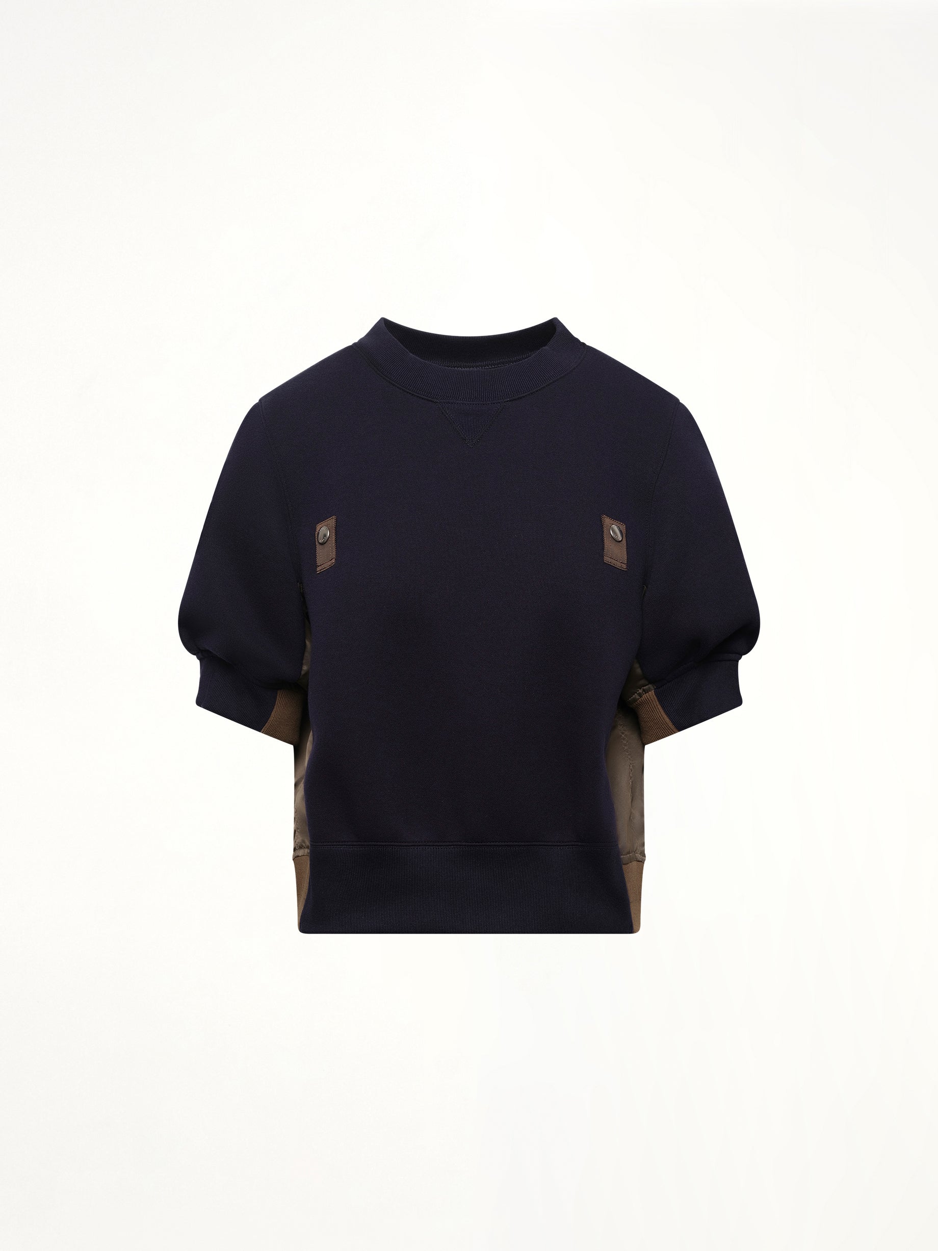 Sacai's Sponge x Nylon Twill Pullover in Navy/Dark Khaki is a versatile and stylish piece that combines comfort with a modern aesthetic. Perfect for layering, this pullover offers a unique blend of textures and colors.