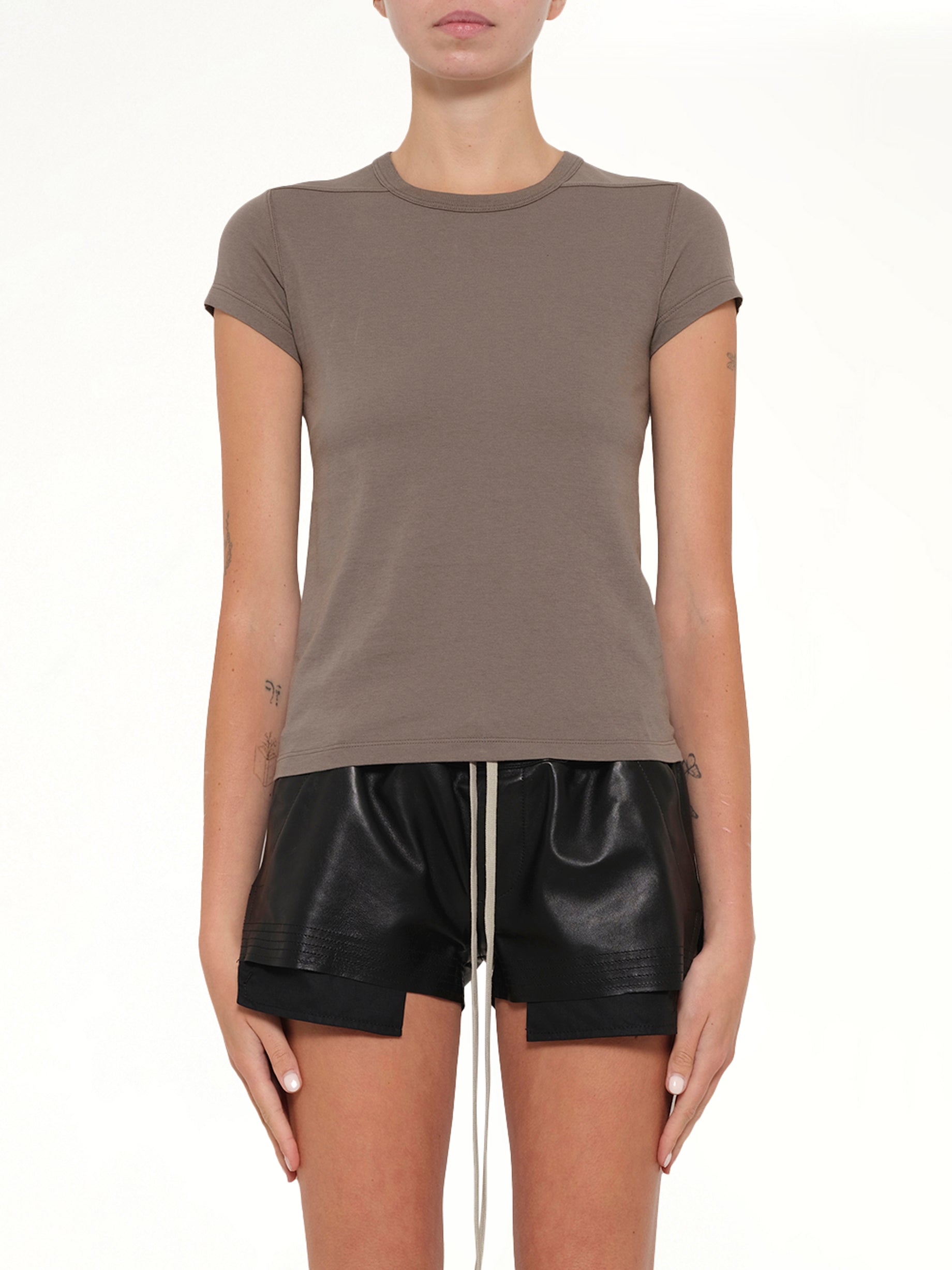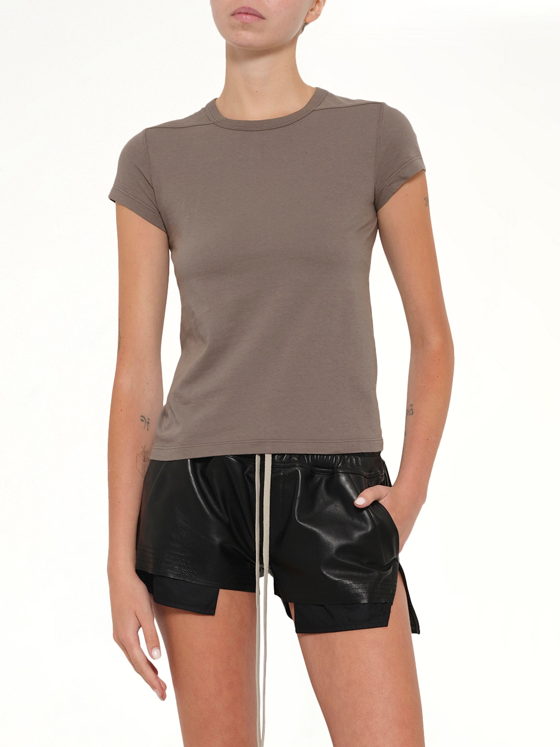 Rick Owens's Cropped Level T in Dust is a contemporary piece that combines avant-garde design with everyday wearability. This top features a unique silhouette that is both stylish and versatile, making it a standout addition to any wardrobe.
