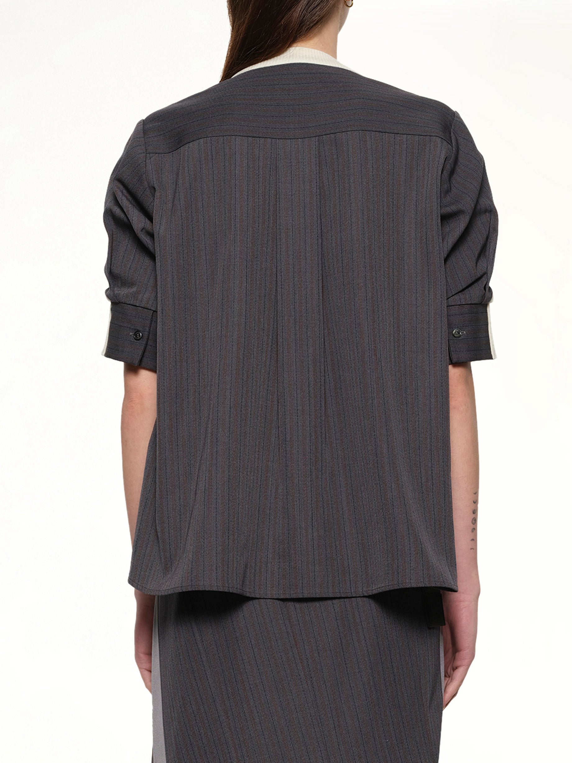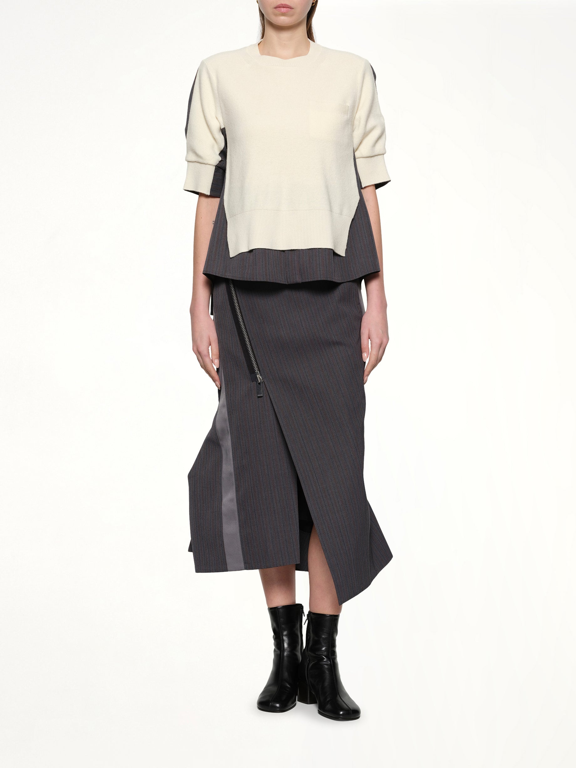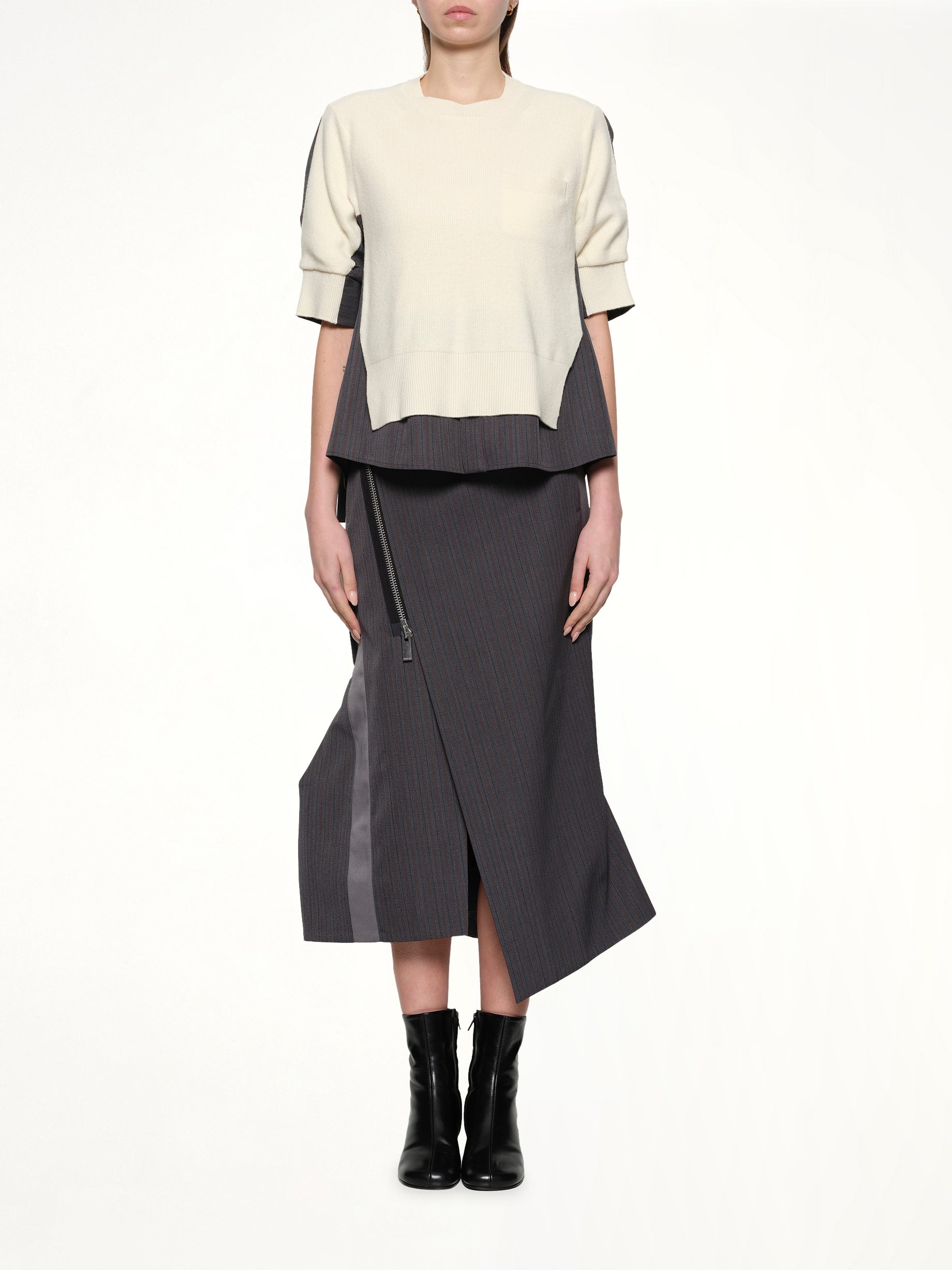 Sacai's Stripe Doeskin x Wool Knit Pullover in Off White/Gray is a sophisticated blend of textures and patterns, offering a unique style statement. This pullover combines classic design with modern flair, making it a versatile addition to any wardrobe.