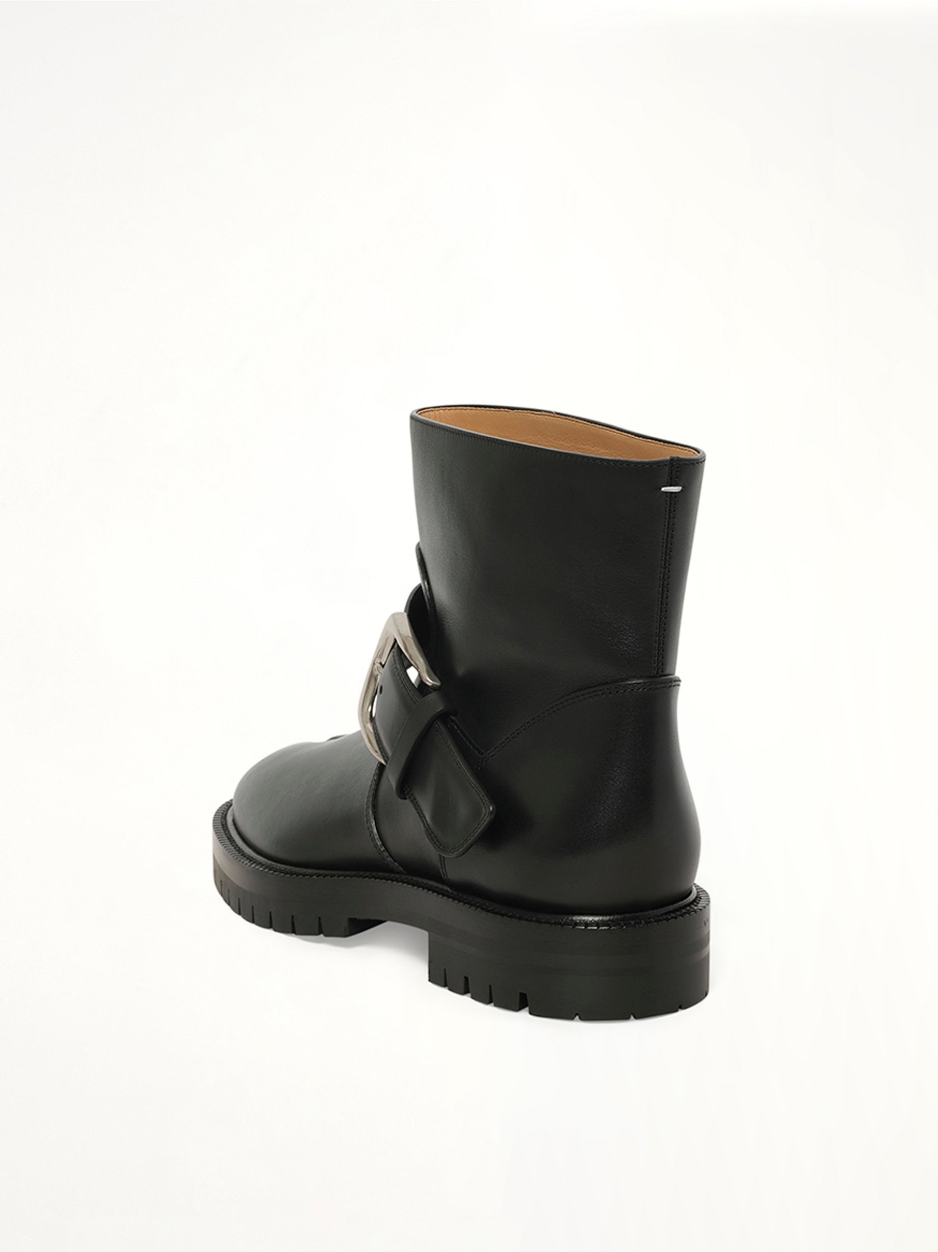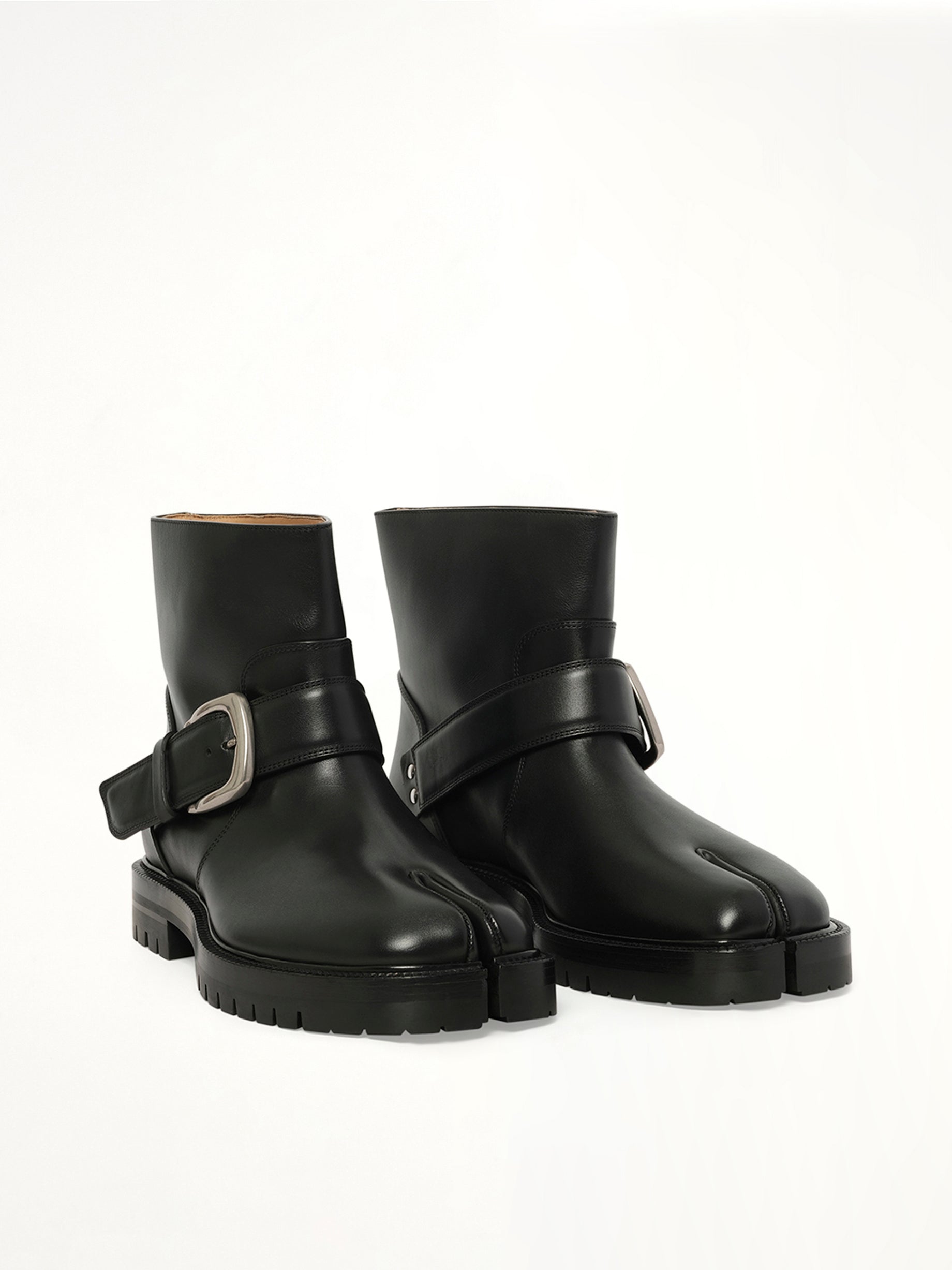 Maison Margiela's Tabi County Buckle Ankle Boots in Black is a unique blend of avant-garde design and classic elegance. These boots feature the iconic split-toe design, offering a bold statement for any fashion-forward wardrobe.