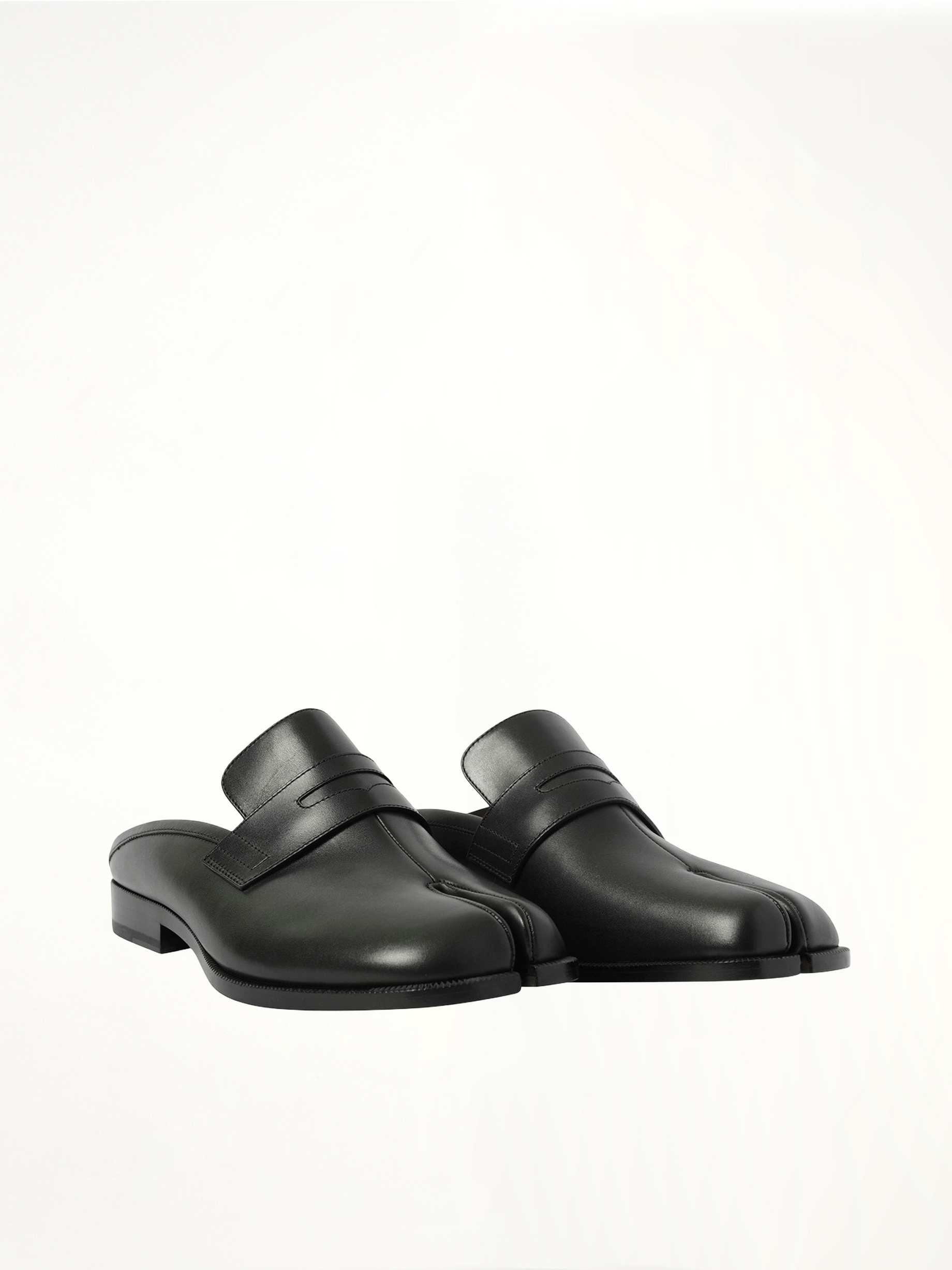 Expertly crafted with sleek black leather, our Tabi Loafer Mules offer a sophisticated and versatile addition to any wardrobe. With a unique mule design and traditional loafer detailing, these shoes provide a comfortable fit and statement style. A must-have for the fashion-forward individual.