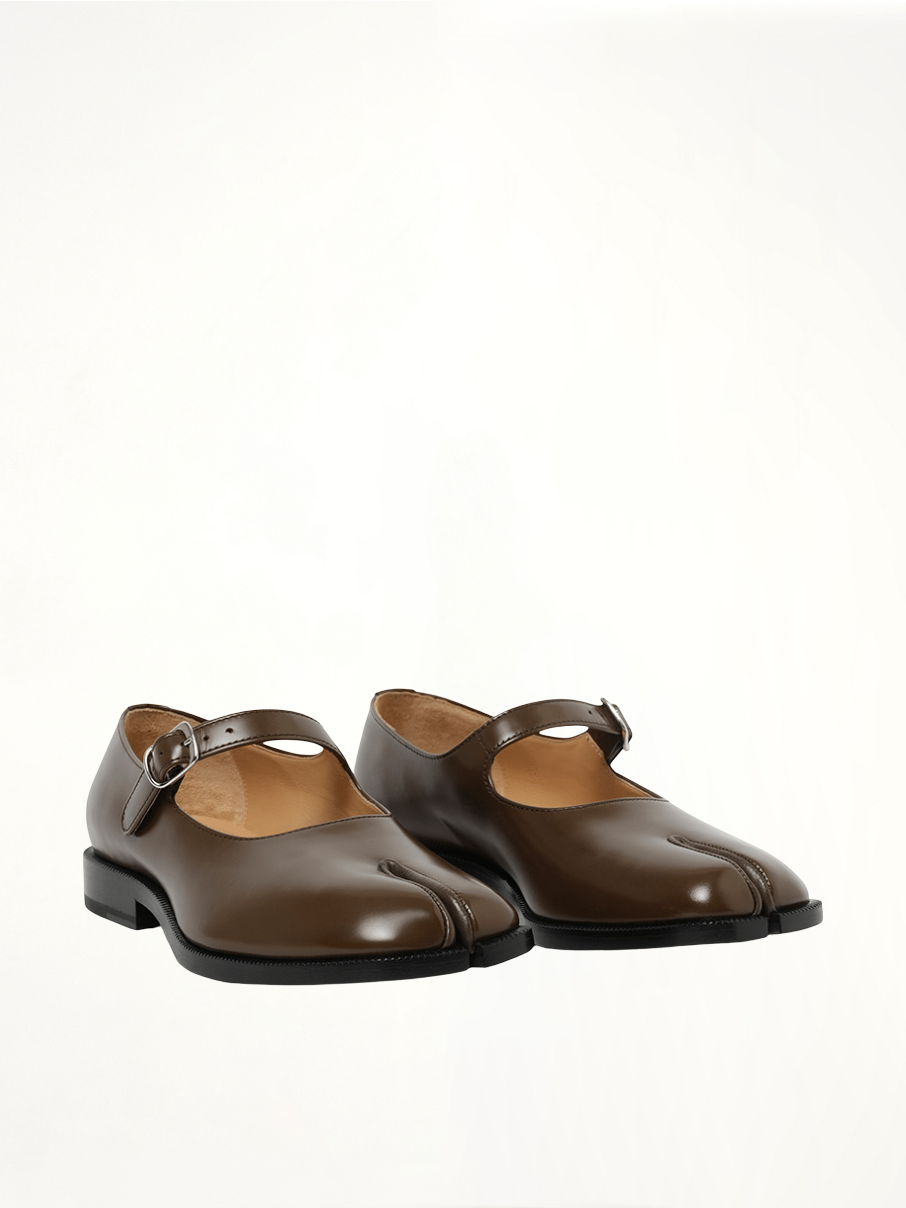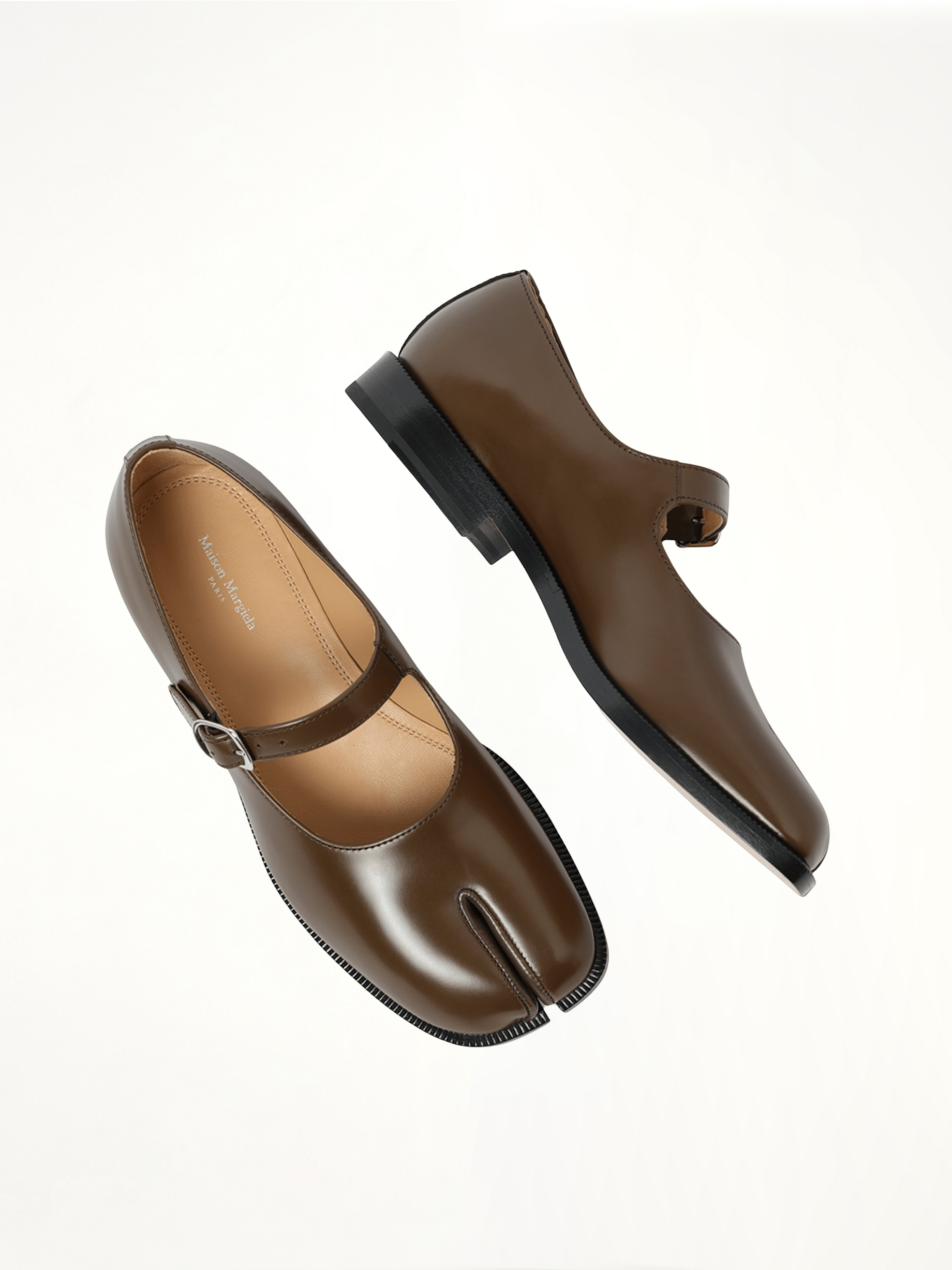 Maison Margiela's Tabi Mary Jane in Wood is a unique fusion of traditional design and avant-garde style. This distinctive footwear piece features the iconic split-toe silhouette, reimagined with a wooden sole for a bold statement.