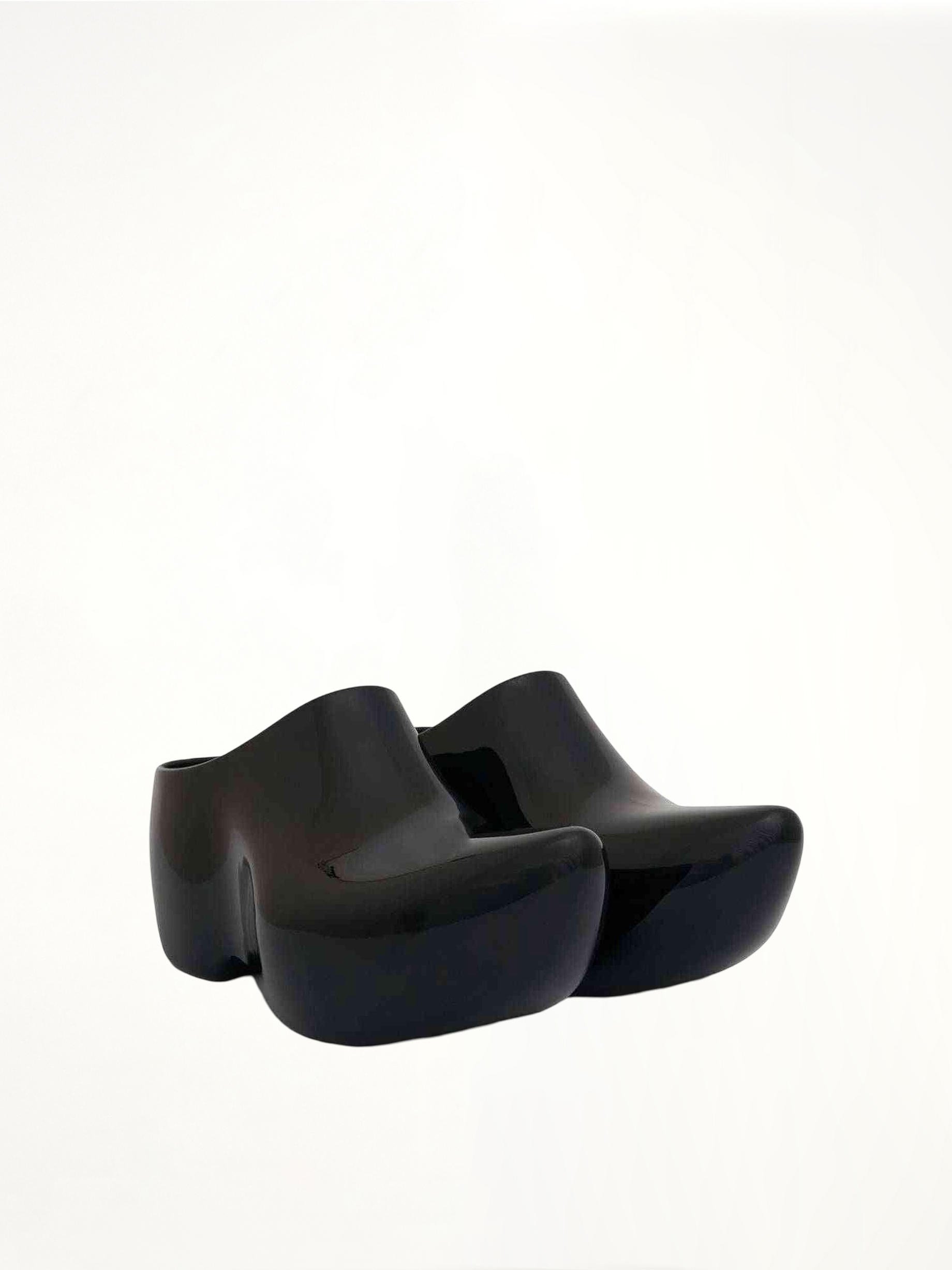 Balenciaga Technoclog in black shiny effect crafted from shiny effect rubber, giving them a sleek and modern look. With a pointed toe design and an open back, these clogs offer a contemporary twist on a classic silhouette.