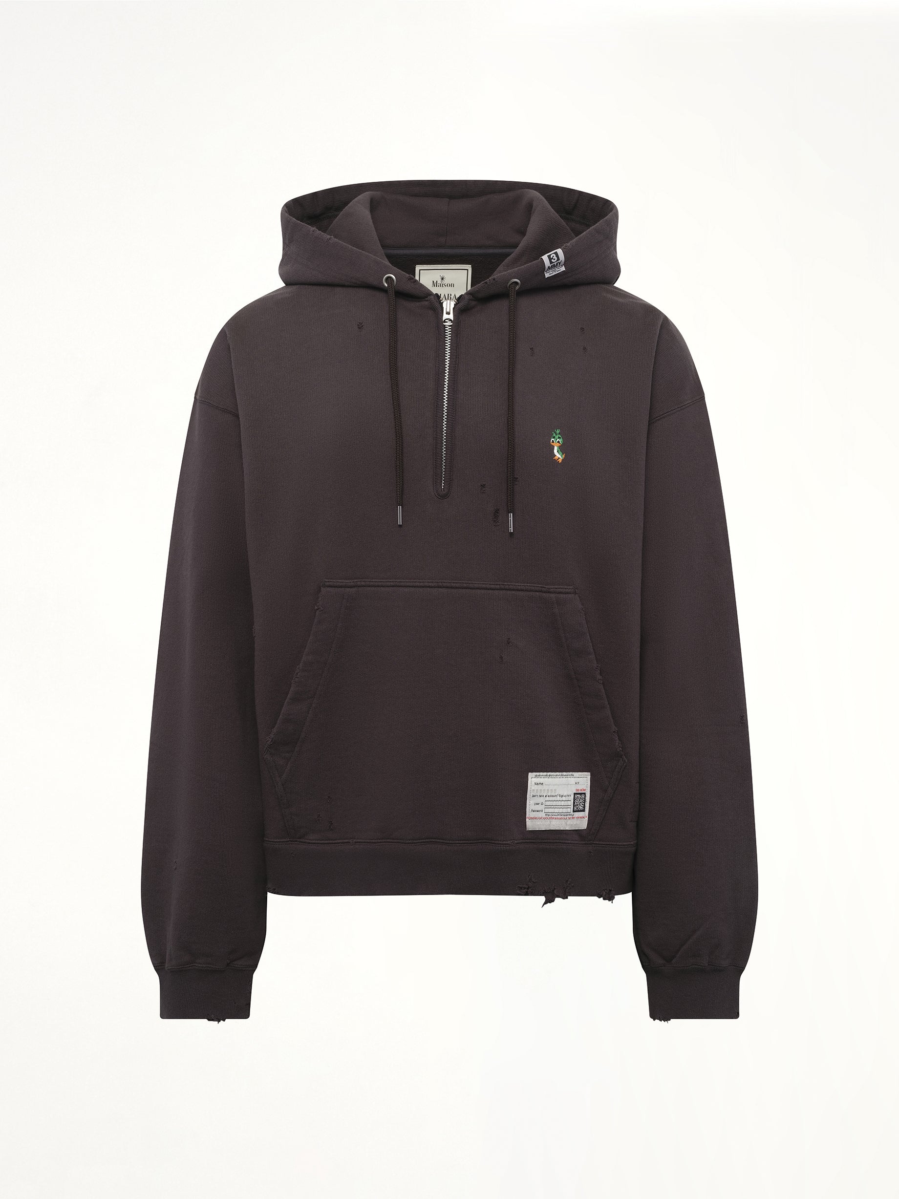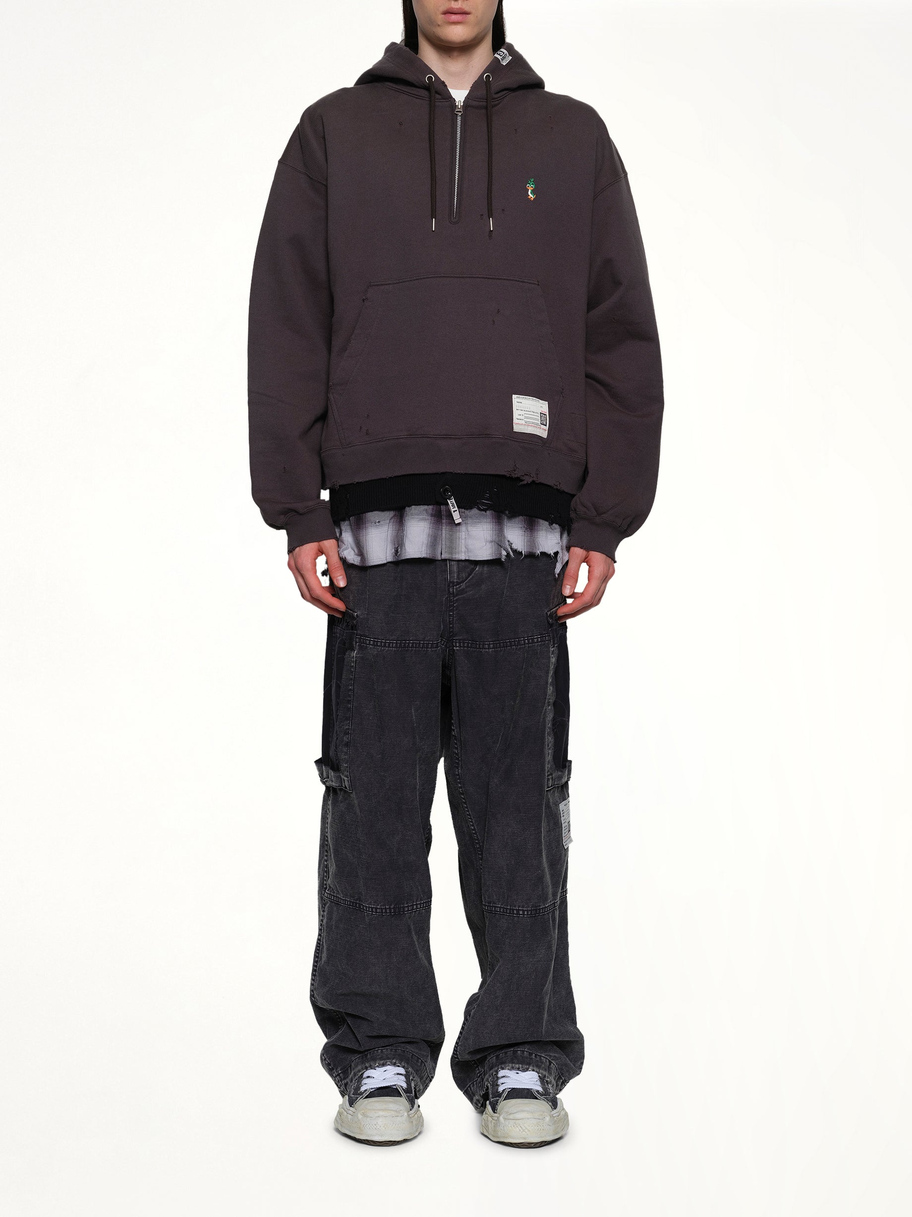 Maison Mihara's Triple Layered Half Zip Hoodie in Black is a stylish and functional piece designed for modern streetwear enthusiasts. This hoodie combines innovative layering with a sleek silhouette, making it a versatile addition to any wardrobe.