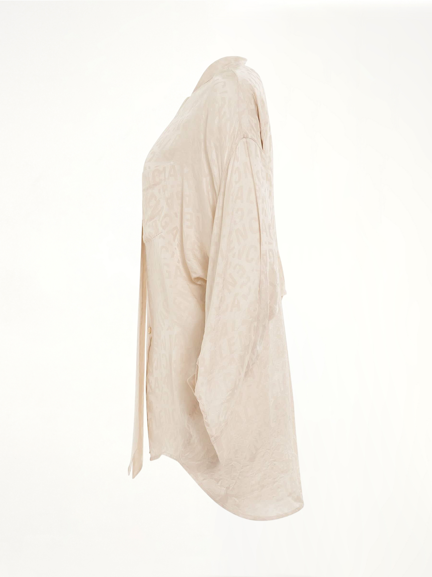 Long sleeve twisted swing blouse in dusty ivory with chest patch pocket, drop shoulder, buttoned cuffs, oversized style and all-over jacquard logo pattern