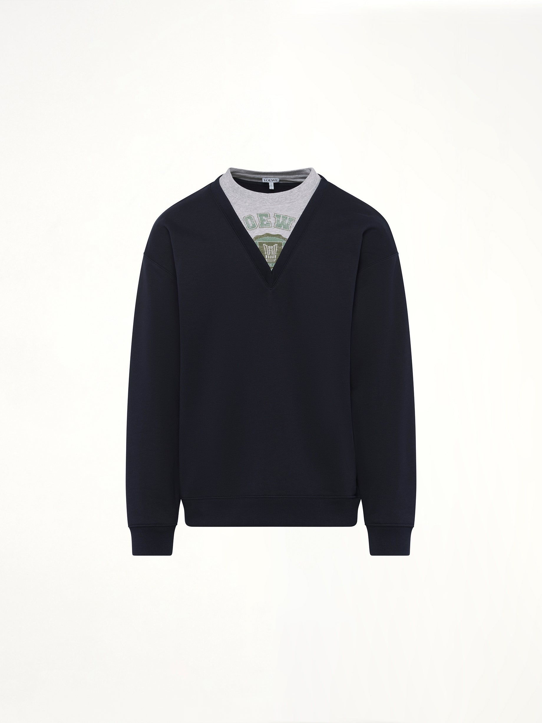 Loewe's Varsity V-Neck Sweatshirt in Dark Navy Blue is a stylish and versatile addition to any wardrobe. This classic piece combines comfort with a modern edge, perfect for casual outings or relaxed evenings.