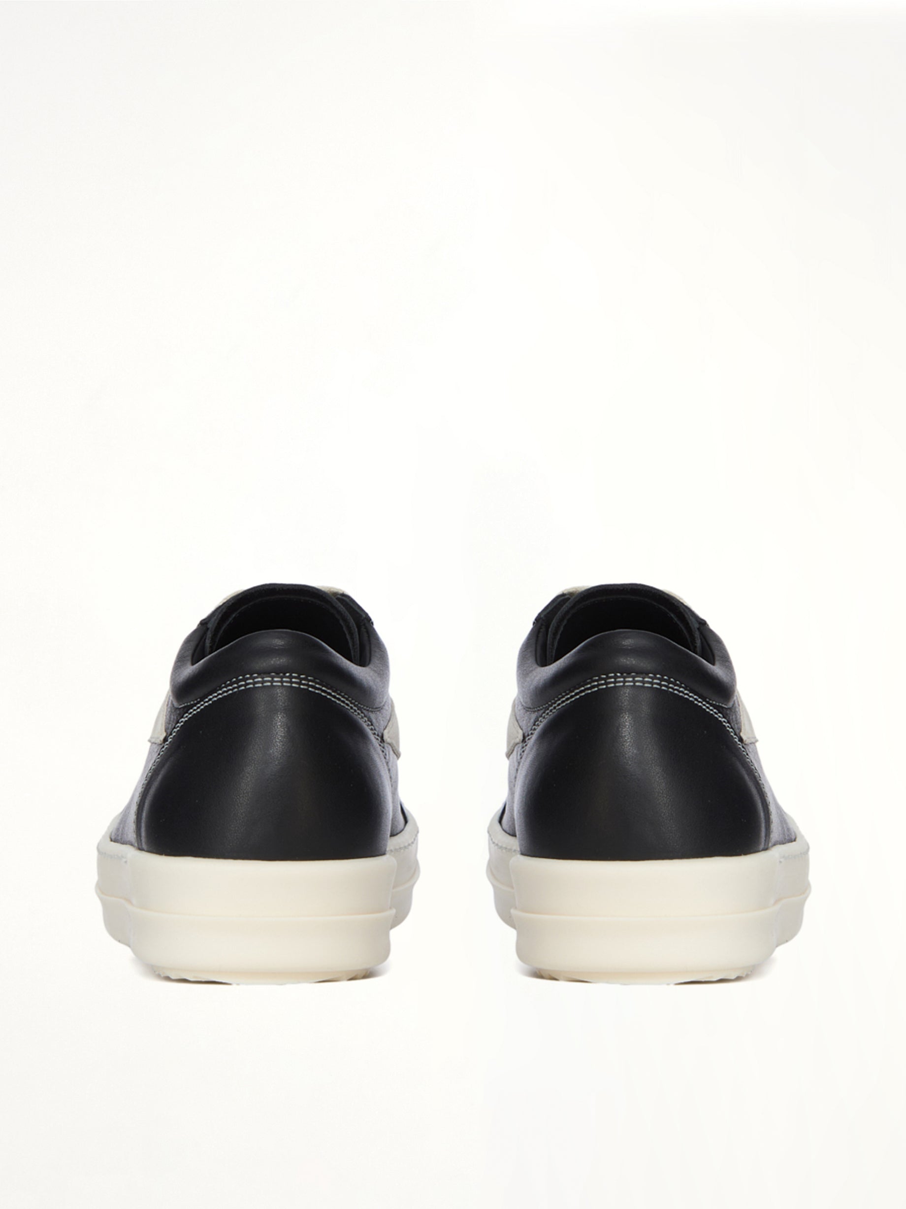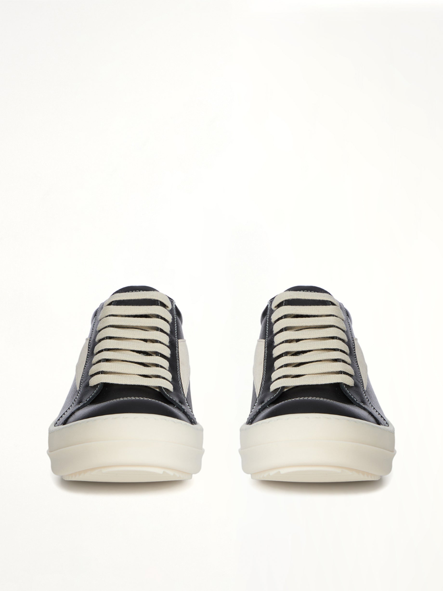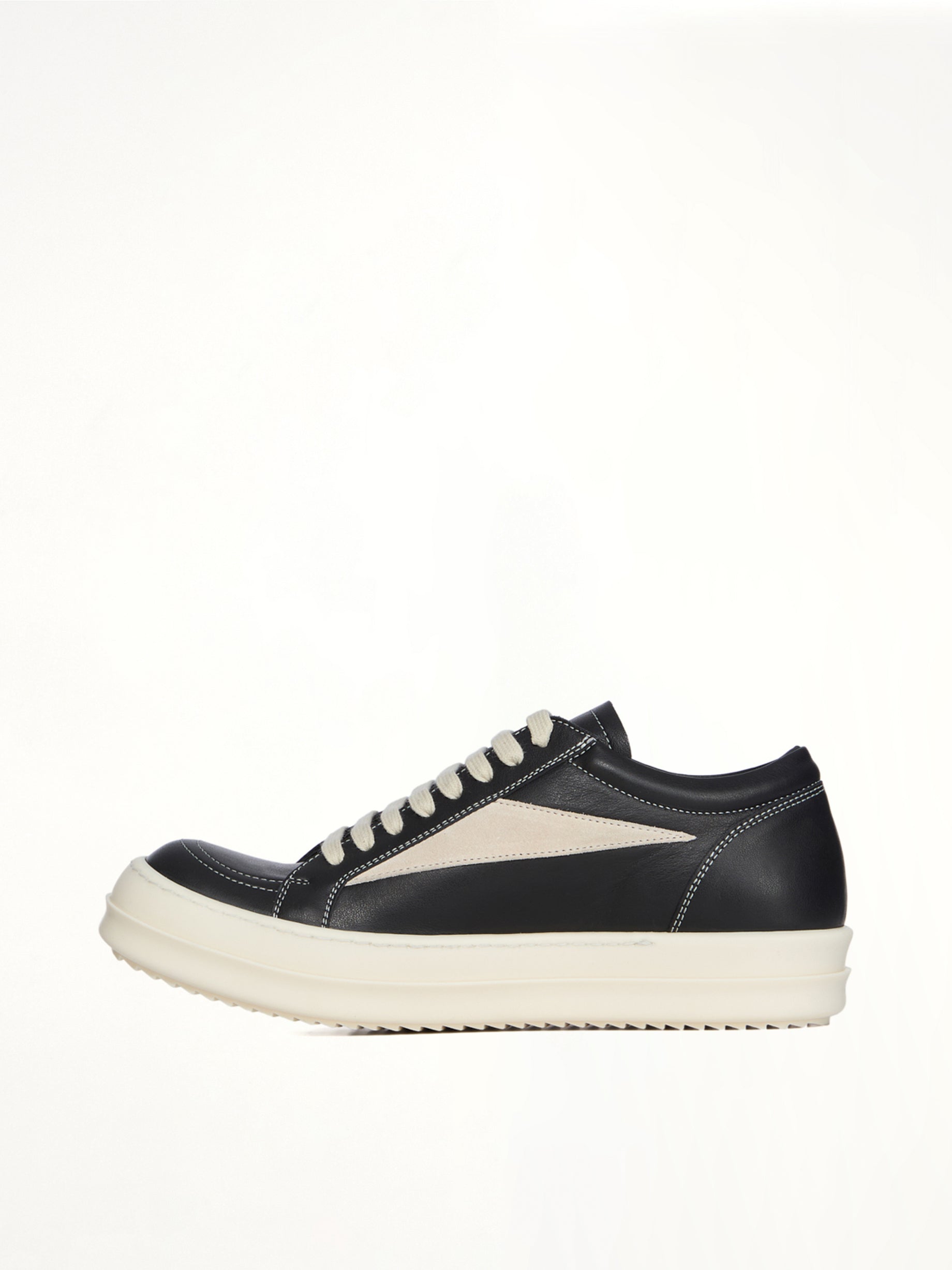 Rick Owens's Vintage Calf Sneaks in Black/Milk is a striking blend of avant-garde design and classic sneaker aesthetics. These sneakers offer a bold statement with their unique color combination and distinctive silhouette.