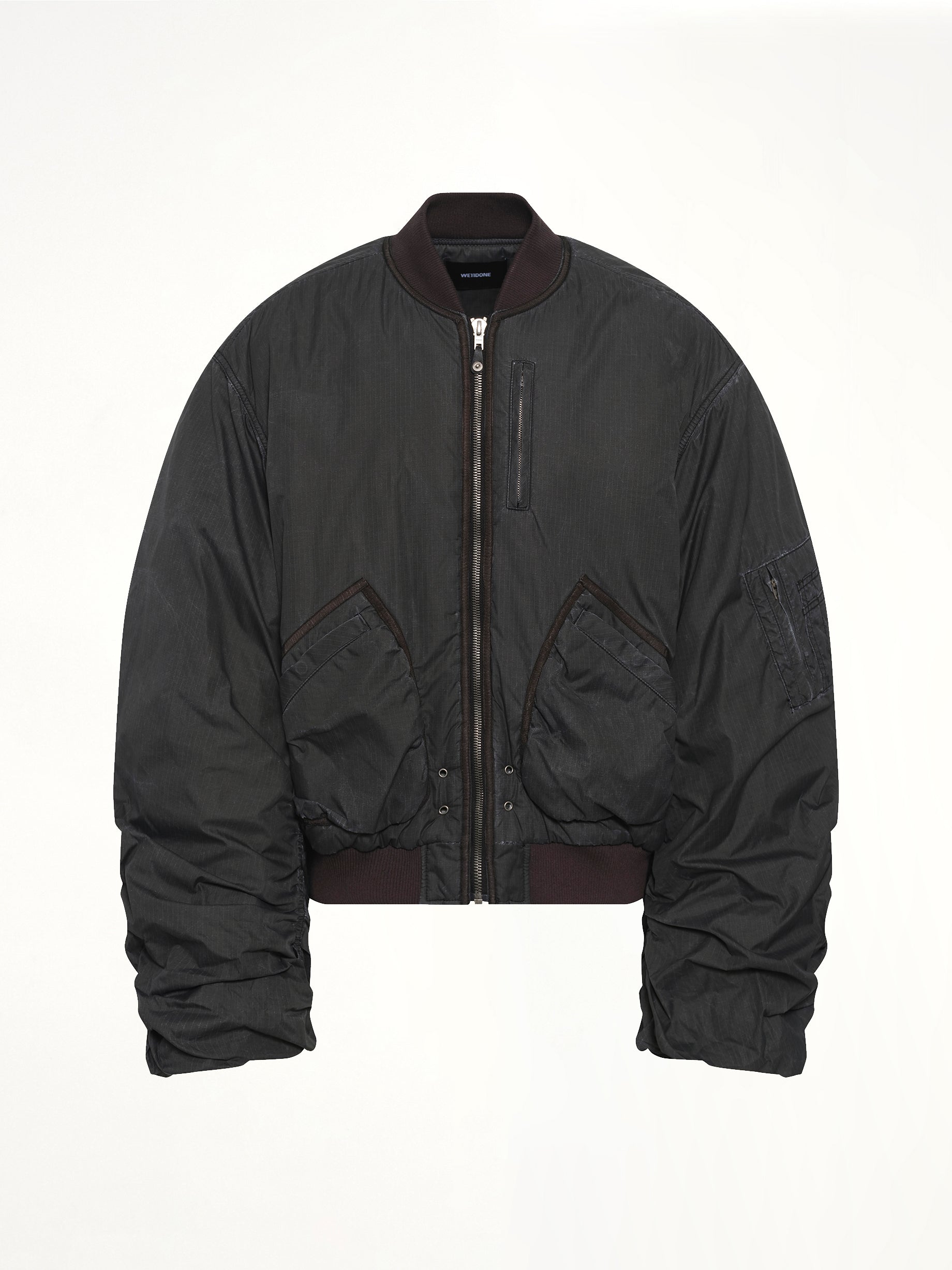 We11done's Washed Nylon Bomber in Black is a stylish and versatile outerwear piece that combines modern design with classic bomber jacket elements. Perfect for adding a touch of edge to any outfit, this bomber is both functional and fashionable.