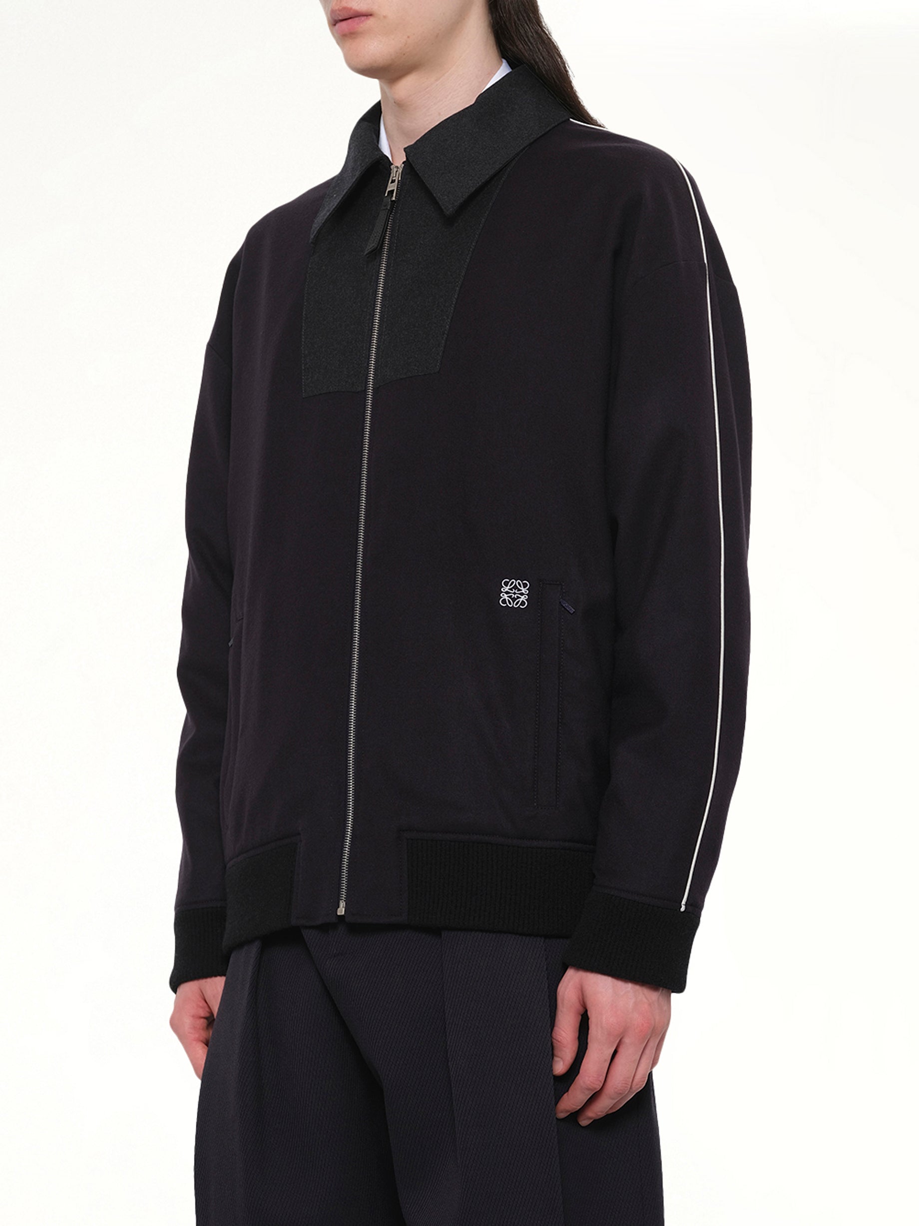 Loewe's Wool Traksuit Jacket in Navy/Grey is a sophisticated blend of style and comfort, perfect for both casual and formal settings. This jacket features a modern design with a tailored fit, making it a versatile addition to any wardrobe.