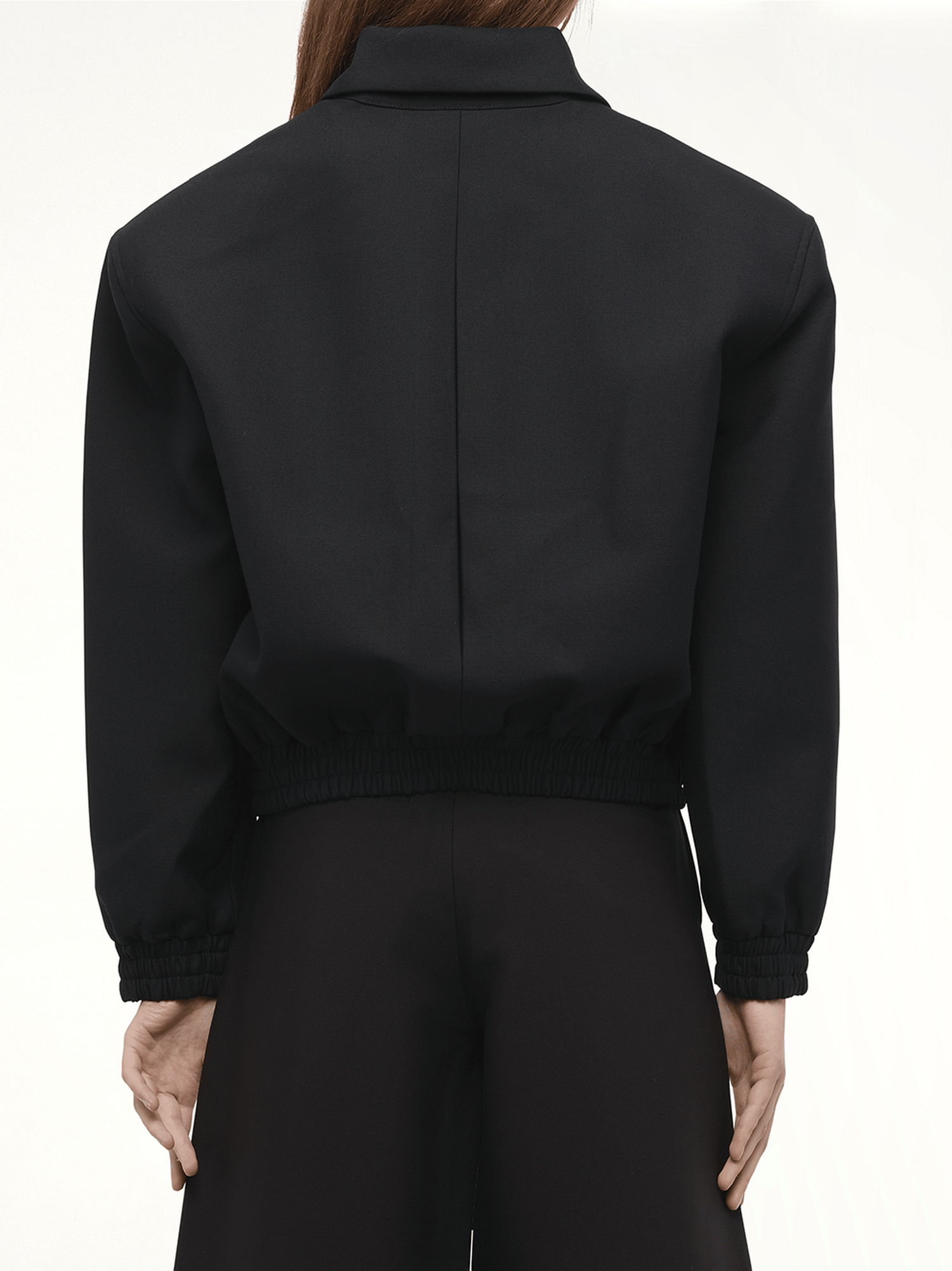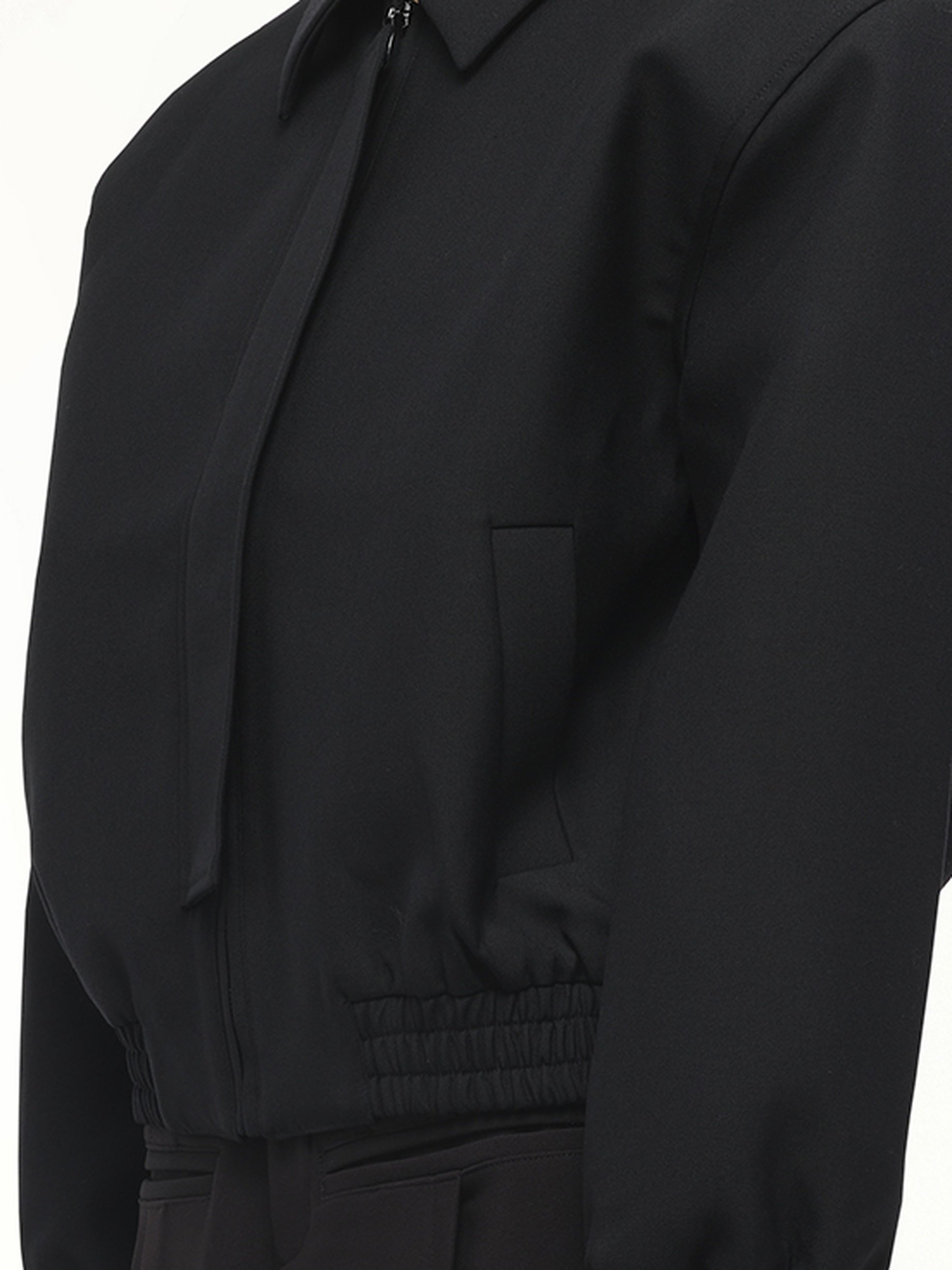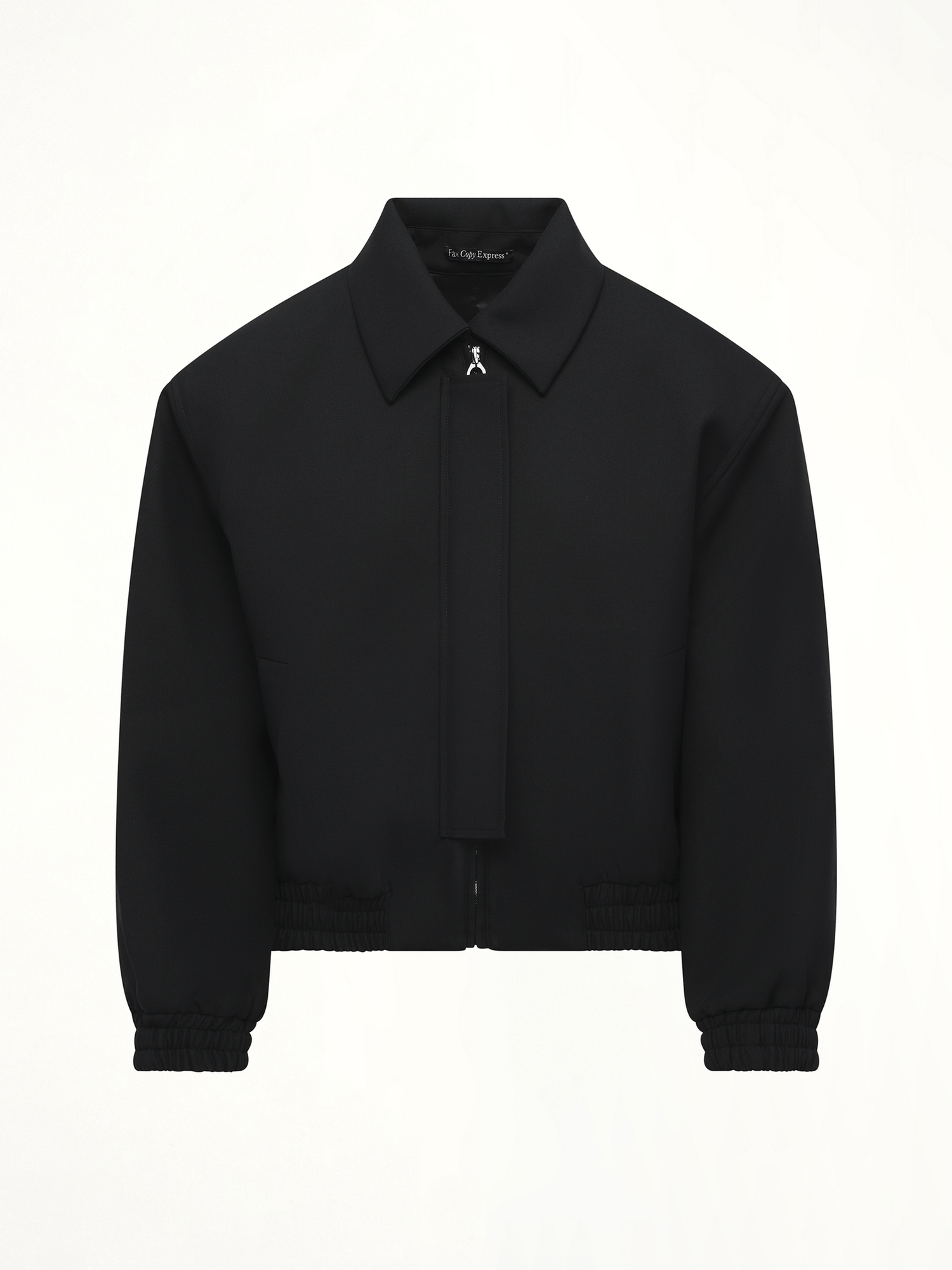 Fax Copy Express's Zip Shoulder Jacket in Black, combining urban style with functional details. This jacket features a bold zip shoulder design and a sleek, tailored fit for a sharp and modern look.