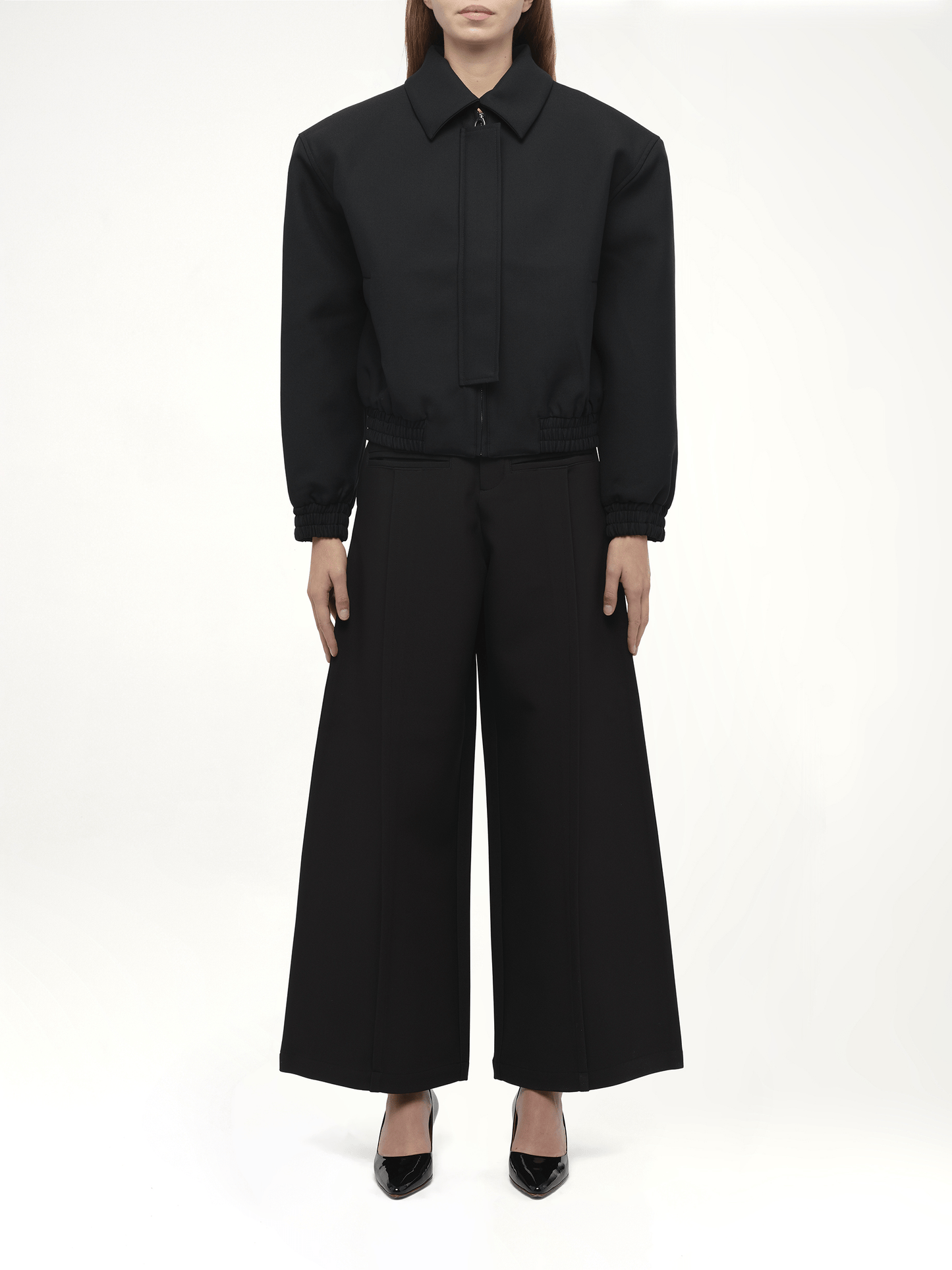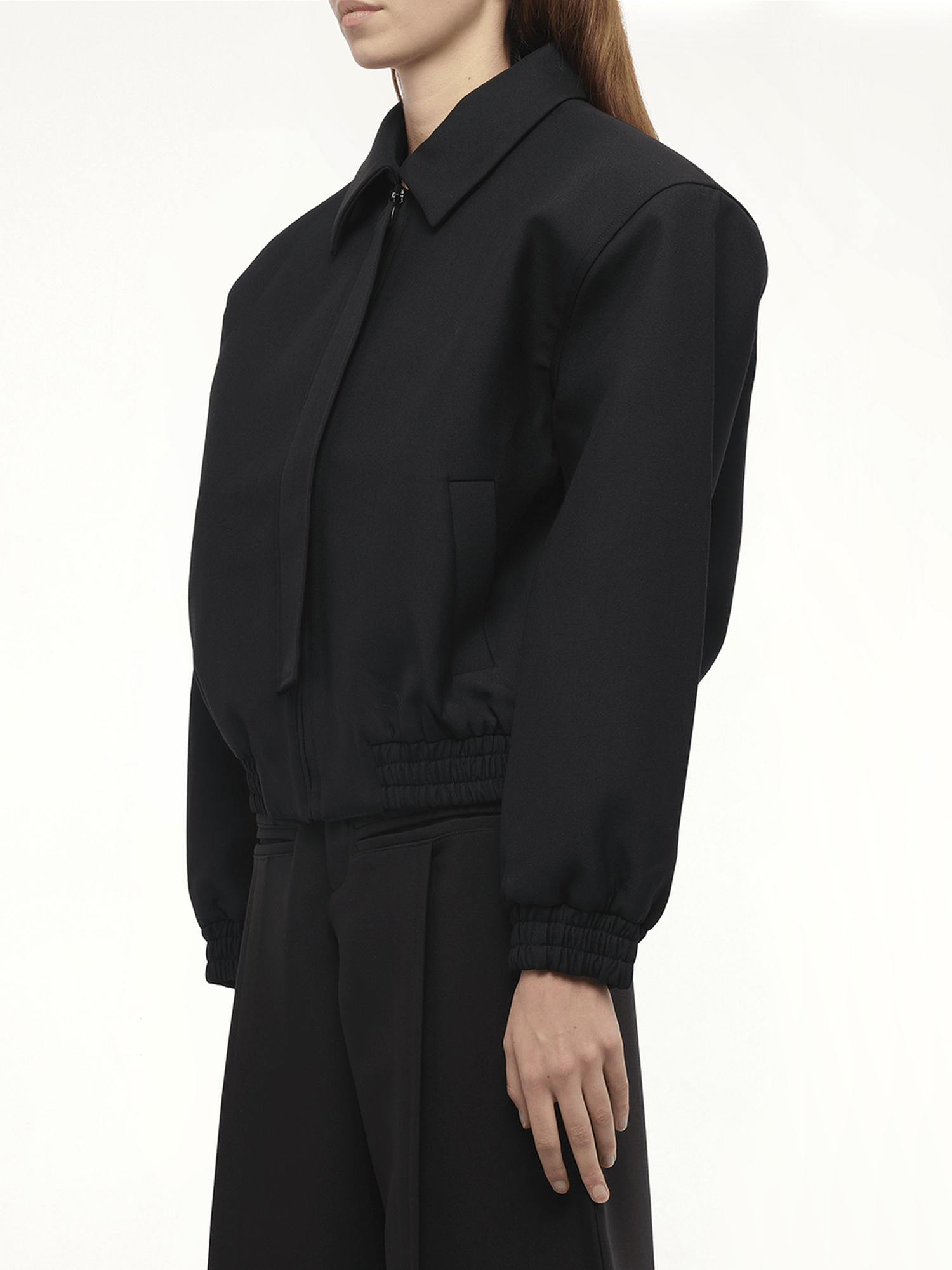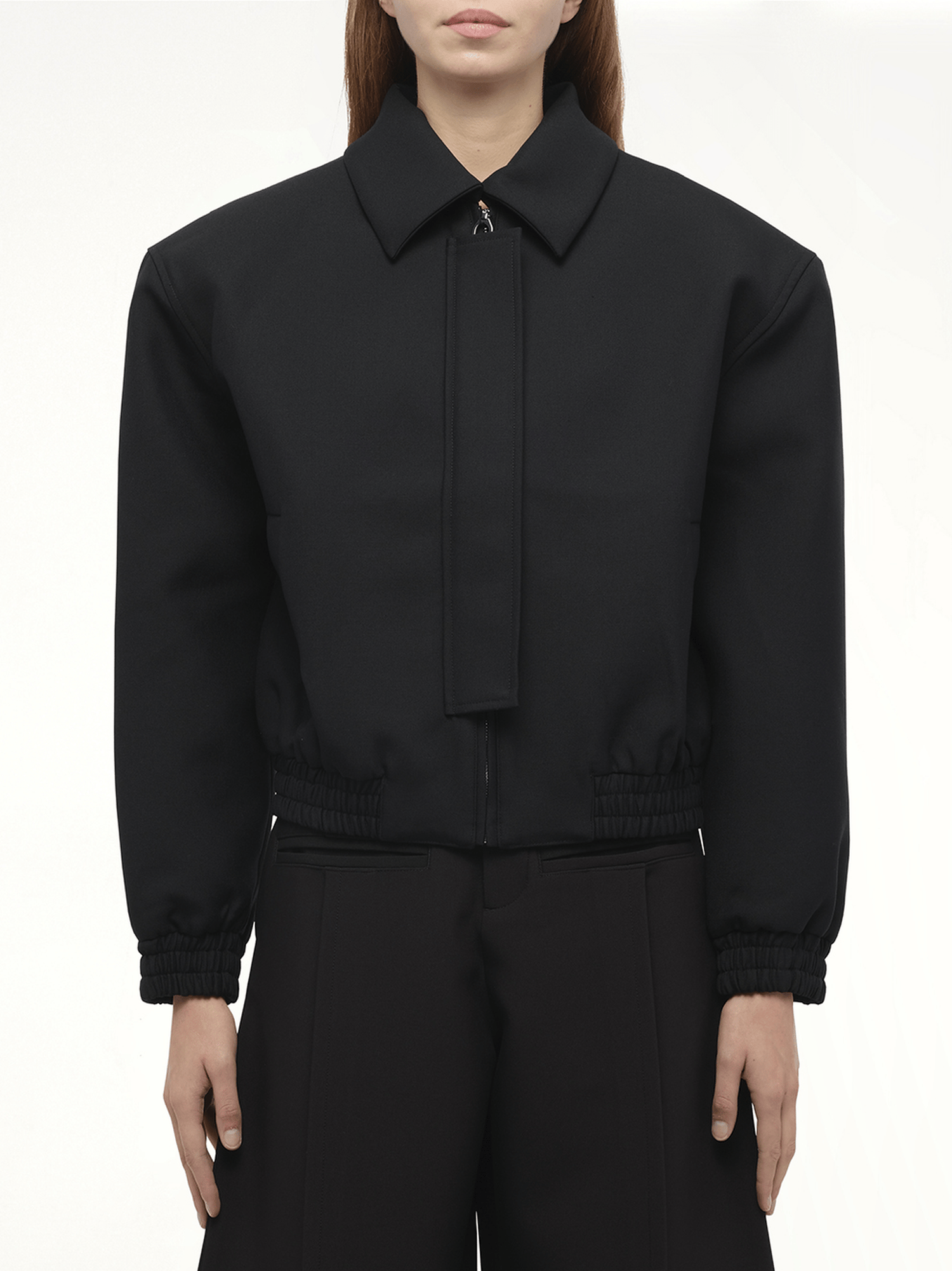 Fax Copy Express's Zip Shoulder Jacket in Black, combining urban style with functional details. This jacket features a bold zip shoulder design and a sleek, tailored fit for a sharp and modern look.