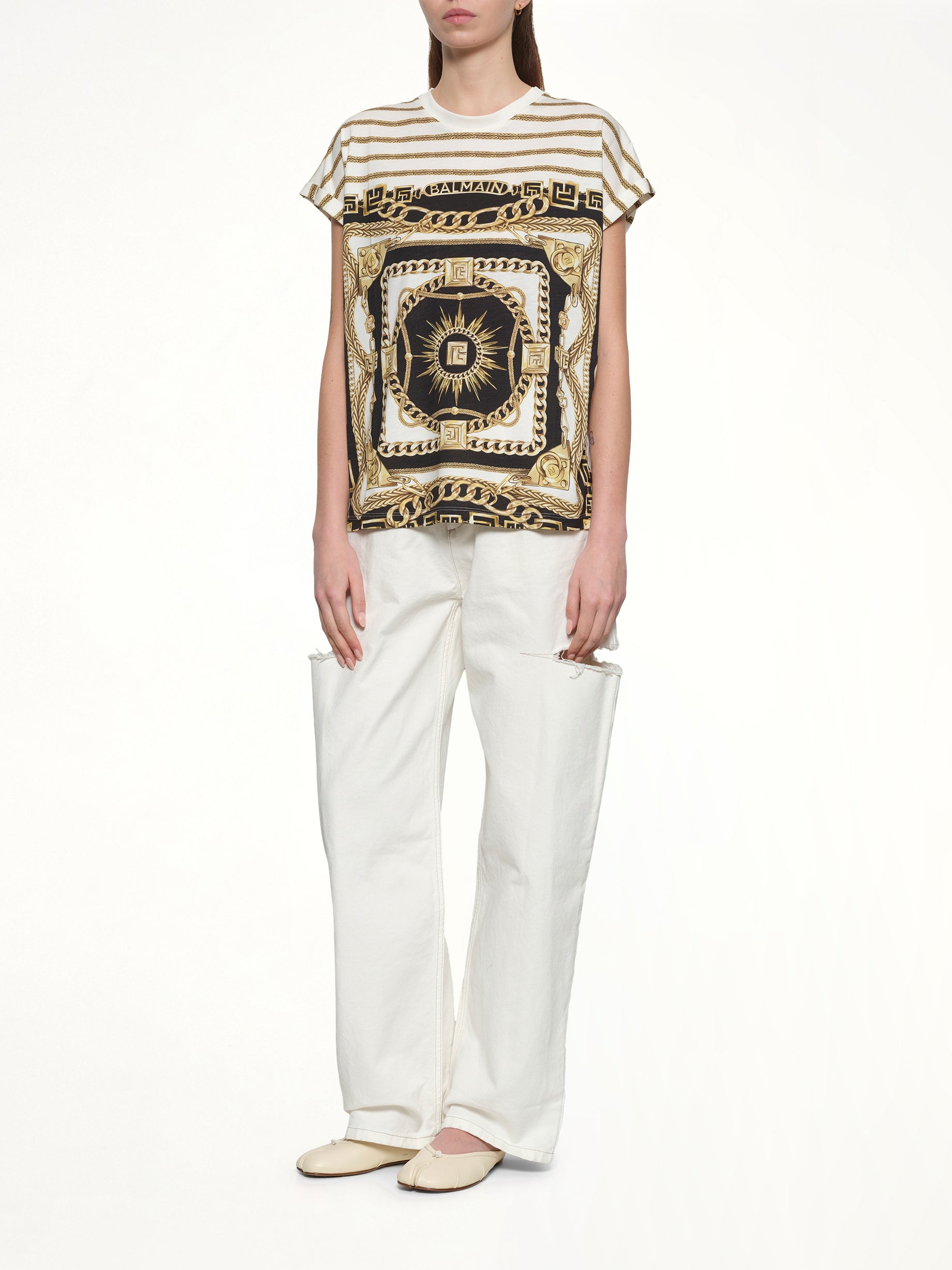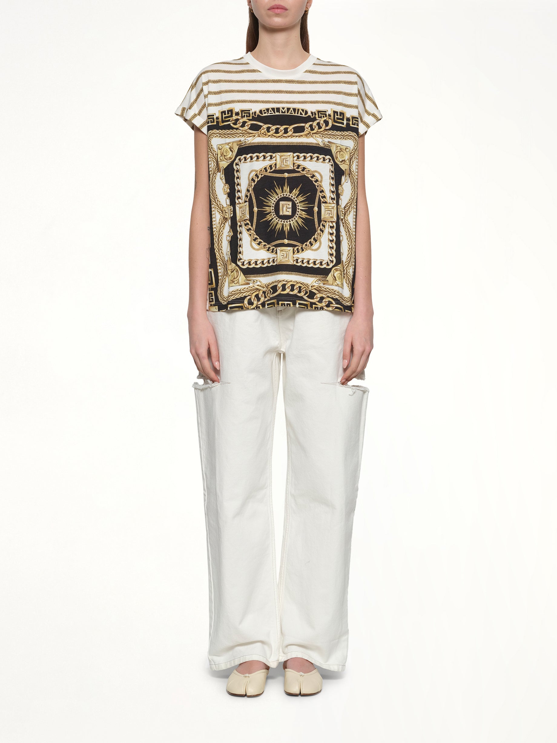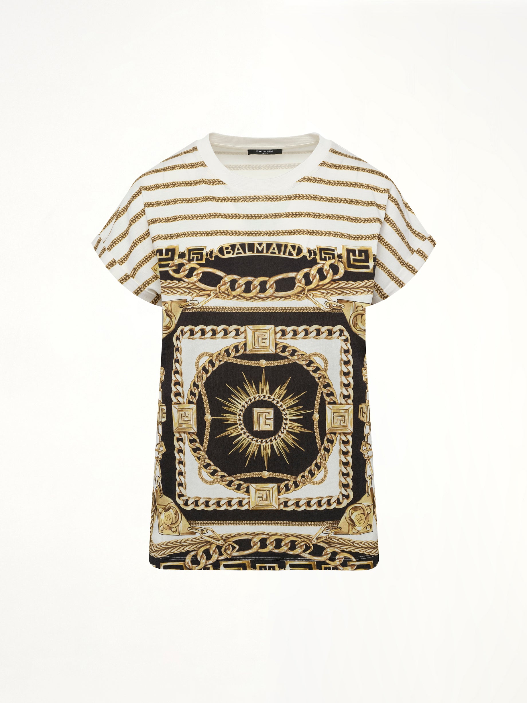 Balmain's 3 BTNS Foulard Print T-Shirt in White/Black/Gold is a striking piece that combines luxury with a bold design. This t-shirt features a unique foulard print that adds a touch of elegance to any outfit.