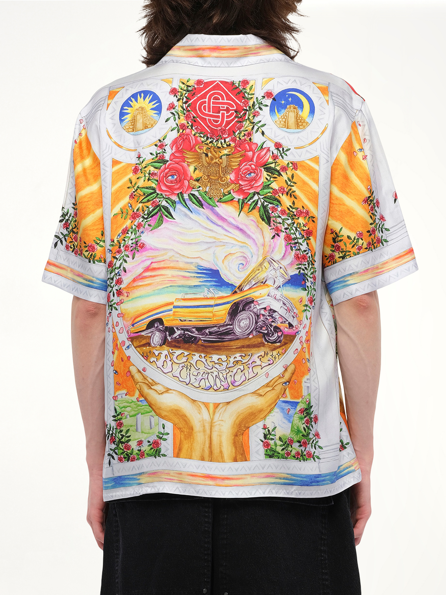 Casablanca's A Tournade De Rose Cuban Collar Shirt showcases a vivid floral print inspired by romantic summer scenes. The fluid silhouette and lightweight fabric make it perfect for refined daytime dressing or evening escapism.