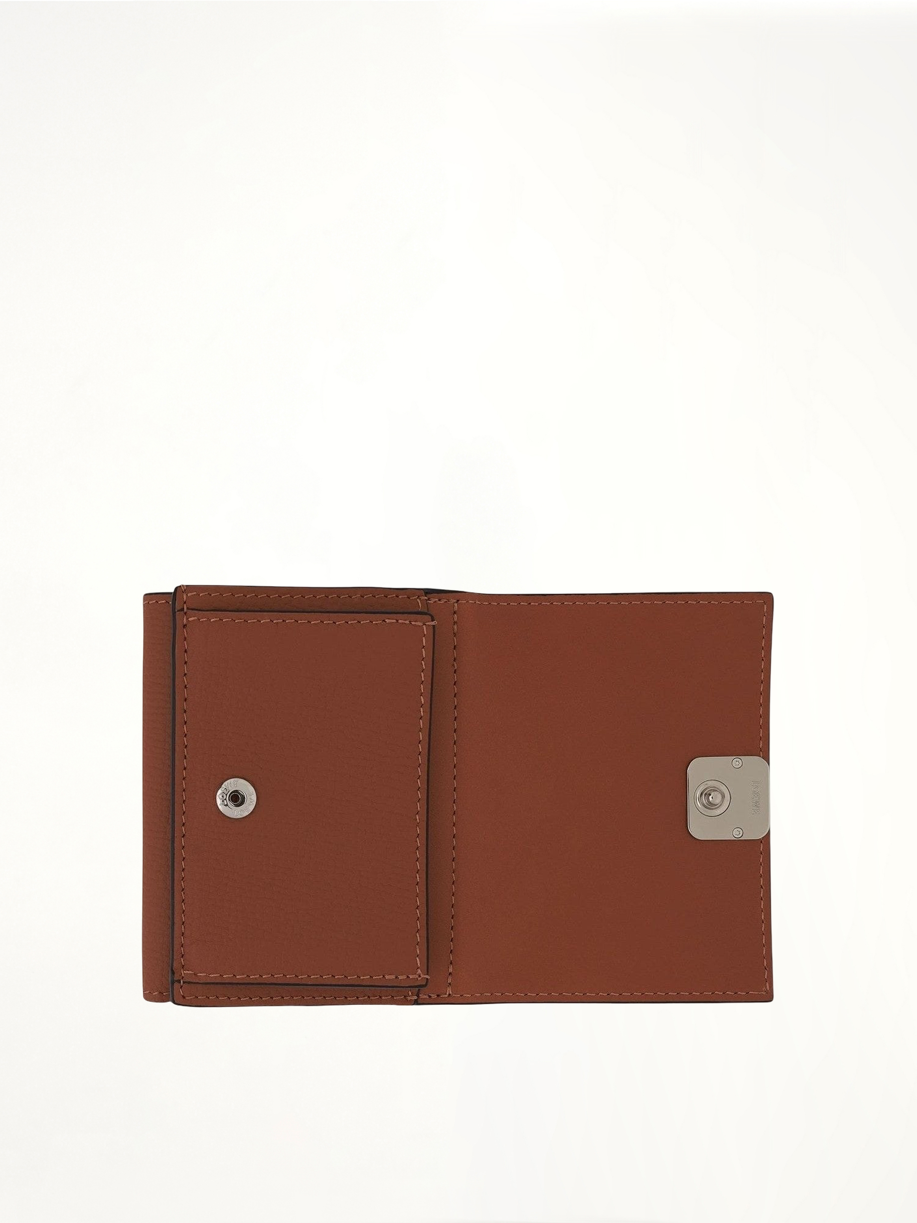 Anagram trifold wallet pebble grain calfskin in tan with signature anagram plaque, silver-tone hardware and press-stud fastening