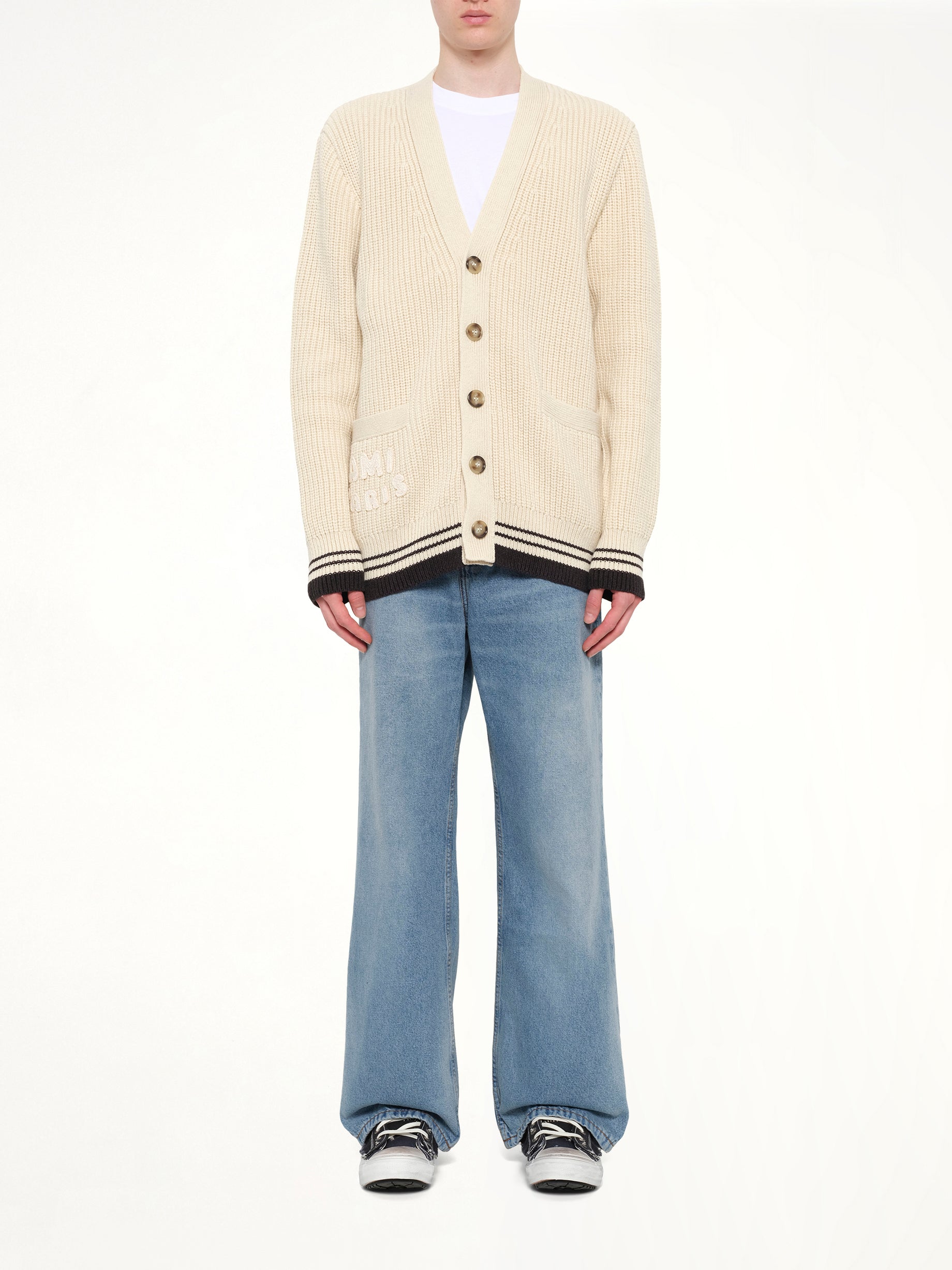 Ami Paris's Cardigan with ADC and Ami Paris Patch in Cream is a stylish and versatile addition to any wardrobe. This cardigan combines classic design with modern details, making it perfect for various occasions.