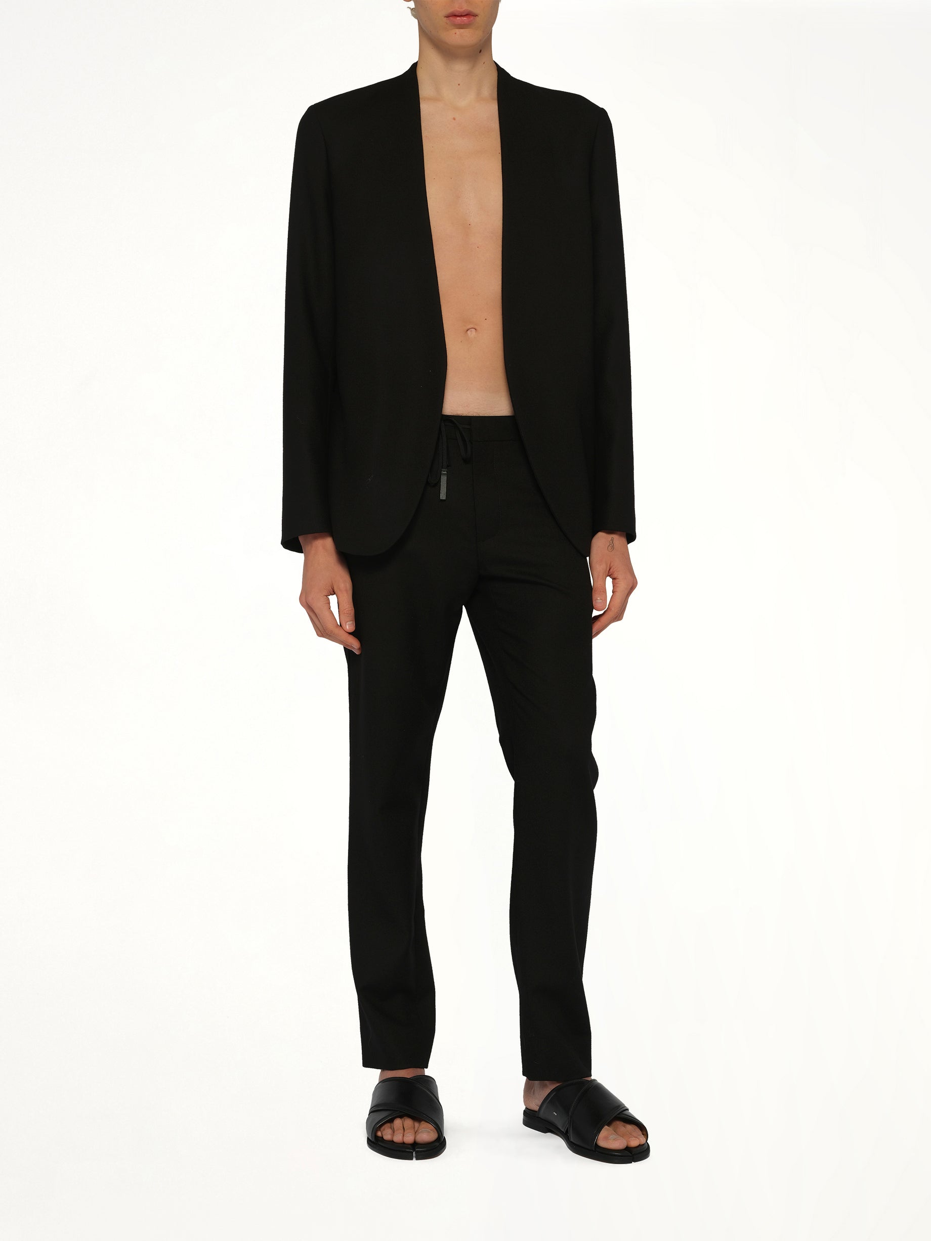 Maison Margiela's Collarless Jacket in Black is a sophisticated and modern piece that elevates any wardrobe. Its sleek design and minimalist aesthetic make it a versatile choice for various occasions.