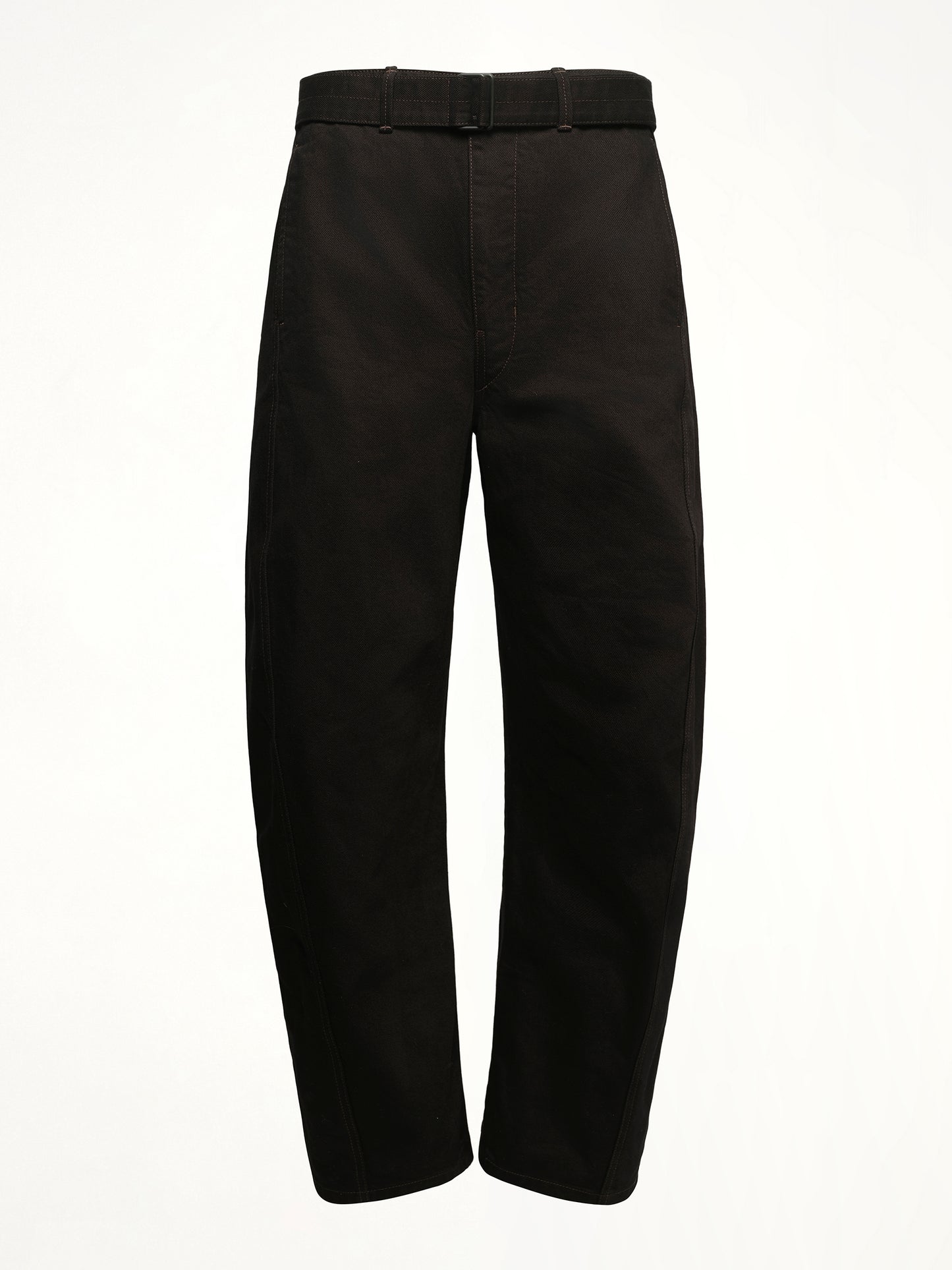 Lemaire's Denim Twisted Belted Pants in Black, featuring a unique twisted belt design that adds an artistic touch to the classic denim silhouette. The relaxed, tapered fit offers both comfort and a sharp look, making these pants a versatile addition to any wardrobe.