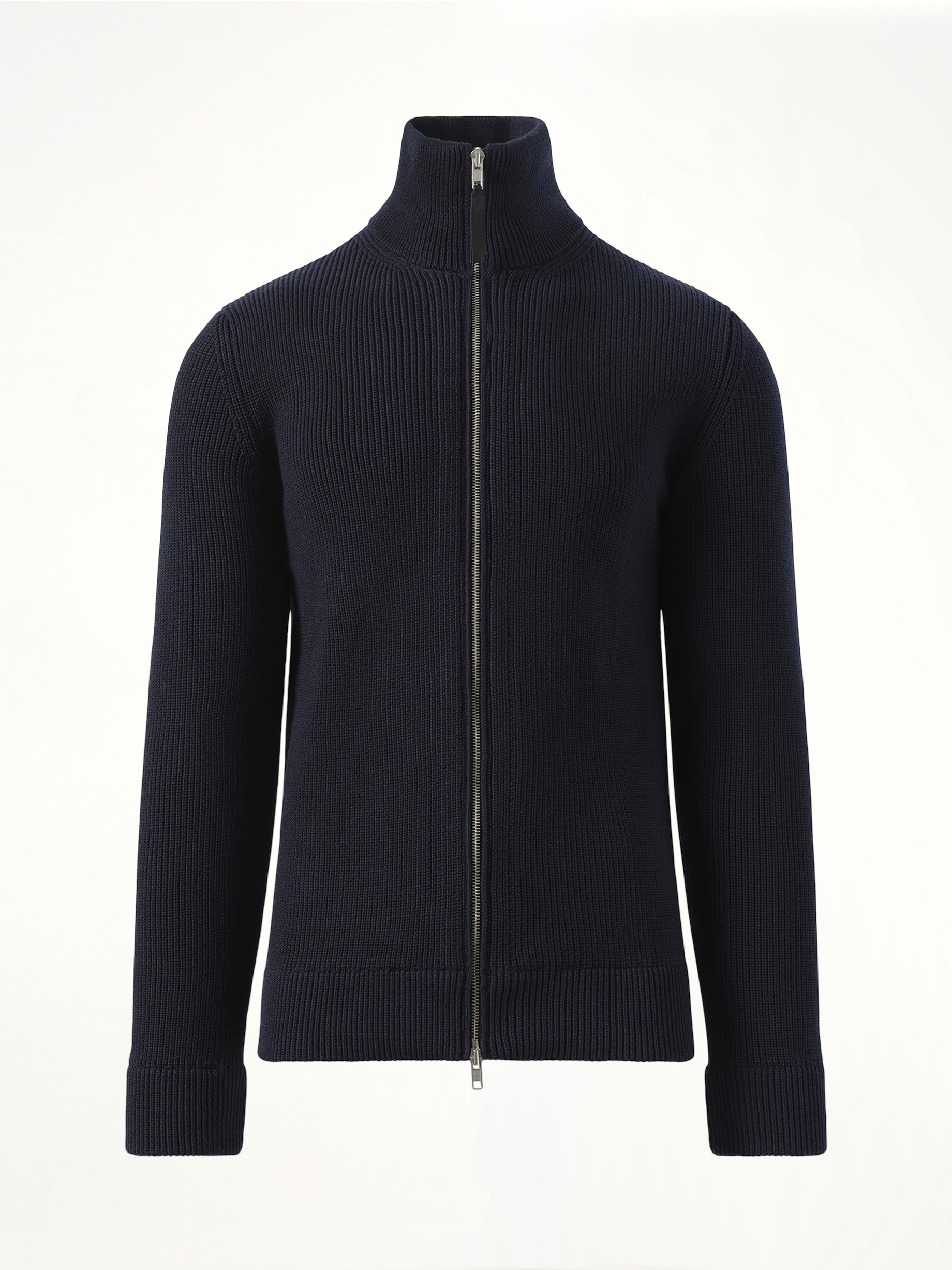 Maison Margiela's English Rib Zip Cardigan in Navy offers a refined take on a classic knitwear staple. The structured ribbed texture and zip-front design create a perfect balance of sophistication and versatility.