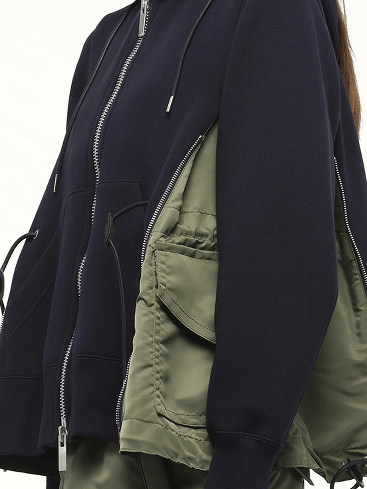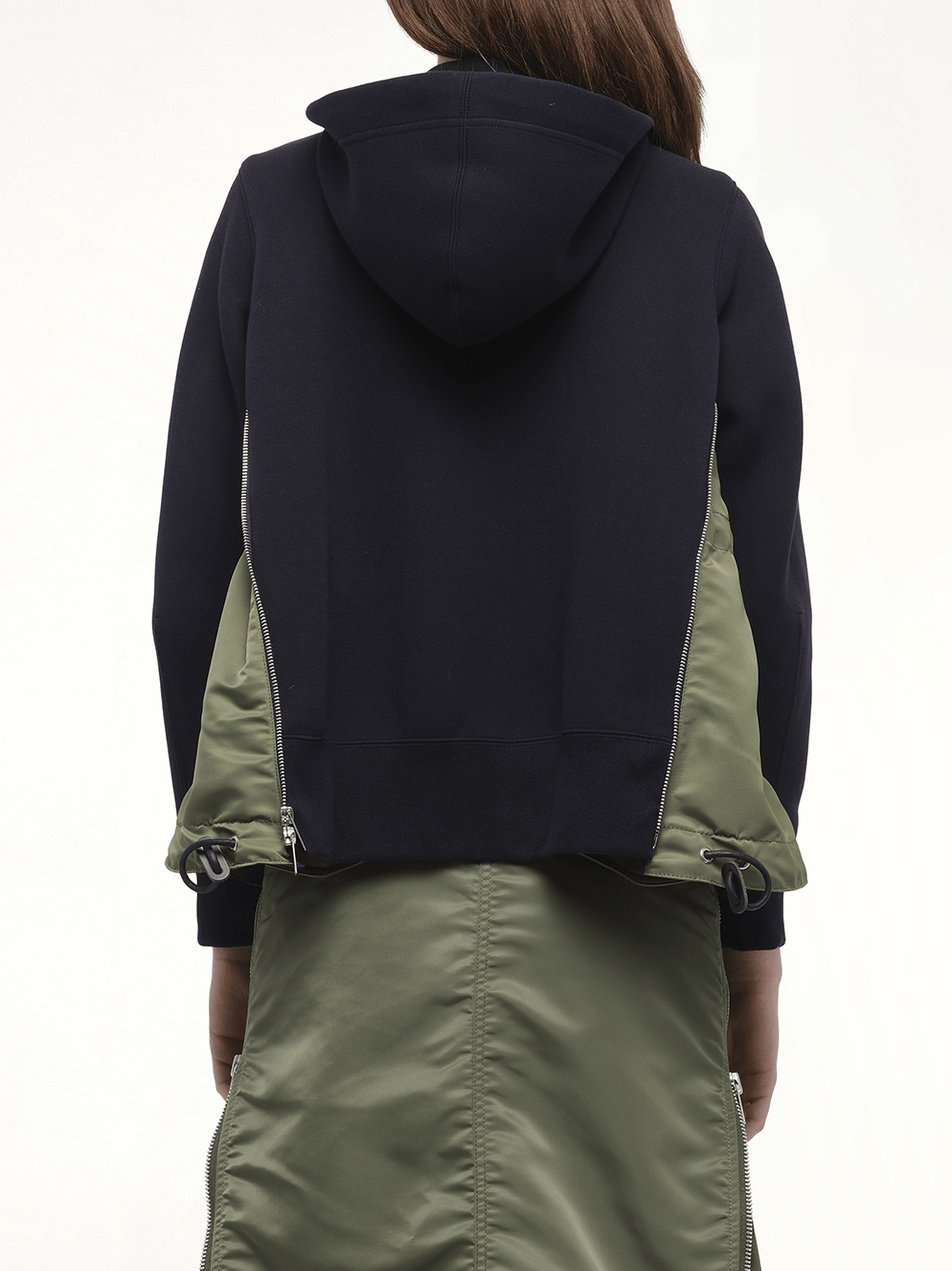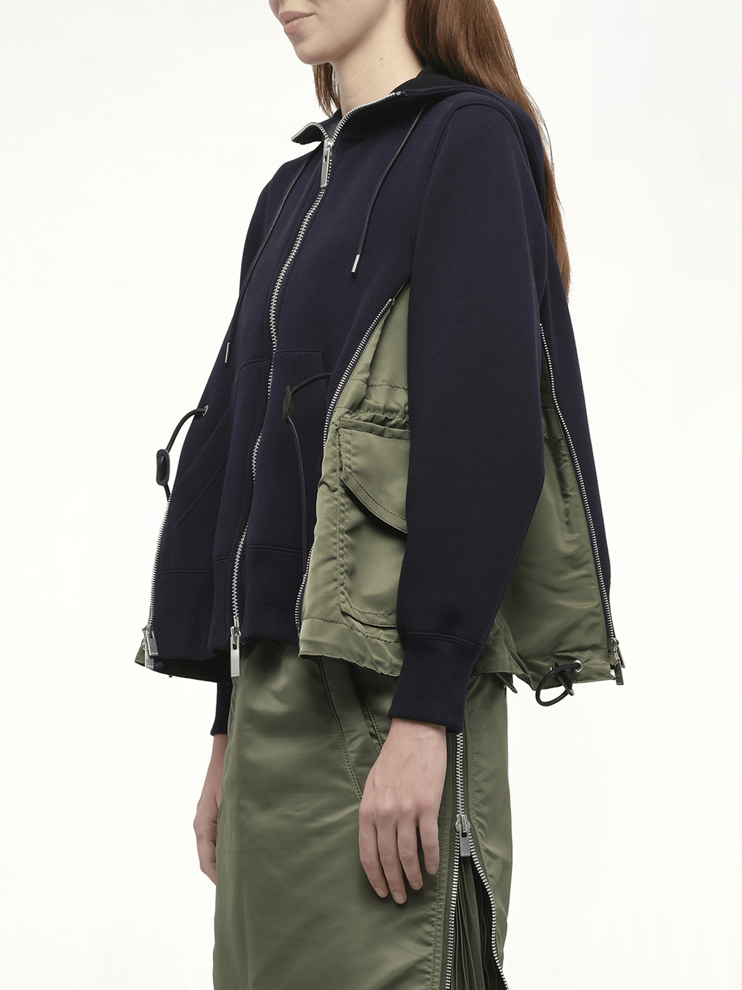 SACAI's Sponge Sweat x Nylon Twill Hoodie in Navy/Khaki combines innovative design with a modern aesthetic, offering a unique blend of textures and colors. Perfect for those who appreciate both style and comfort, this hoodie is a standout piece in any wardrobe.