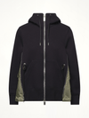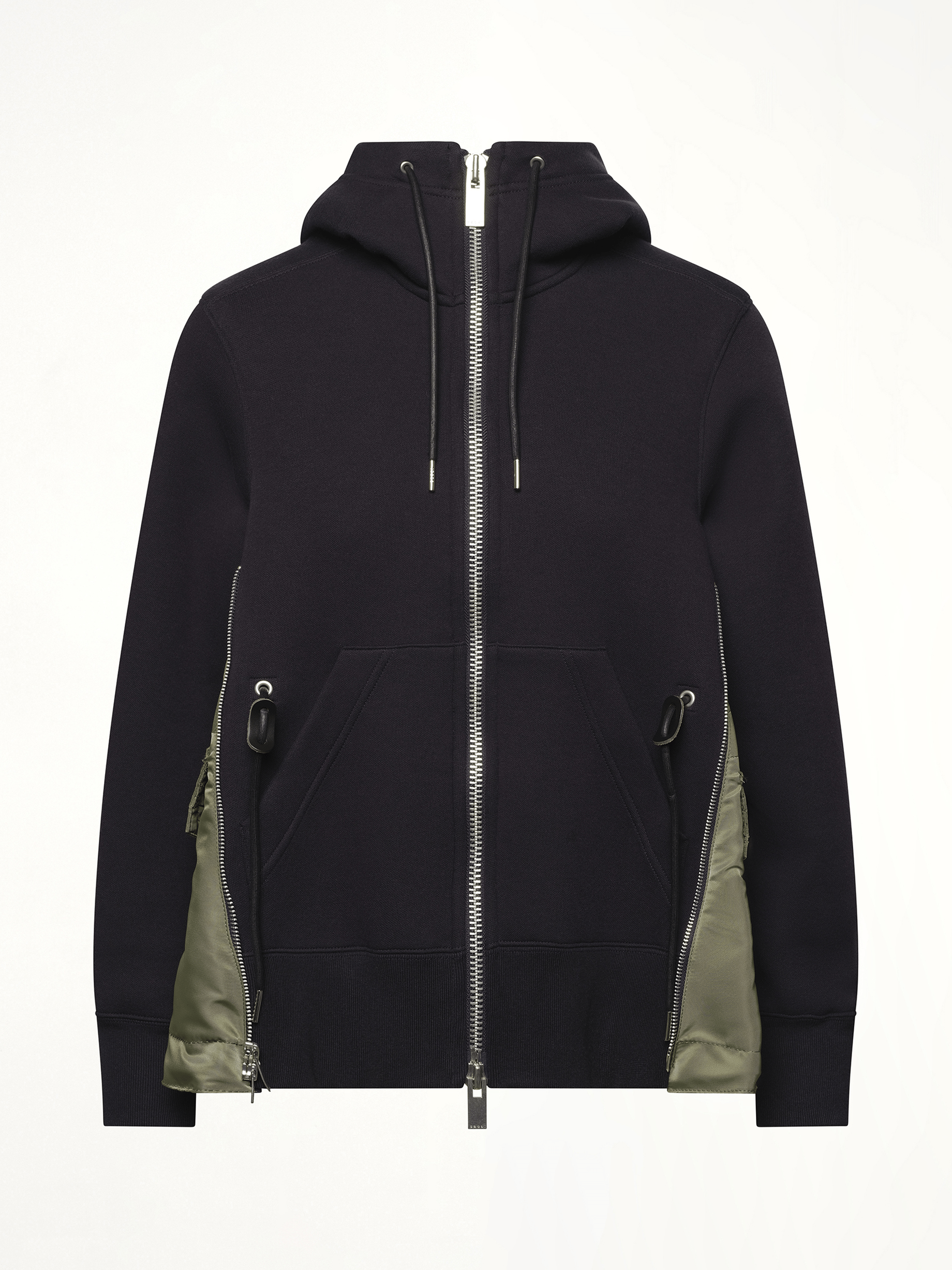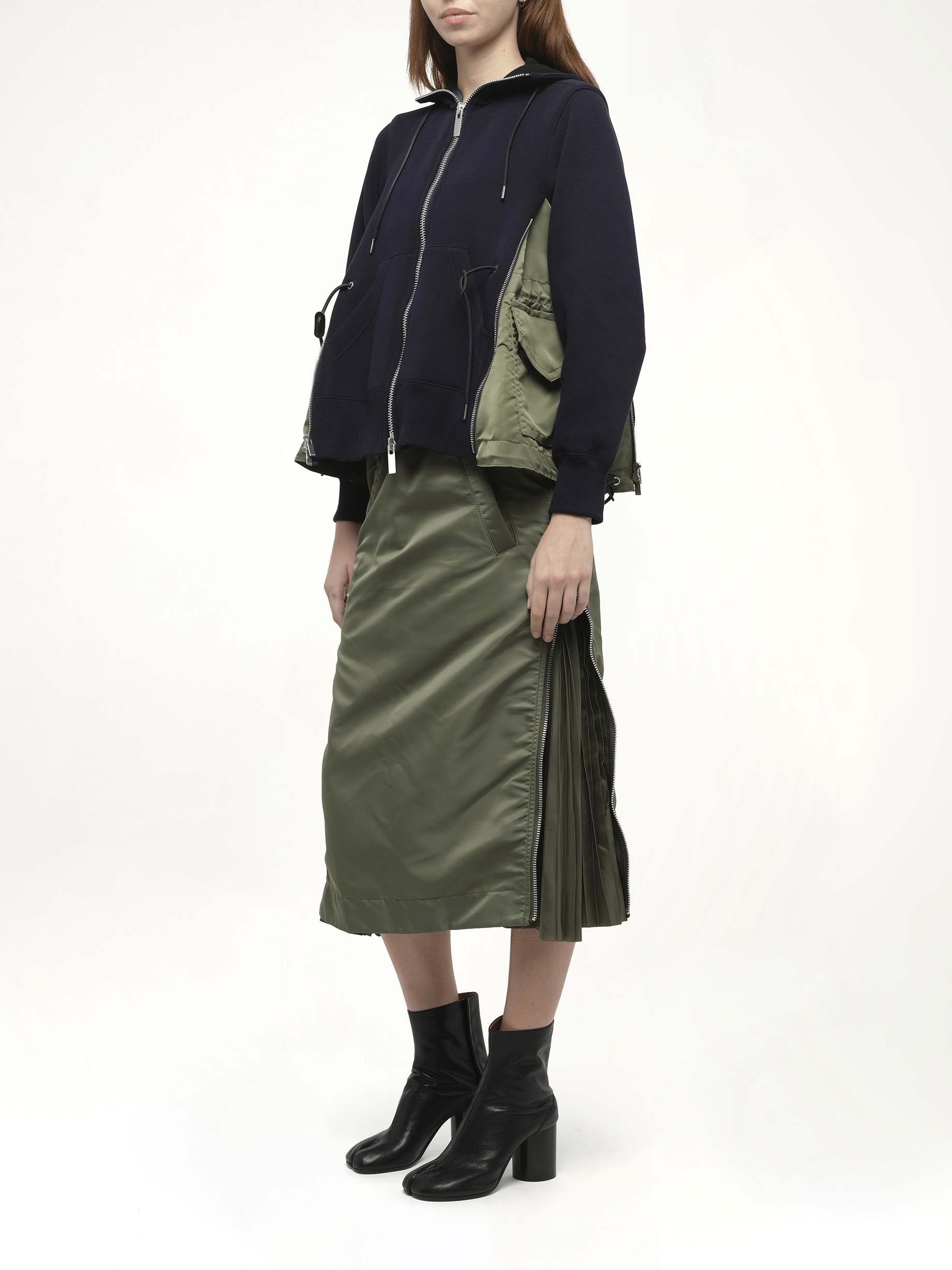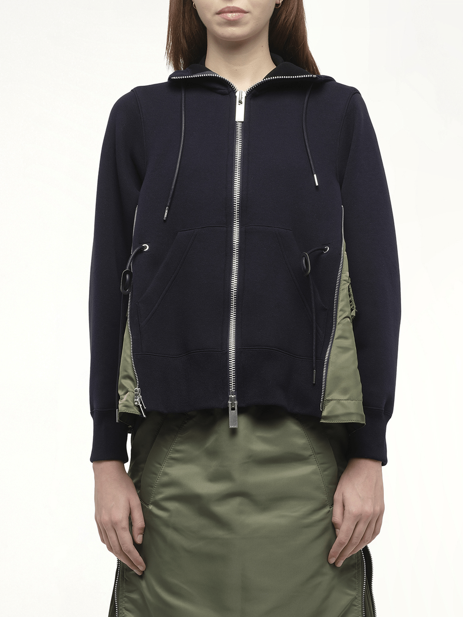 SACAI's Sponge Sweat x Nylon Twill Hoodie in Navy/Khaki combines innovative design with a modern aesthetic, offering a unique blend of textures and colors. Perfect for those who appreciate both style and comfort, this hoodie is a standout piece in any wardrobe.