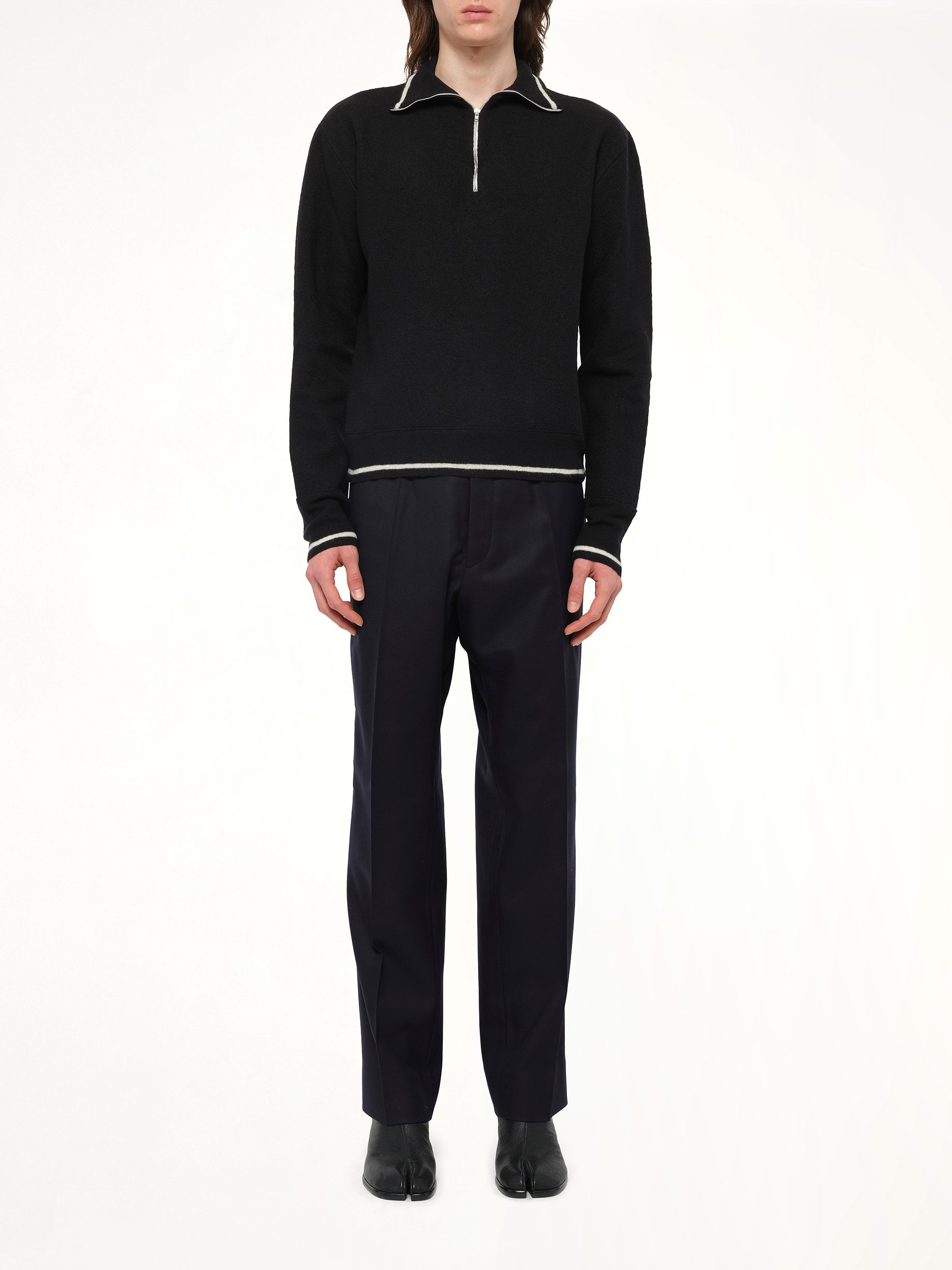 Maison Margiela's Gauge 14 Felted Zip Sweater in Black/Off White is a sophisticated blend of modern design and timeless style. This sweater features a unique felted texture and a versatile zip closure, making it a standout piece for any wardrobe.