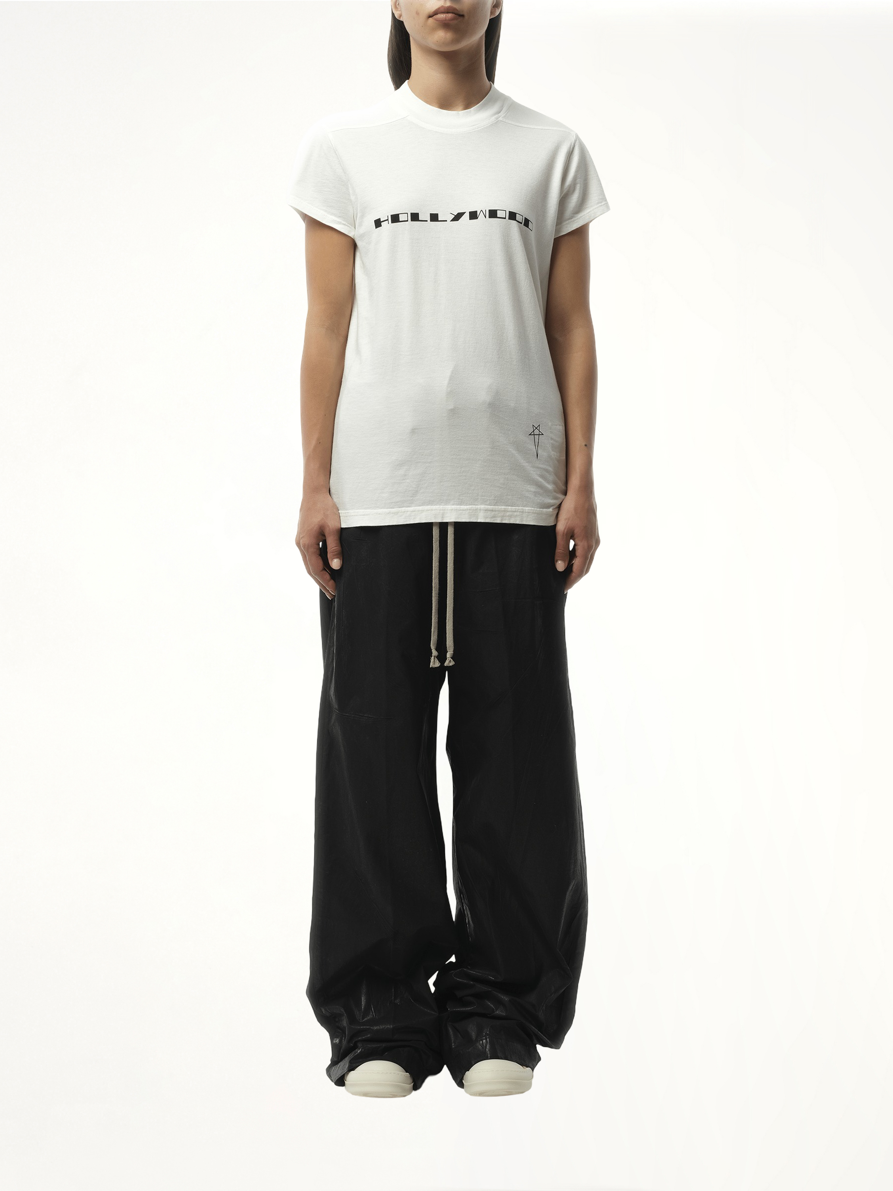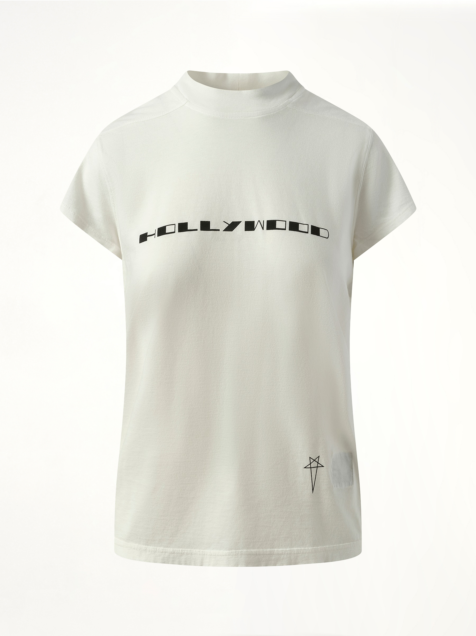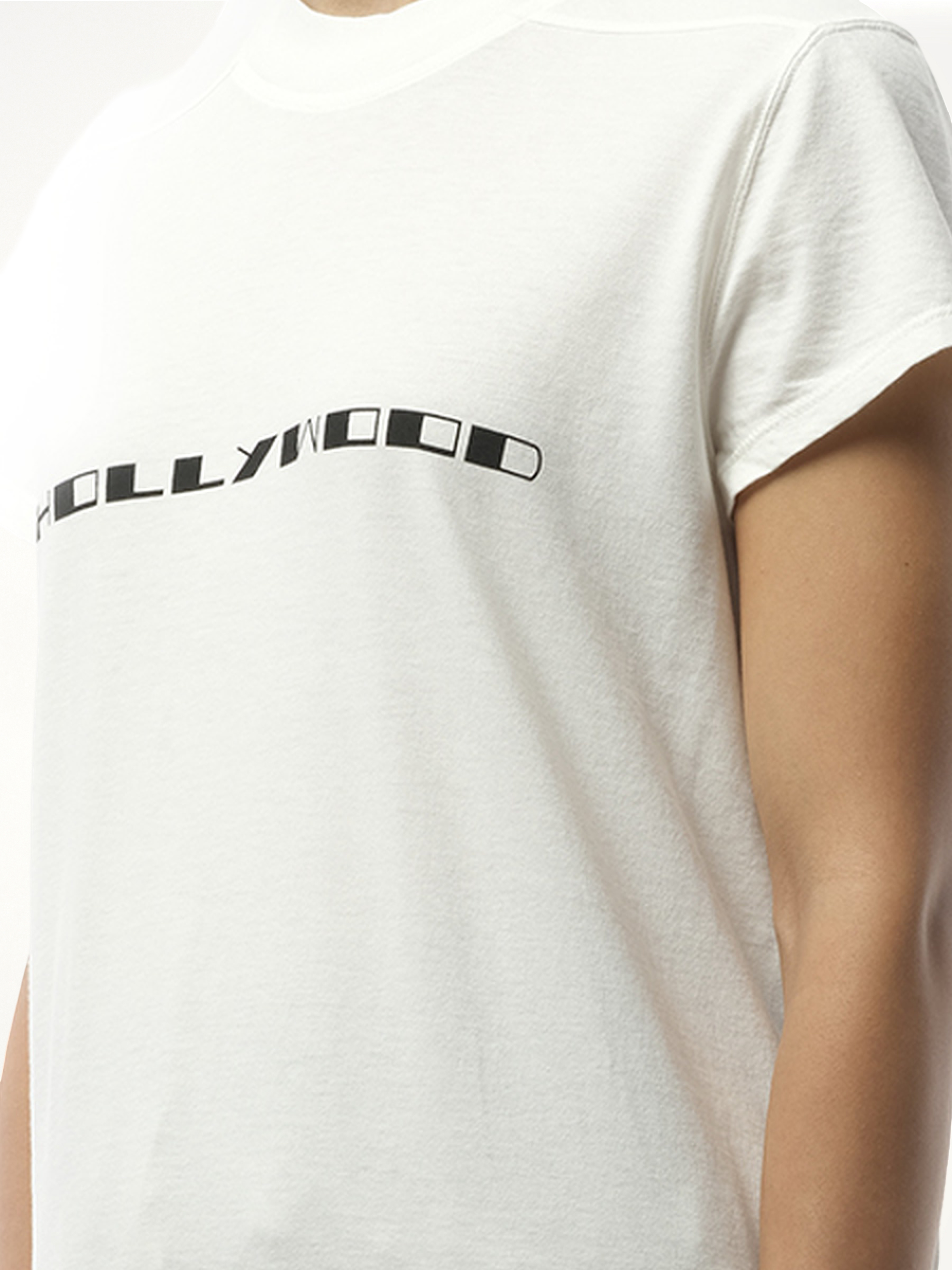 Rick Owens DRKSHDW Hollywood Small Level T in Milk/Black, a contemporary cropped T-shirt crafted from organic cotton jersey. It features a unique garment-dyed finish and signature front level shoulder seams for a bold look.