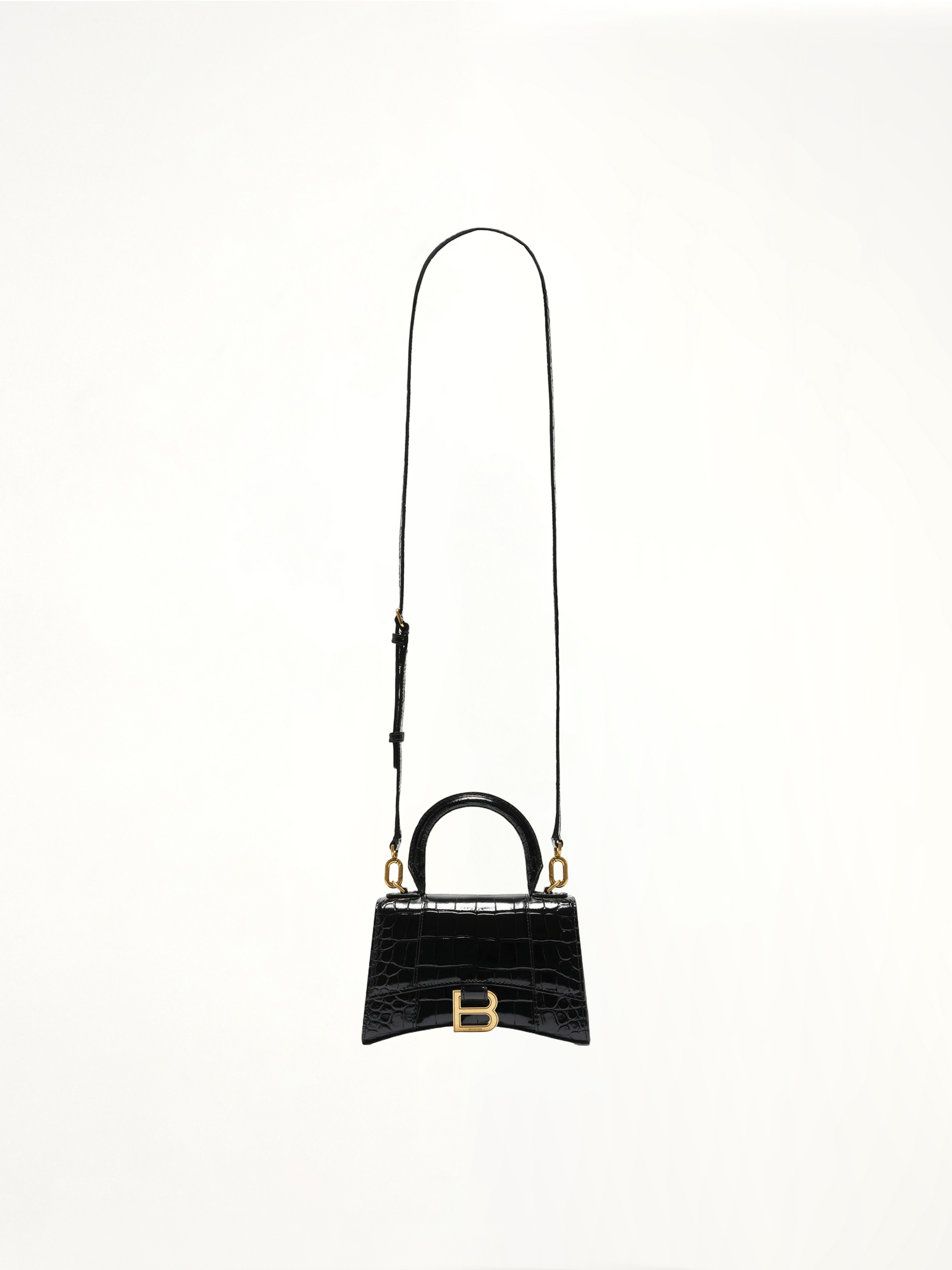 Hourglass XS croco embossed bag in black with gold-tone logo plaque, single rounded top handle, adjustable detachable shoulder strap and fold over top with magnetic fastening This bag marries timeless style with modern convenience, so you can make a statement wherever you go.