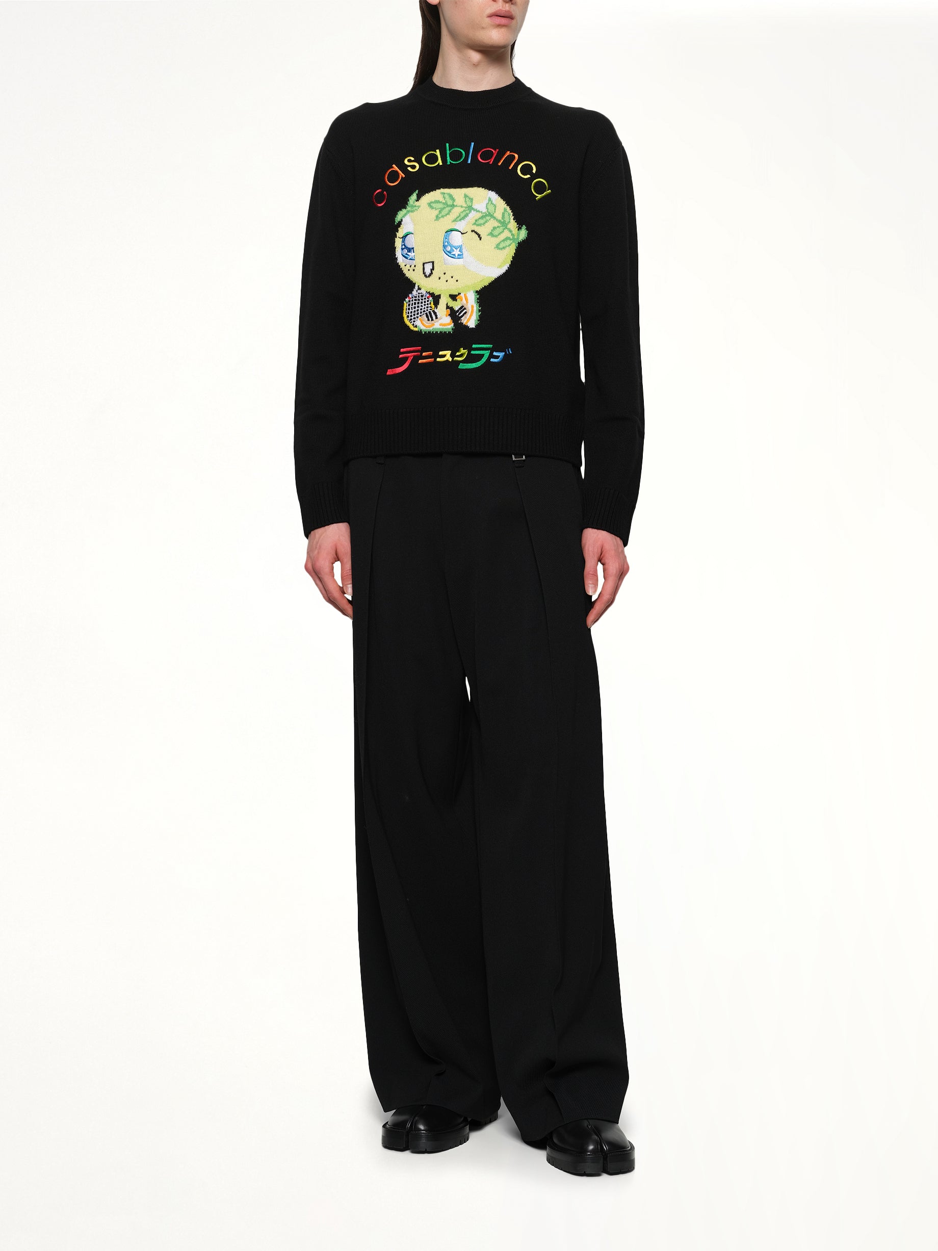 Casablanca's Kawaii Tennis Boy Knit Sweater in Black is a playful and stylish addition to any wardrobe. Featuring a unique tennis-themed design, this sweater combines comfort with a touch of whimsy.
