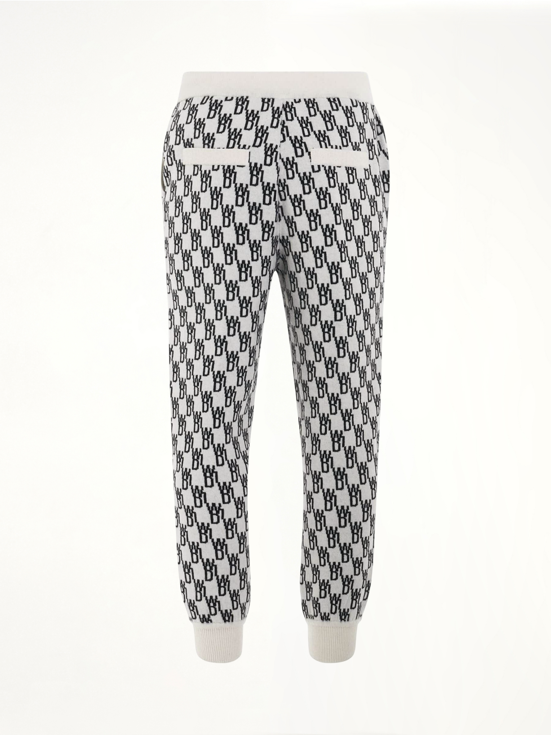 All over monogram intarsia-knit track pants featuring in ivory with wool blend, elasticated waistband and two side slip pockets, elasticated ankles at the end.