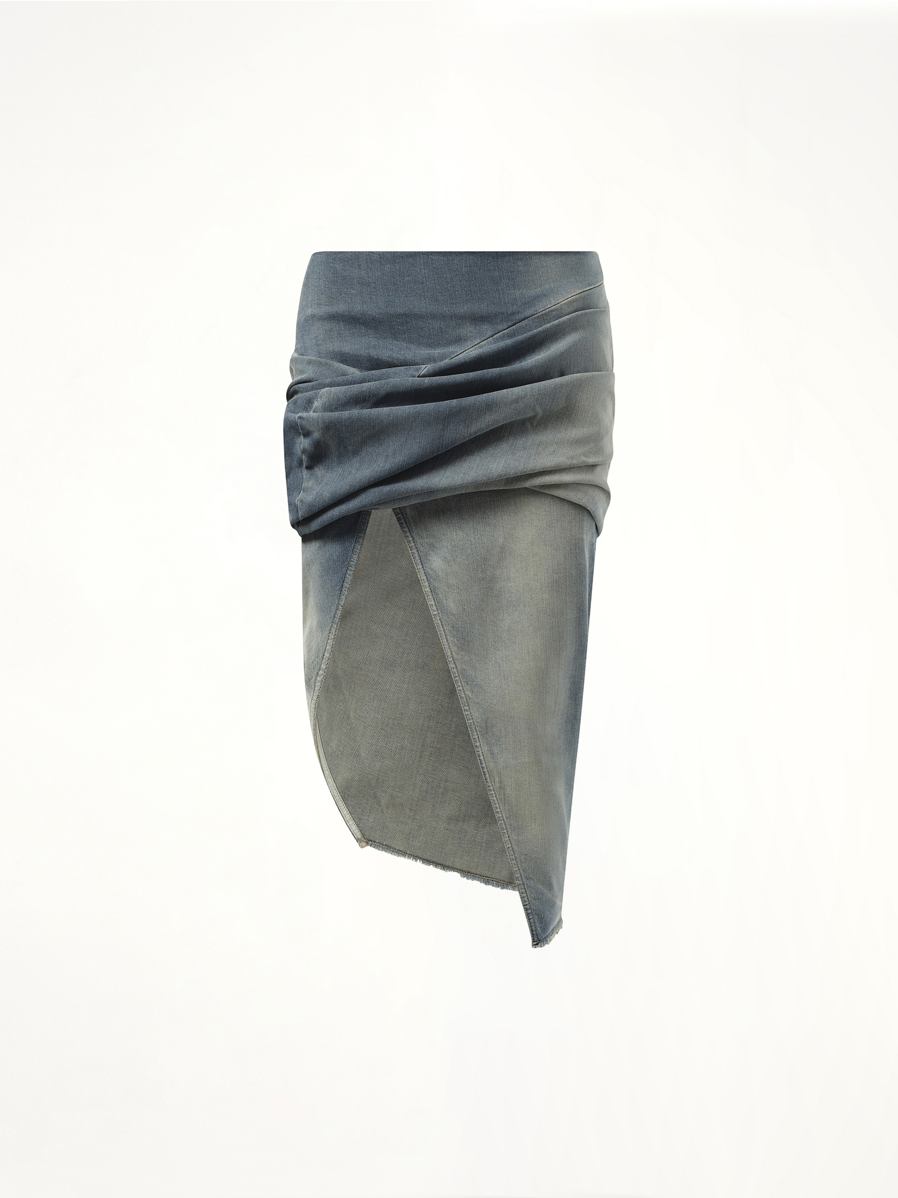 Rick Owens DRKSHDW Low Twist Skirt in Washed Indigo, a unique piece with an asymmetrical over-layer design that drapes from the back to the right thigh, creating a sculptural silhouette. Made from washed indigo stretch denim, this skirt offers a contemporary twist on classic denim.