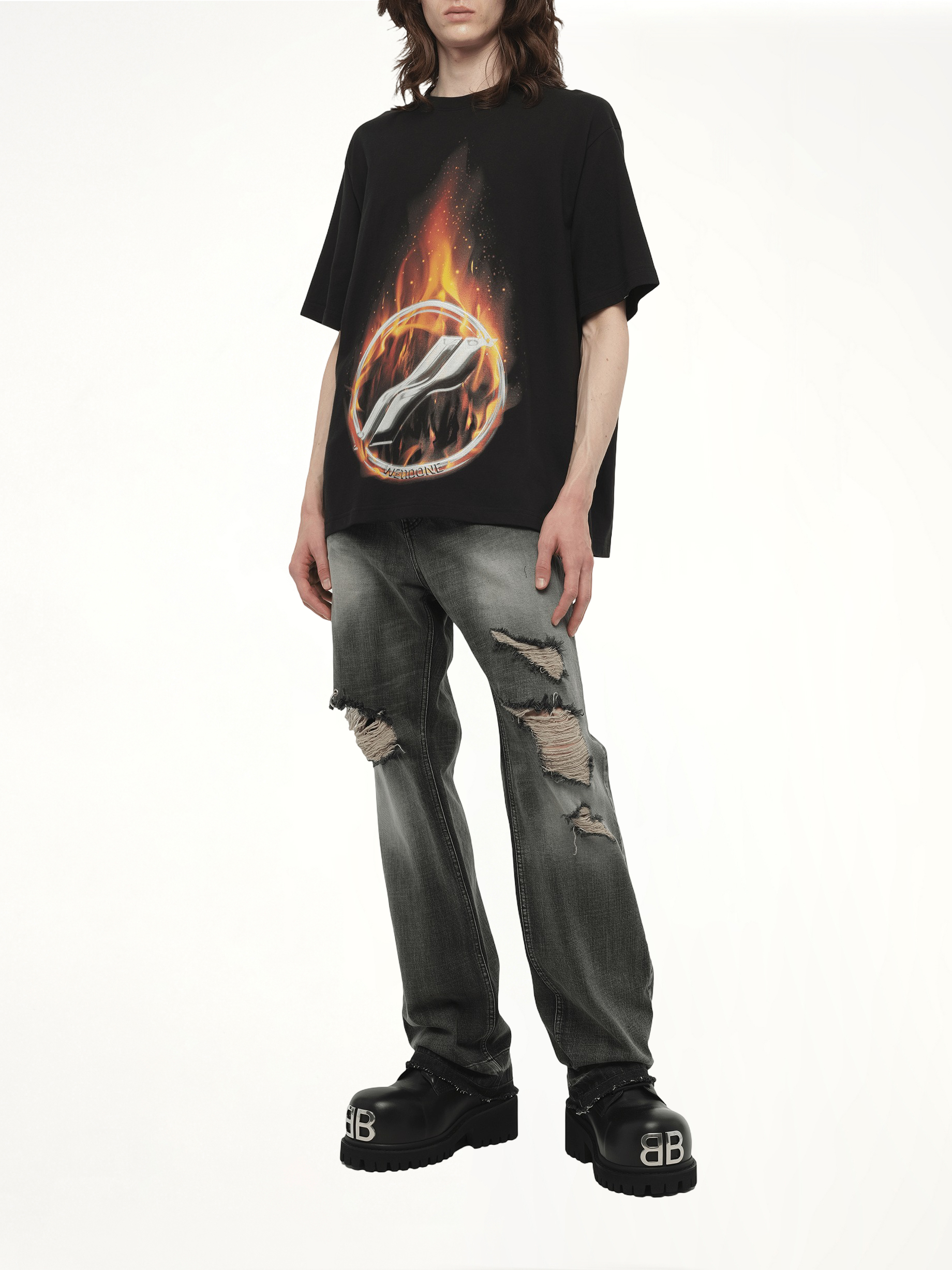 WE11DONE's Meteor Print T-Shirt in Black is a striking piece that combines contemporary design with a bold graphic print. Perfect for making a statement, this t-shirt is a must-have for any modern wardrobe.