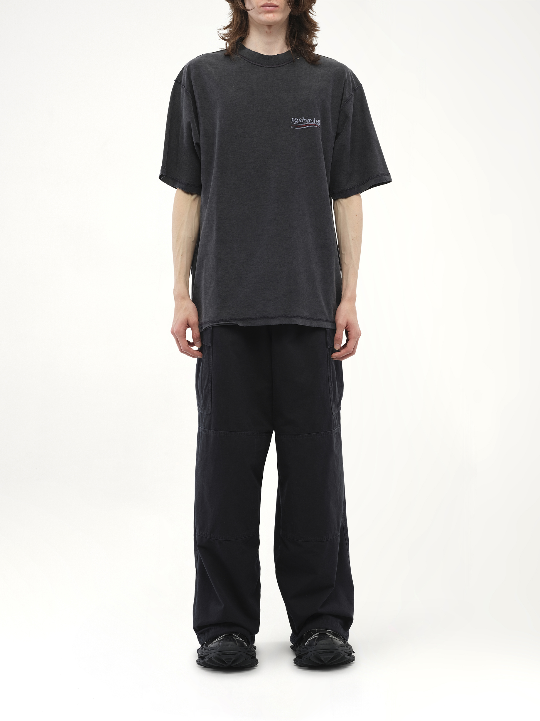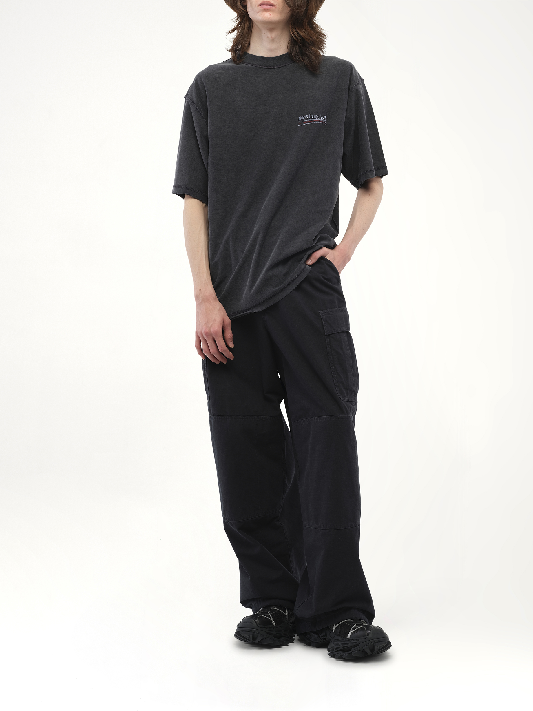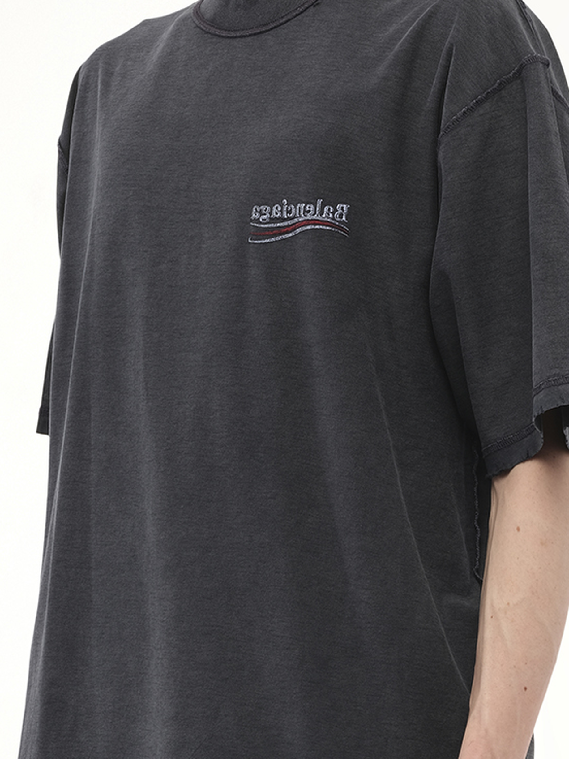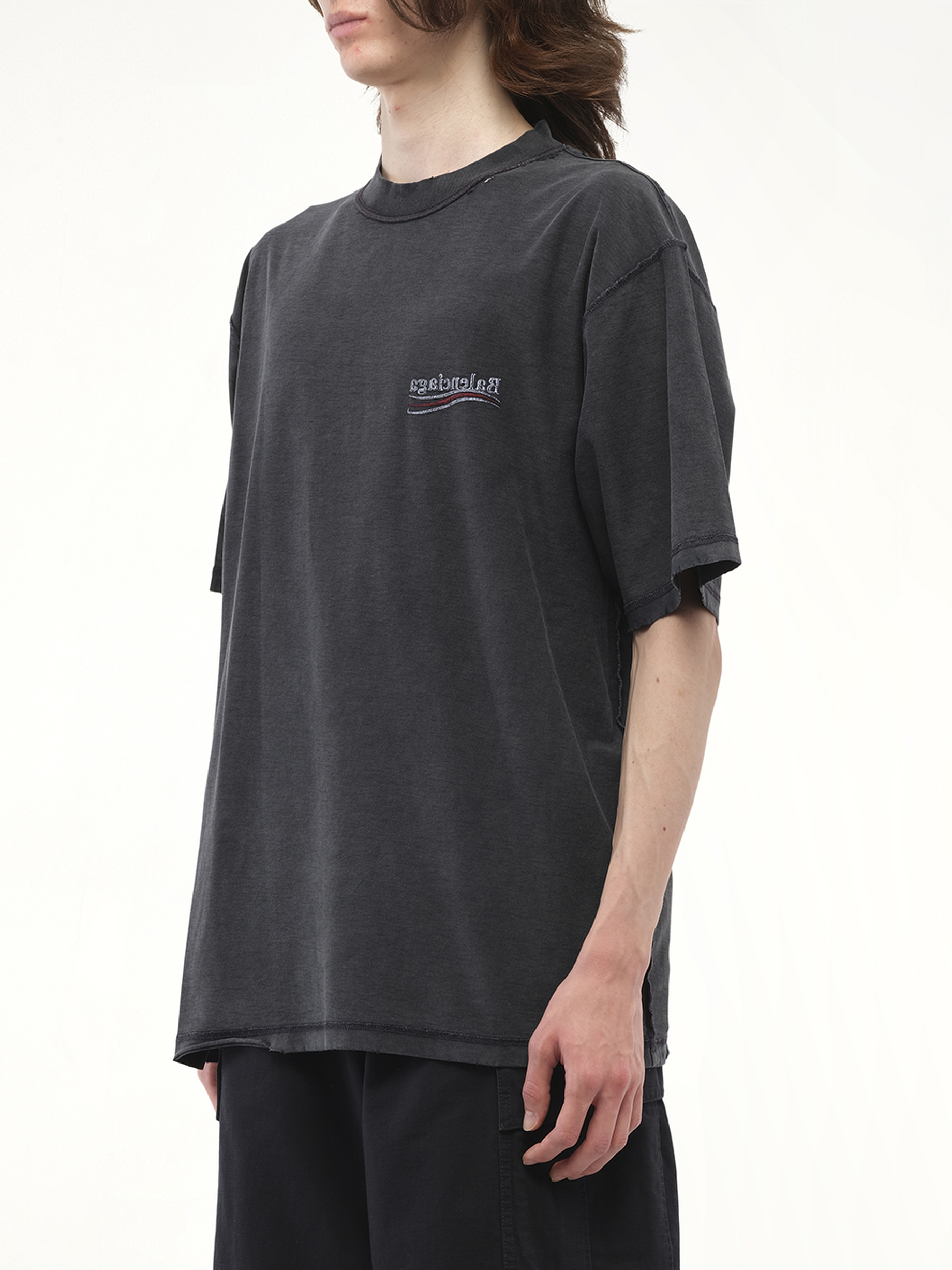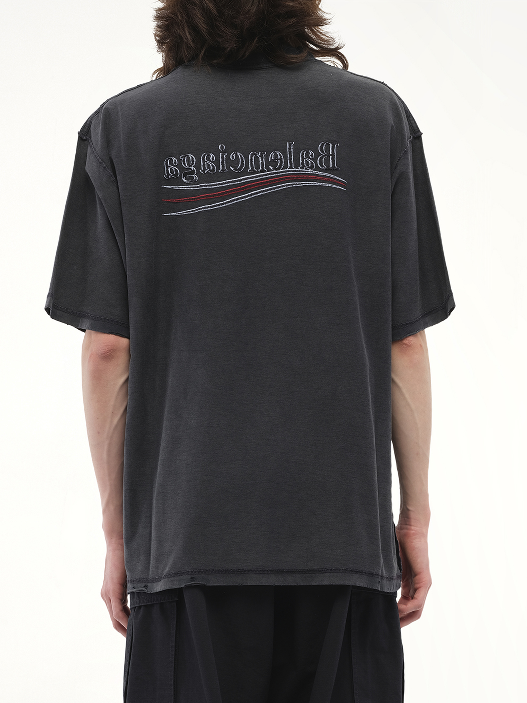 Balenciaga's Political Inside-Out Large T-Shirt in Black/White/Red is a bold statement piece that combines high fashion with a unique inside-out design. This eye-catching t-shirt is perfect for those who want to make a statement with their wardrobe.