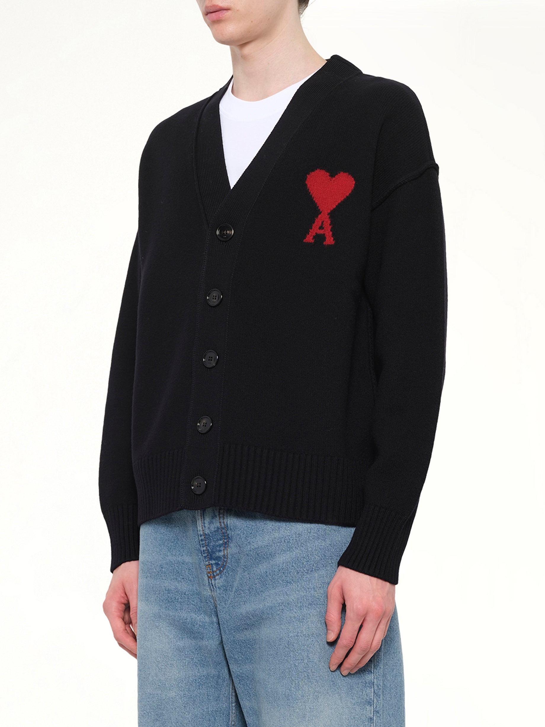 Ami Paris's Red Ami De Coeur Cardigan in Black is a stylish and versatile piece that adds a touch of sophistication to any wardrobe. This cardigan features a classic design with modern detailing, making it perfect for both casual and formal occasions.
