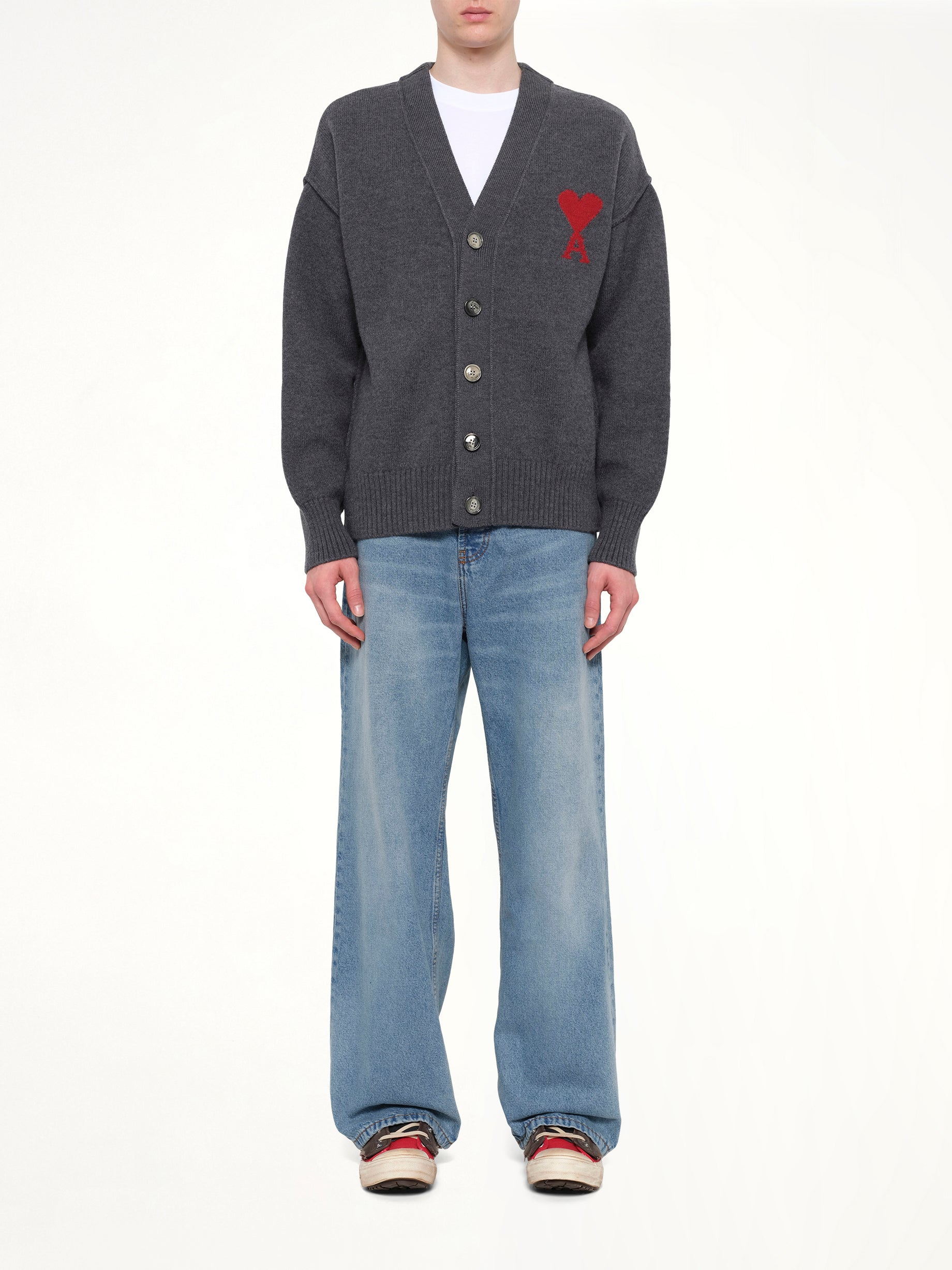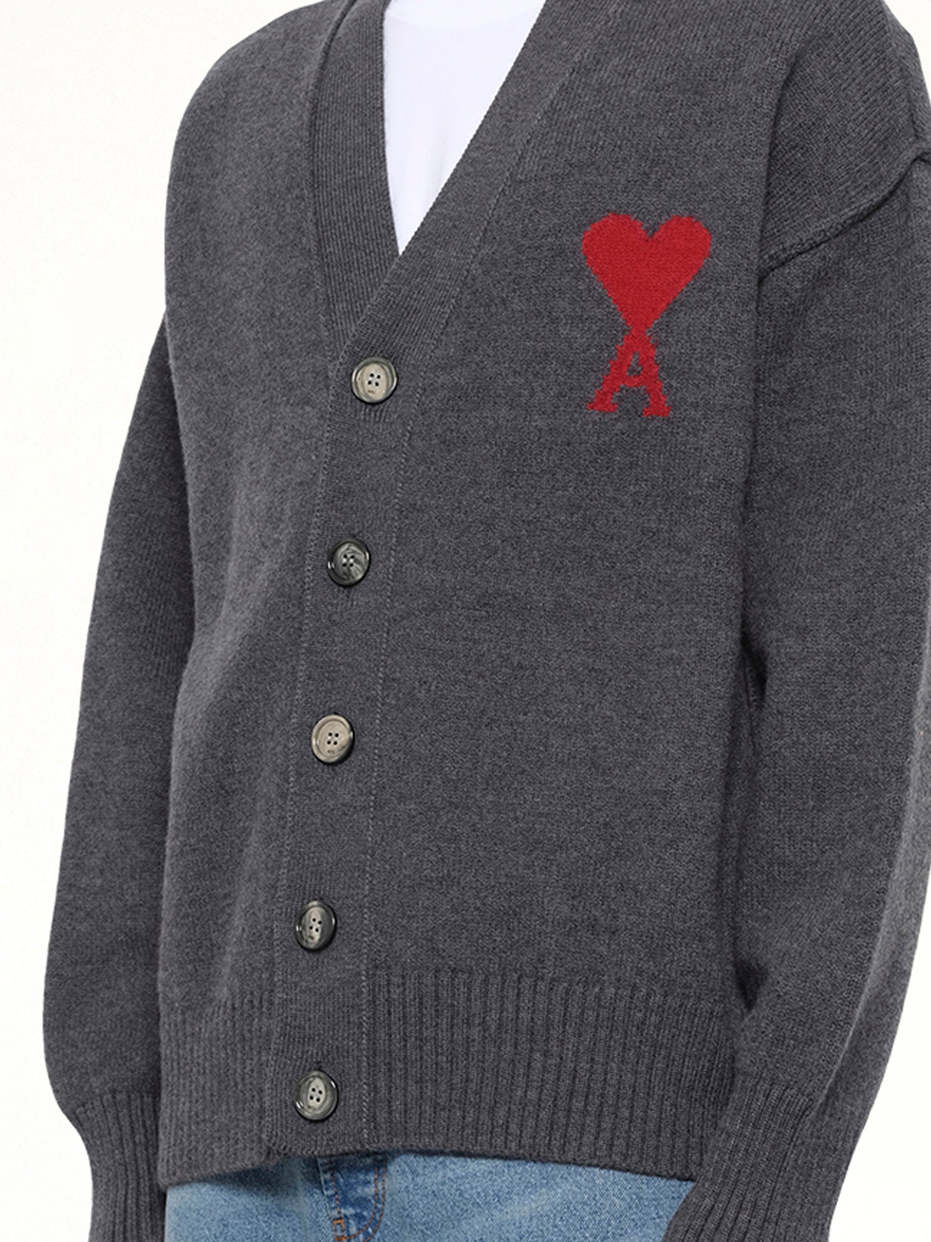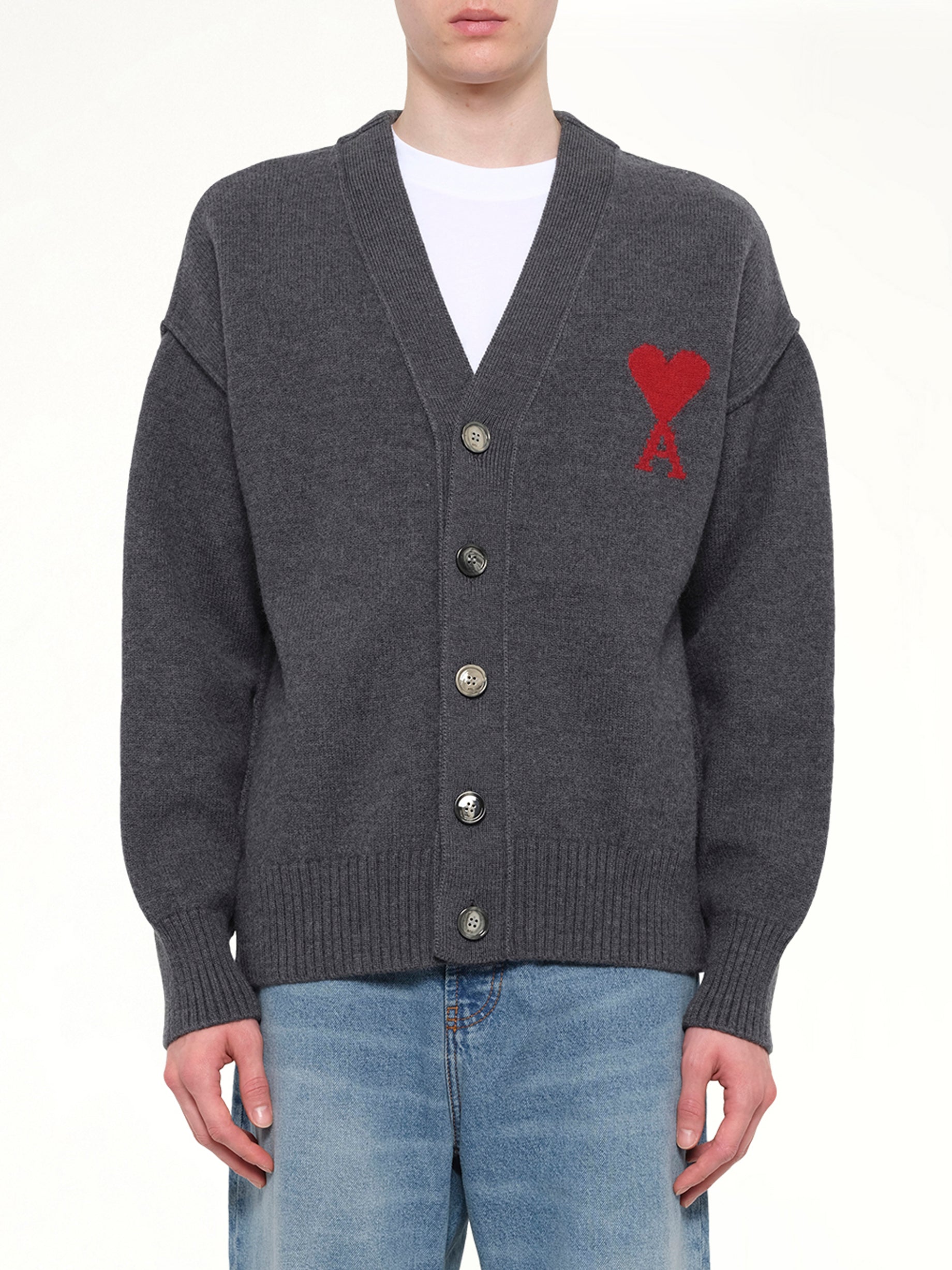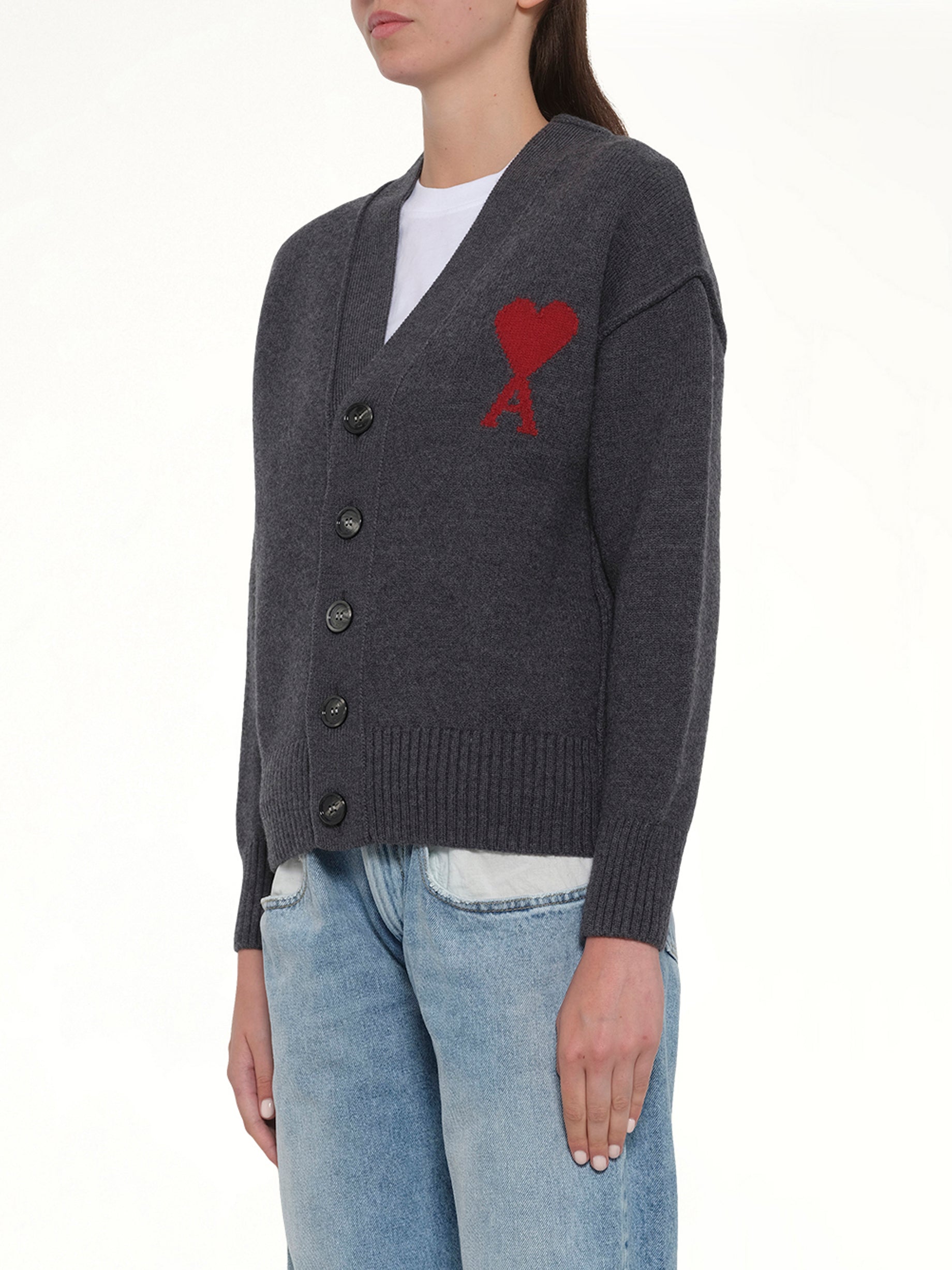 Ami Paris's Red Ami De Coeur Cardigan in Grey is a stylish and versatile piece that adds a touch of sophistication to any wardrobe. This cardigan features a classic design with modern detailing, making it perfect for both casual and formal occasions.