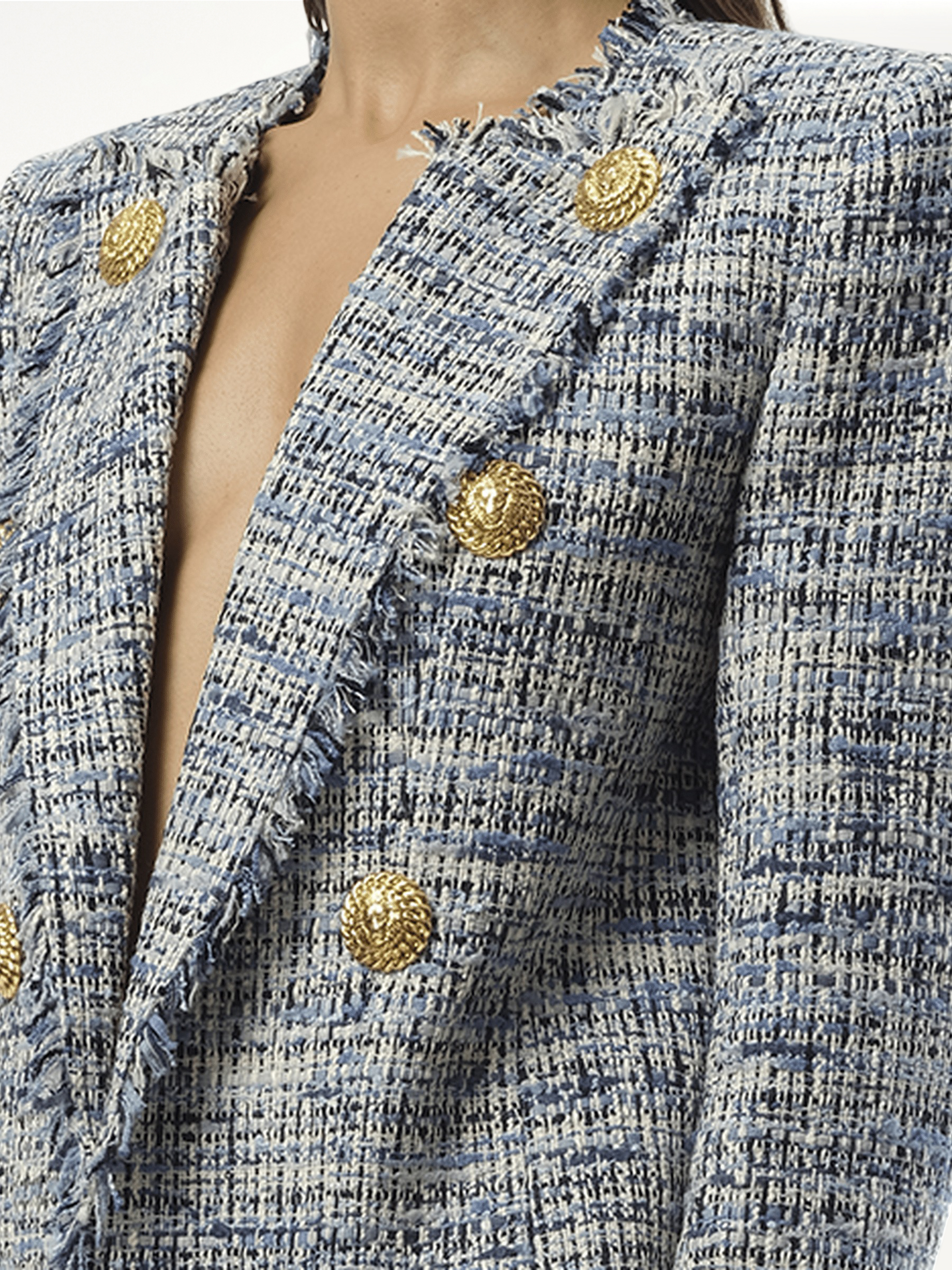 This blue tweed Spencer jacket features a unique side-to-side design, providing a sleek and modern look. The tweed material adds texture and sophistication, while the structure of the Spencer style offers a flattering fit. Elevate your wardrobe with this versatile and stylish jacket.