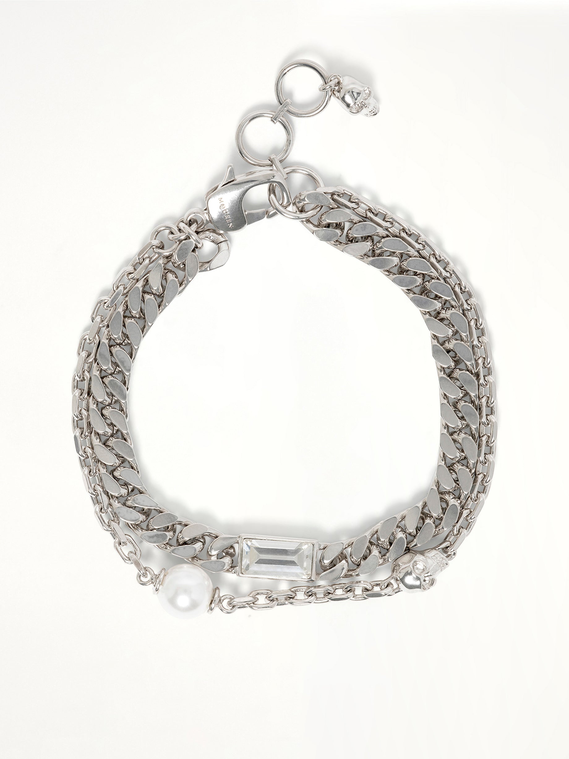 Alexander McQueen's Skull & Pearl Bracelet in Silver is a striking accessory that combines edgy design with classic elegance. This bracelet features the iconic skull motif paired with lustrous pearls, creating a unique and sophisticated look.