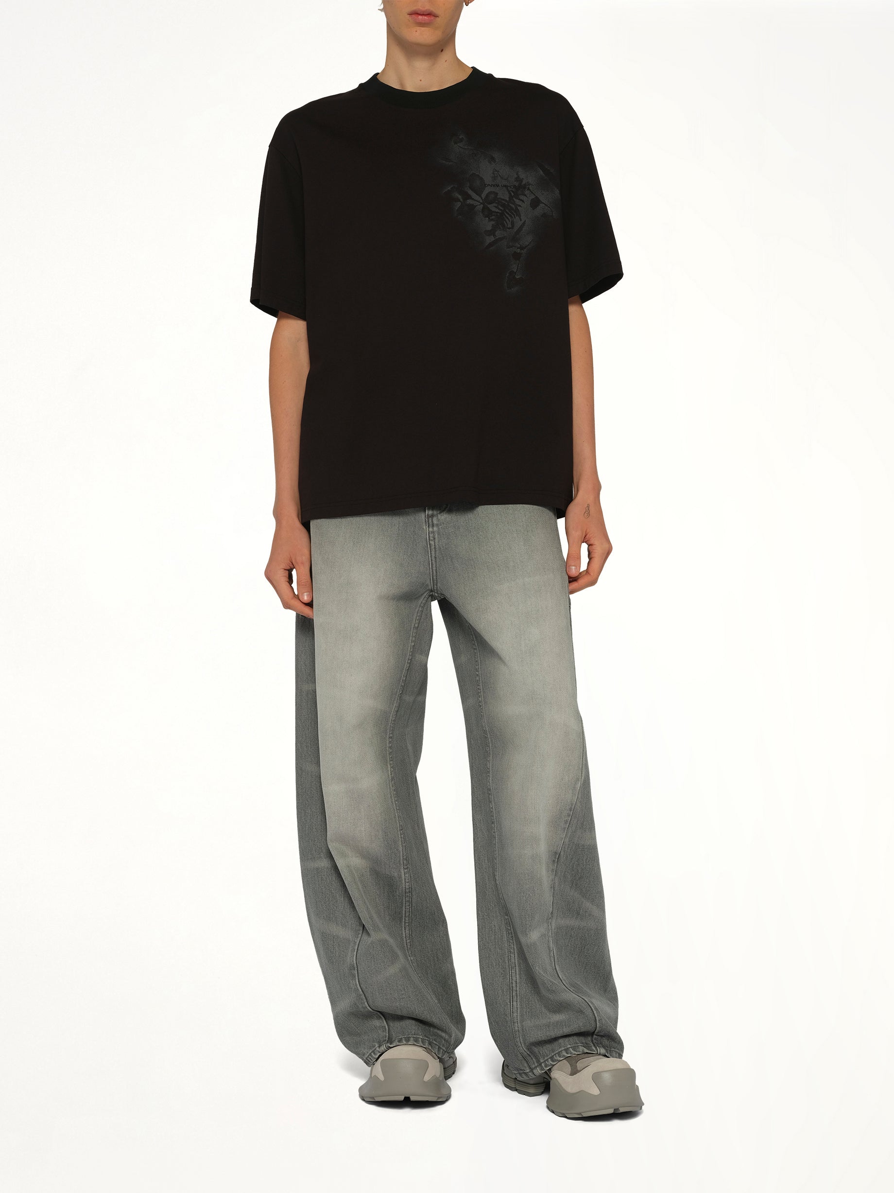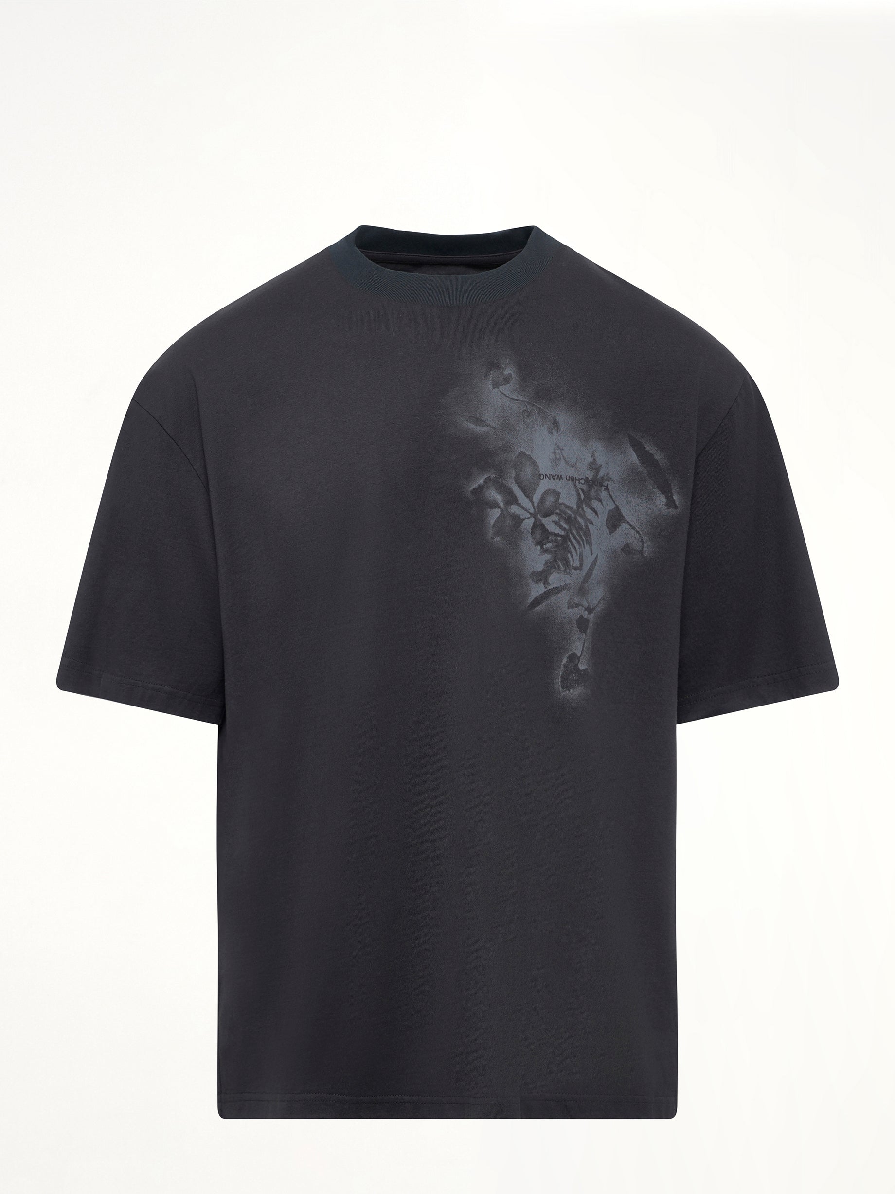 Feng Chen Wang's Spray Painted Plants Dye T-Shirt in Black is a unique piece that combines artistic flair with modern fashion. This t-shirt features a distinctive spray-painted design that adds a bold statement to any outfit.