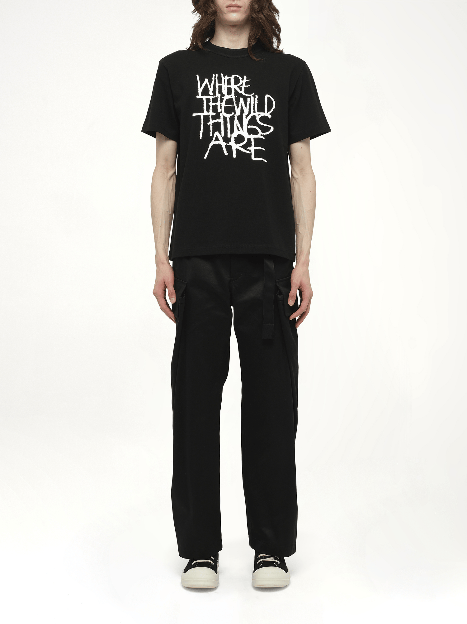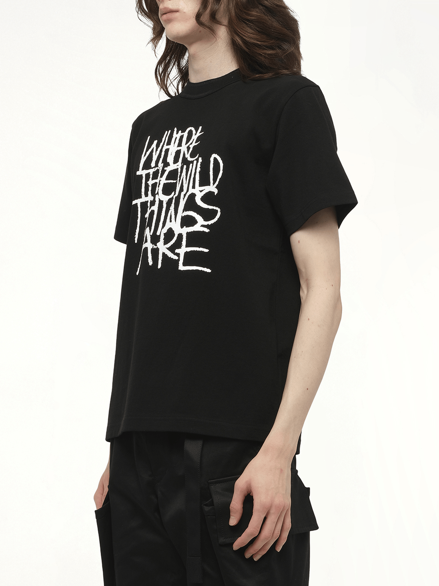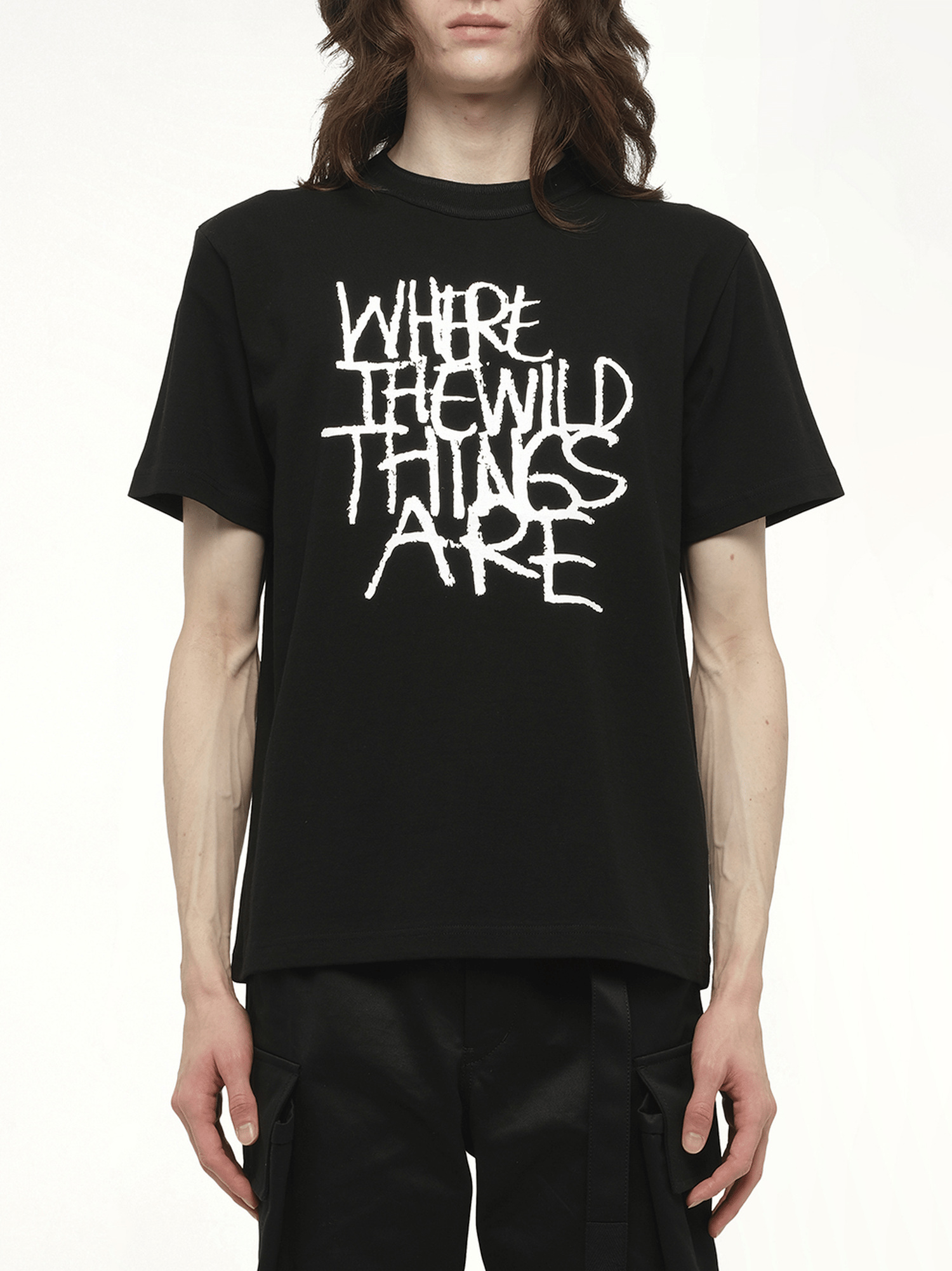 SACAI's WHERE THE WILD THINGS ARE Logo T-Shirt in Black is a stylish tribute to the beloved classic. This t-shirt combines contemporary fashion with nostalgic charm.