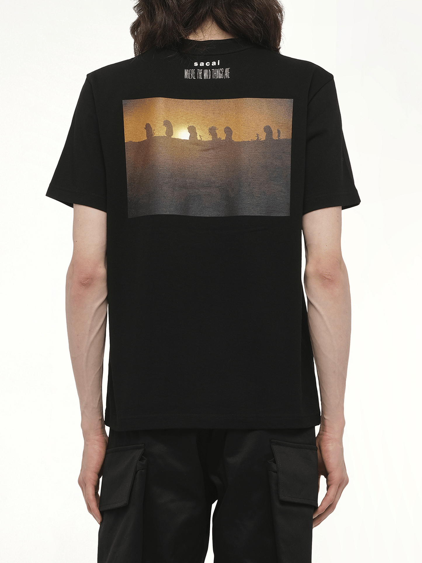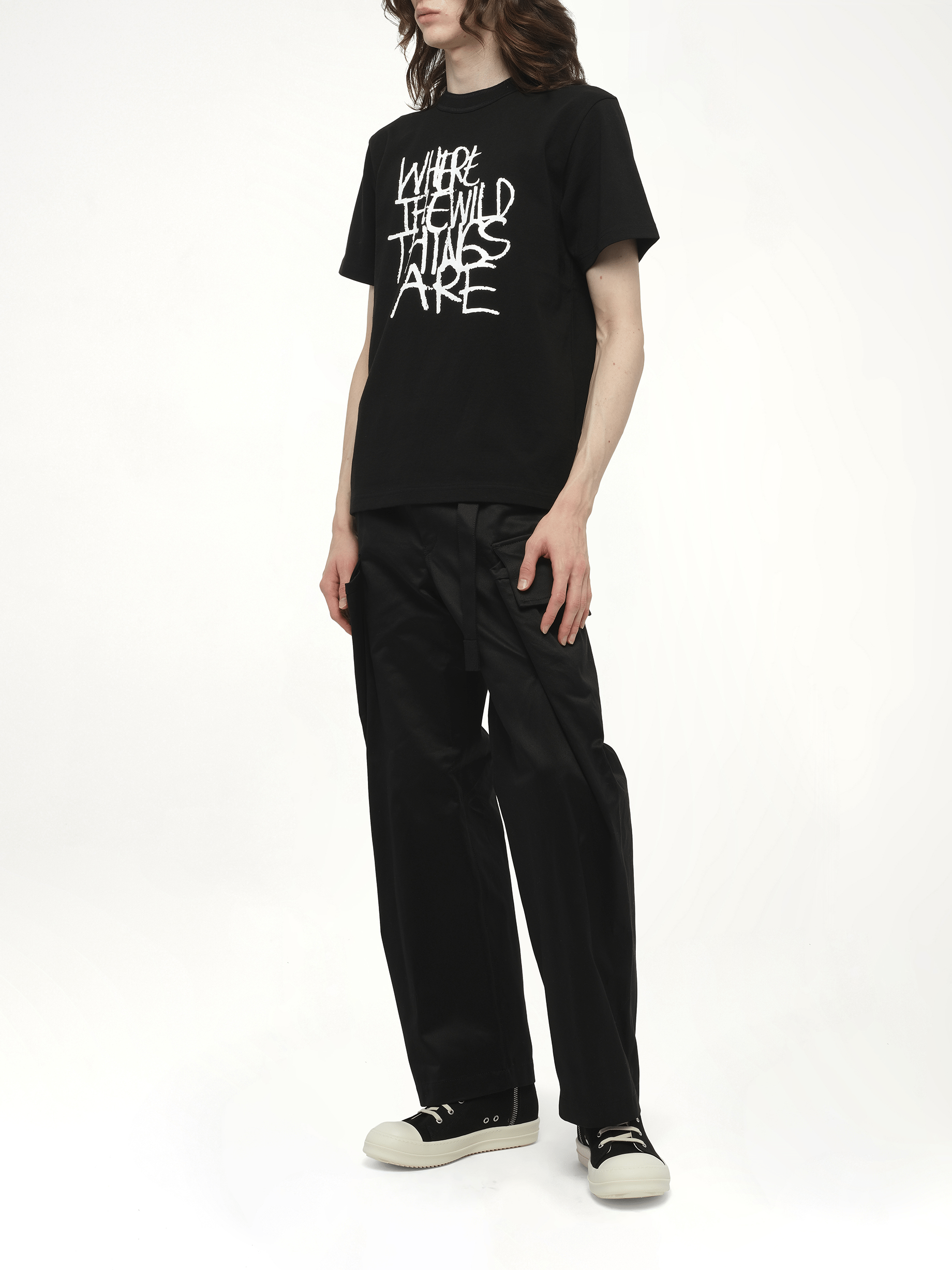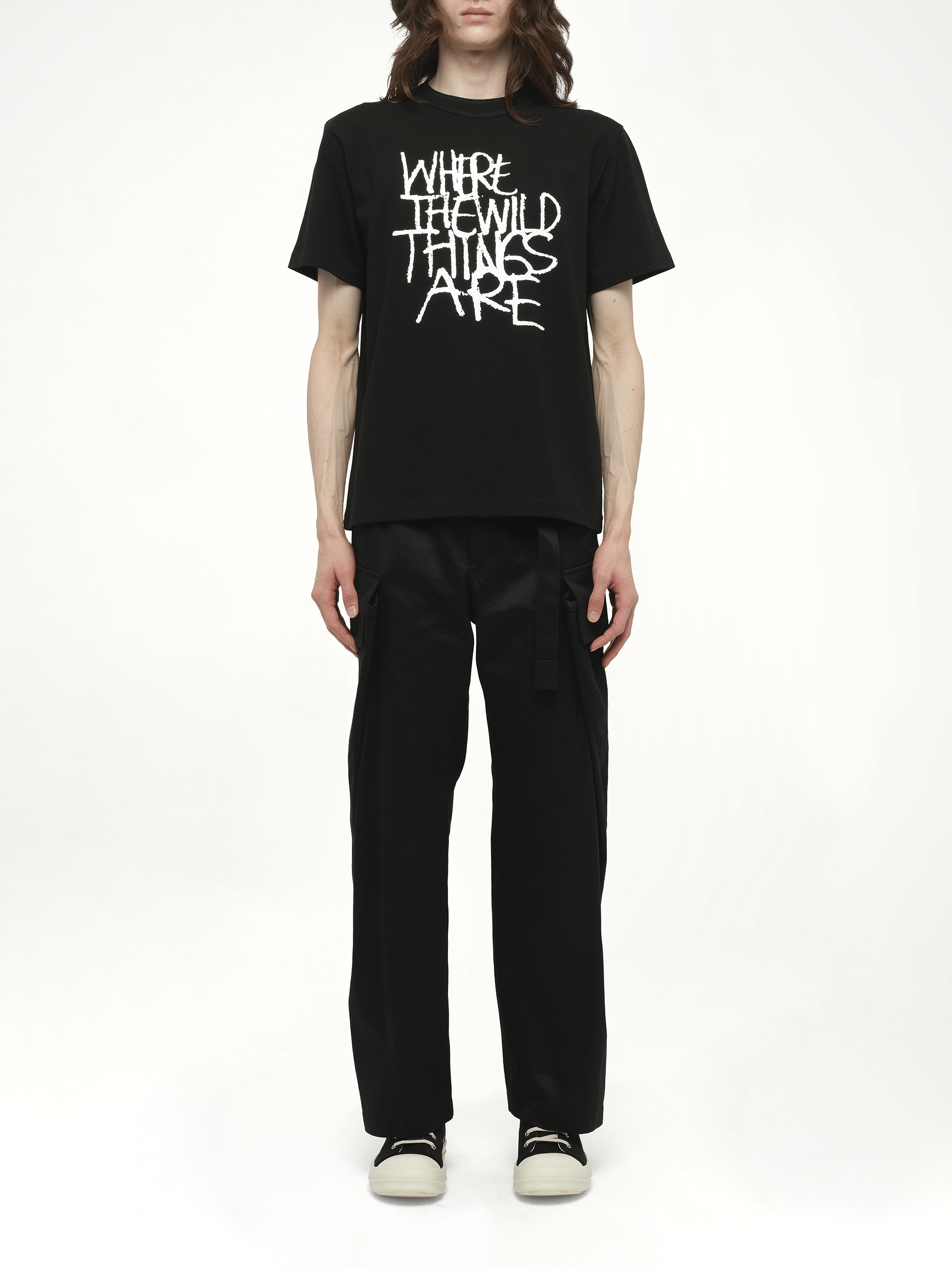 SACAI's WHERE THE WILD THINGS ARE Logo T-Shirt in Black is a stylish tribute to the beloved classic. This t-shirt combines contemporary fashion with nostalgic charm.