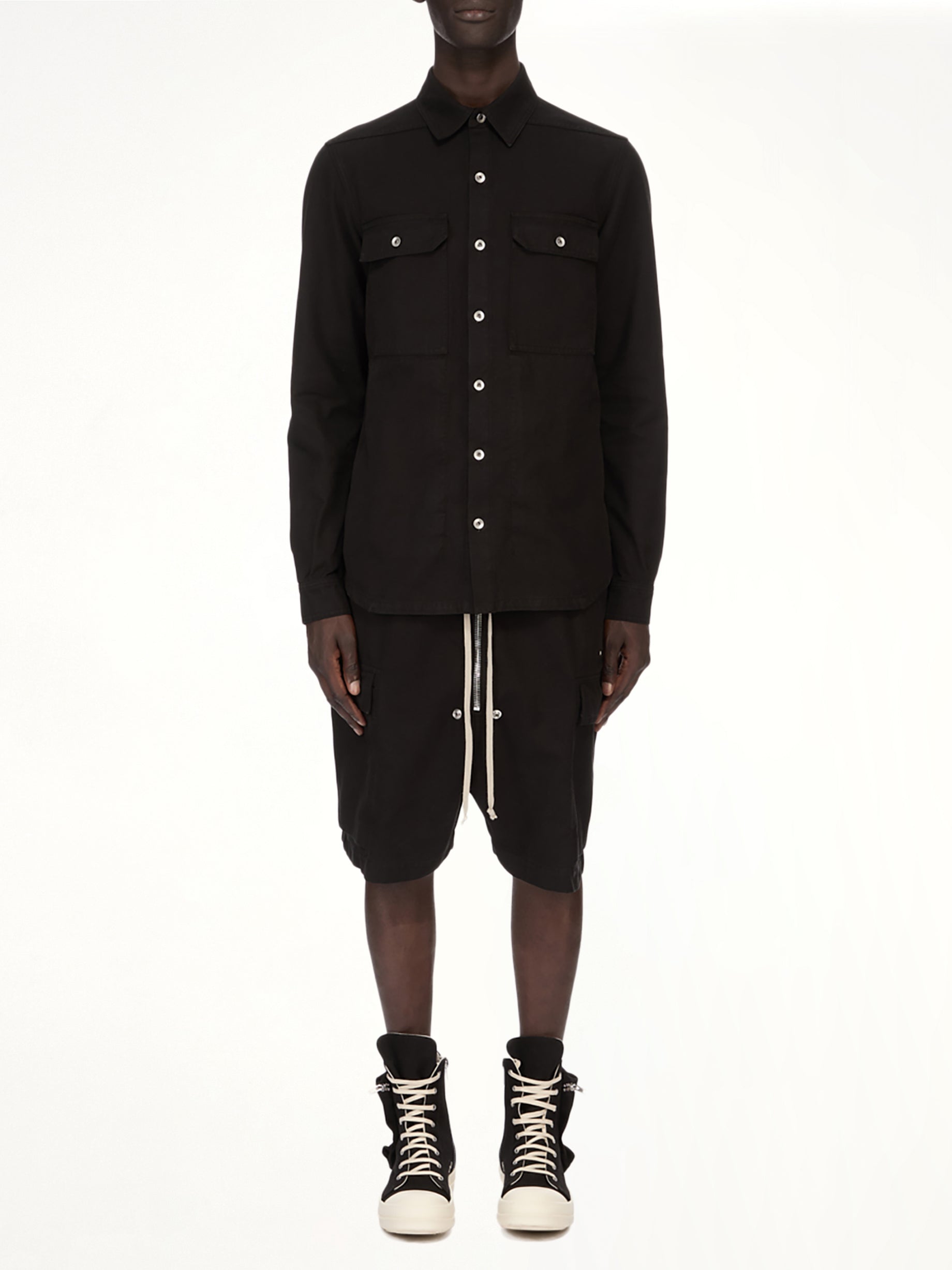 Rick Owens DRKSHDW's Woven Outershirt in Black is a versatile piece that combines contemporary style with functionality. Its sleek design and attention to detail make it a standout addition to any wardrobe.